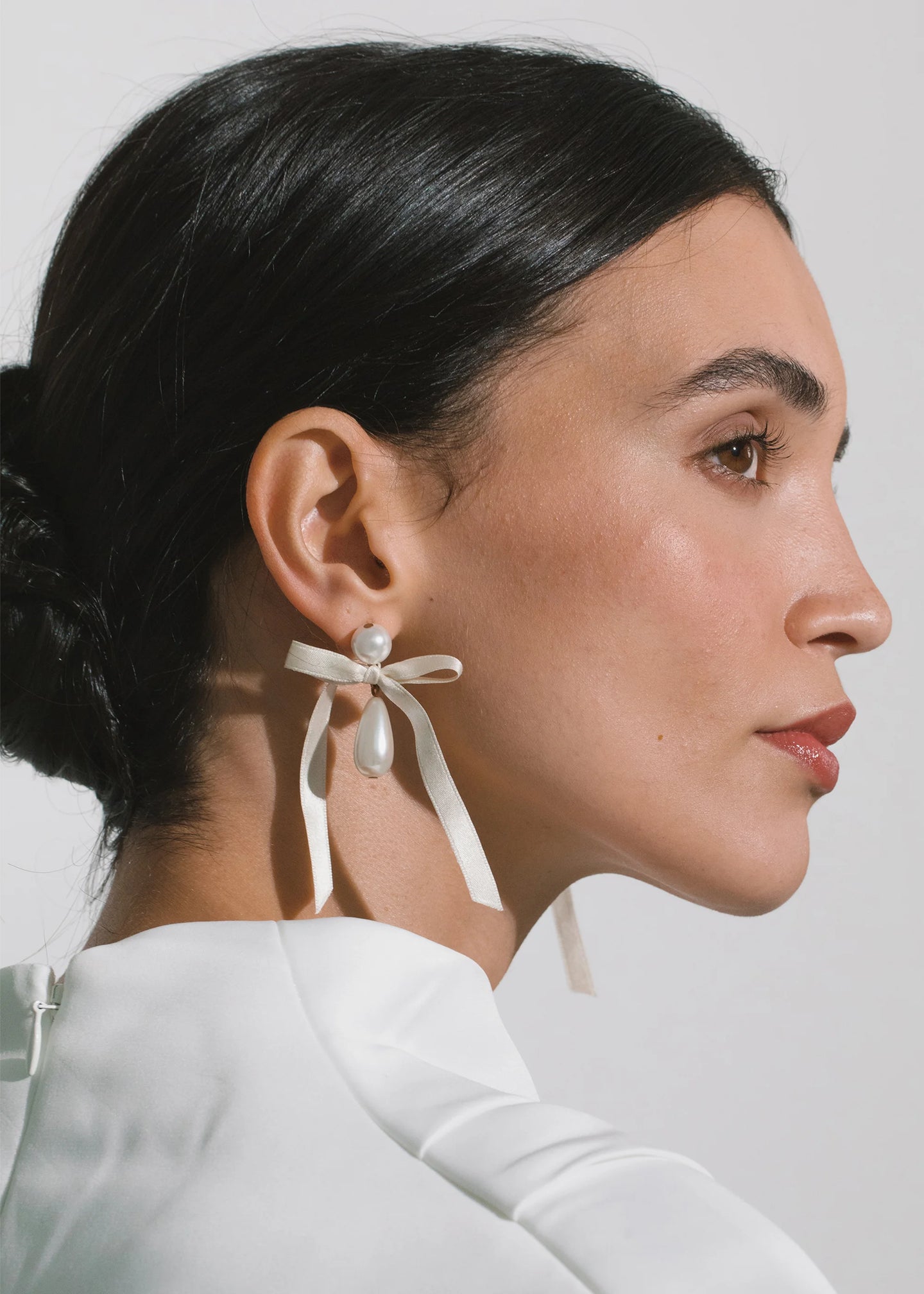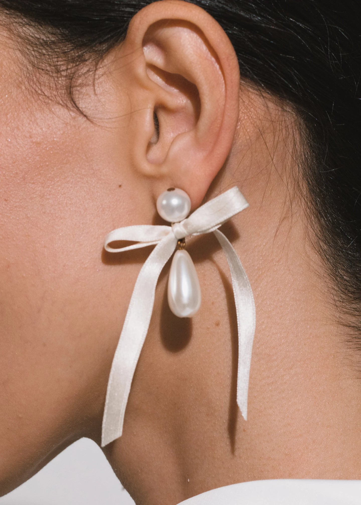 The darling Sylvie Earrings feature classic elongated pearl drops, wrapped in a cheeky ribbon. These mood-boosting bows add a coquettish touch to even the simplest looks. The drop's swinging and the ribbon's fluttering unite to create alluring motion with your every turn.