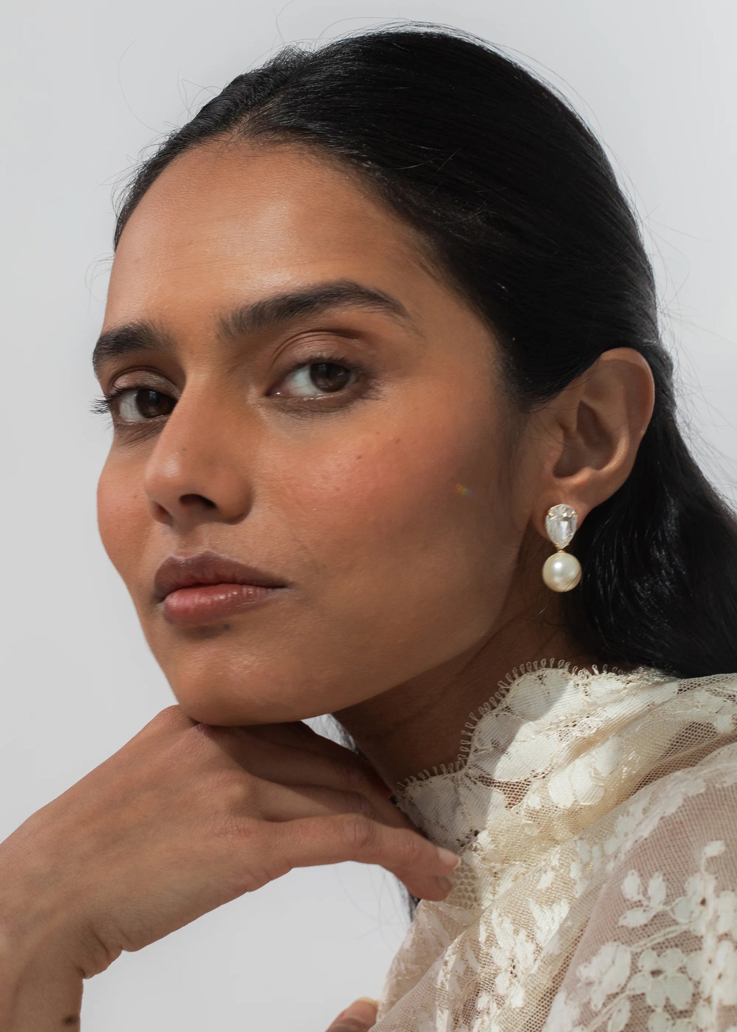 Stunning in their simplicity, the Cimone Earrings are a fresh take on a classic drop earring, fit for any occasion. Made by hand in New York, they feature a pear-cut Austrian crystals, with crystal pearl drops. Their petite size and layered materials allow these earrings to pair perfectly with a wide array of jewelry and hair accessories from our collection. Dimensions: 1 1/4in x 7/8in