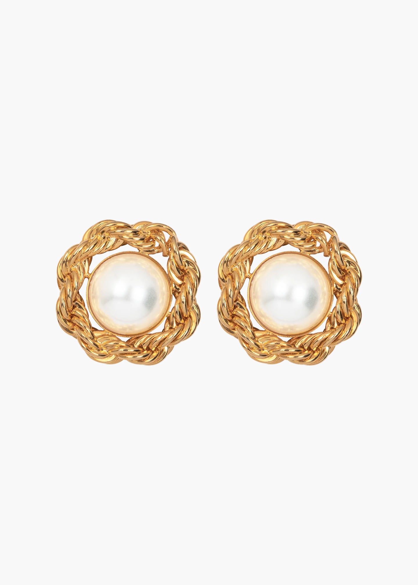 Inspired by the popularity of our classic Caryann Earrings, the Careena Earrings are the most wearable of finishing touches, elevating any look, whether dressed up or down. Made by hand in New York, each chain is wrapped by hand around an Austrian crystal pearl, a process that allows for considerably richer detail than casting. Drawing inspiration from vintage button earrings of the 1980s, these studs channel that same effortless glamour. Dimensions: 7/8in x 7/8in