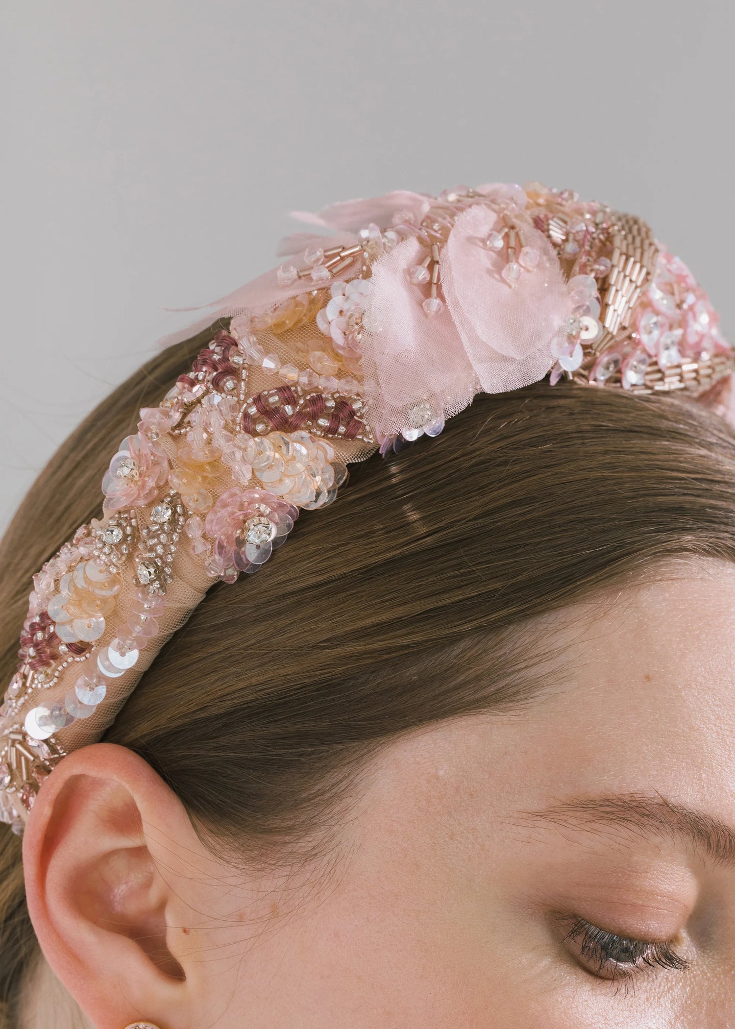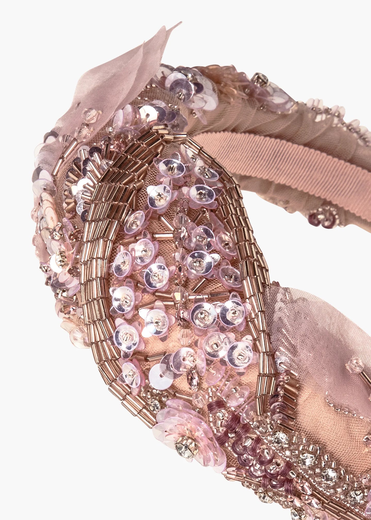 The Miriana Headband is made in New York of hand-embroidered silk organza floral motifs and sequin beads on a hand-draped tulle base, and lined in grosgrain ribbon to ensure ultimate comfort and promote hair health. We recommend treating this headband as you would a piece of jewelry, and storing it in the dust bag when not in use. Avoid contact with water, perfume, and other chemicals, including hairspray, which should be used before placement in the hair.