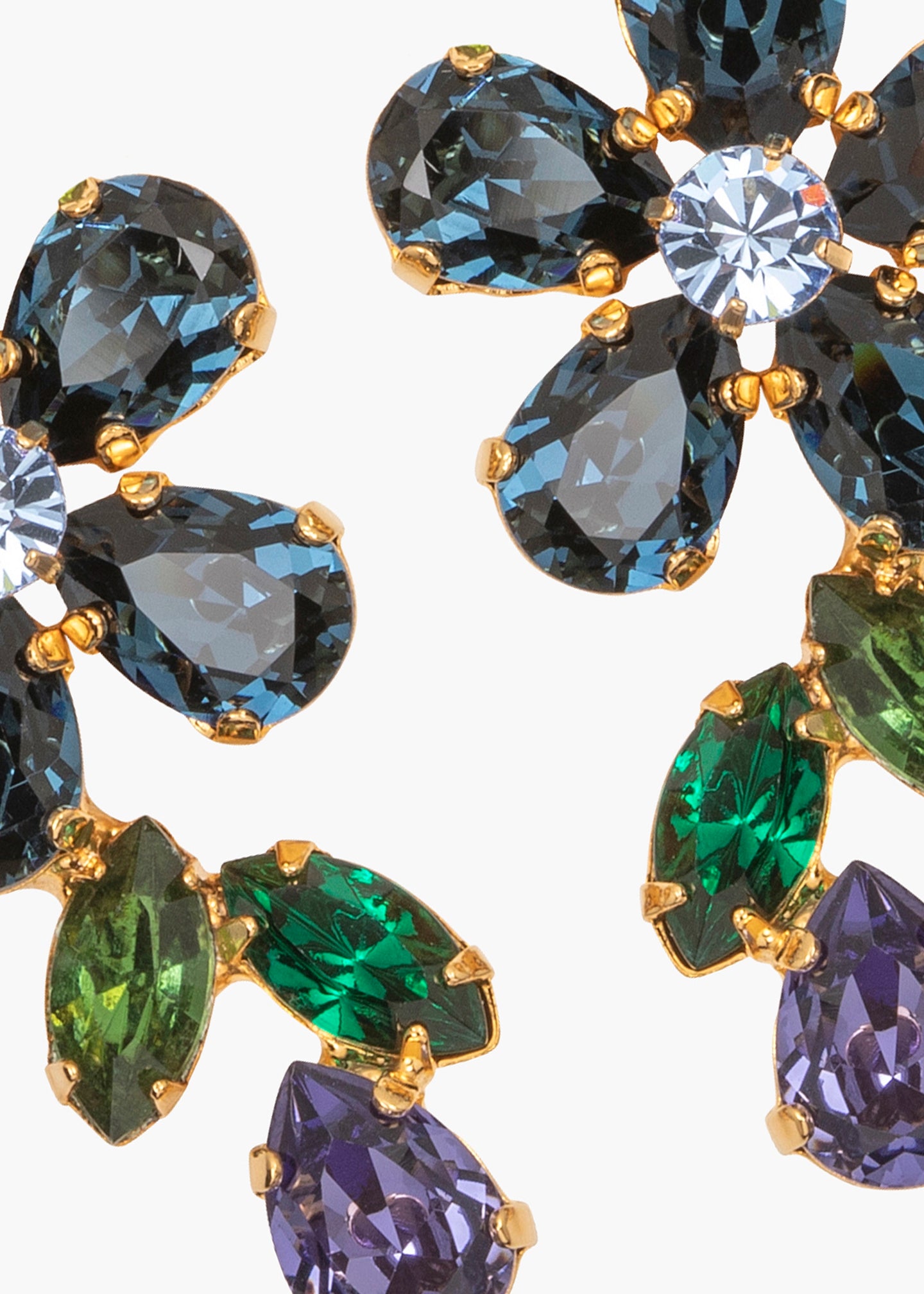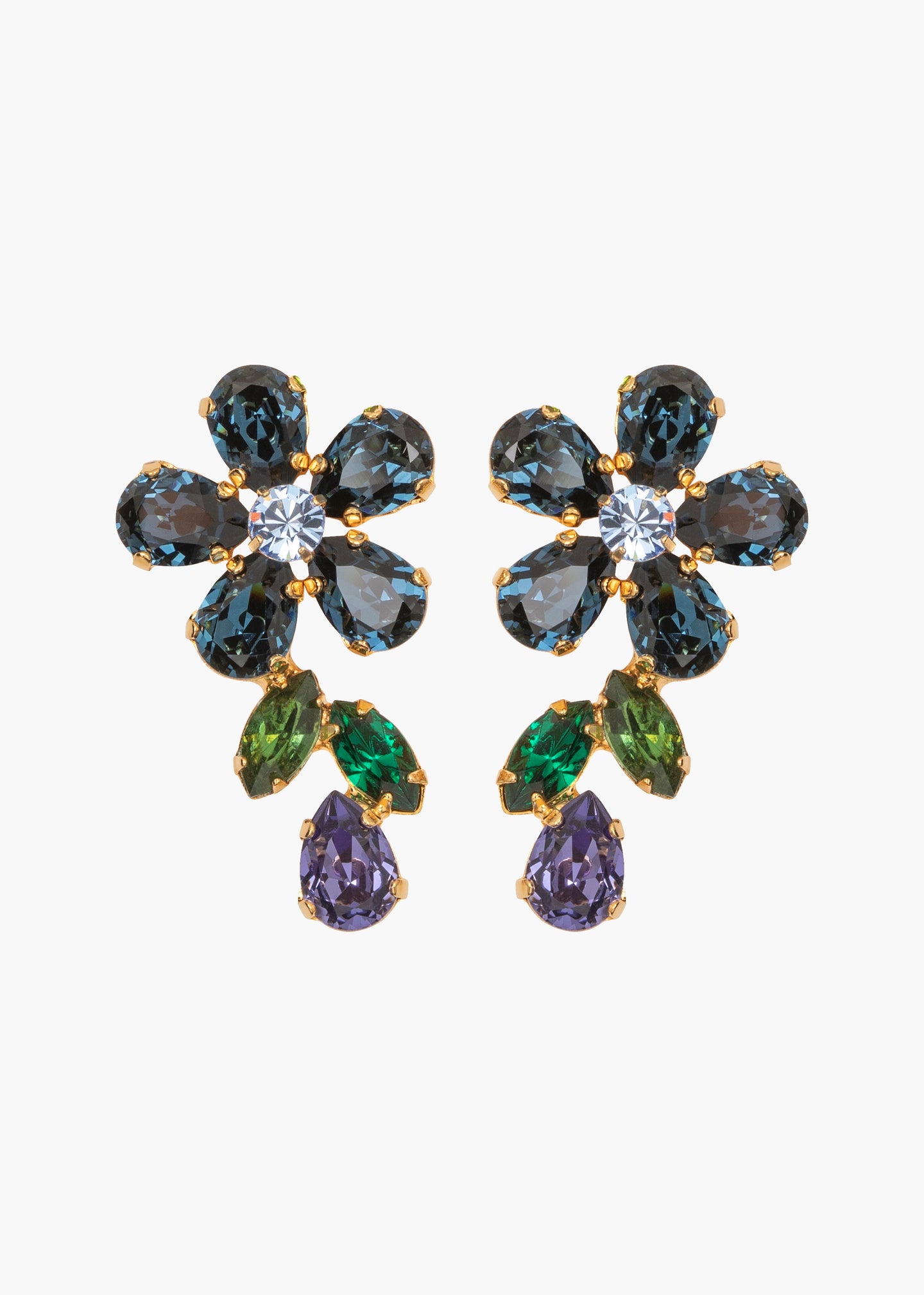 An addition to our iconic collection of crystal flower earrings, the Odelia Earrings have the richly vivid palette of an Impressionist painting. Austrian crystals in an imaginative range of colors and cuts are lodged in an 18-karat gold-plated setting. Made by hand in New York, the placement of each individual stone is carefully considered in the design process, for a finished look that frames the face.