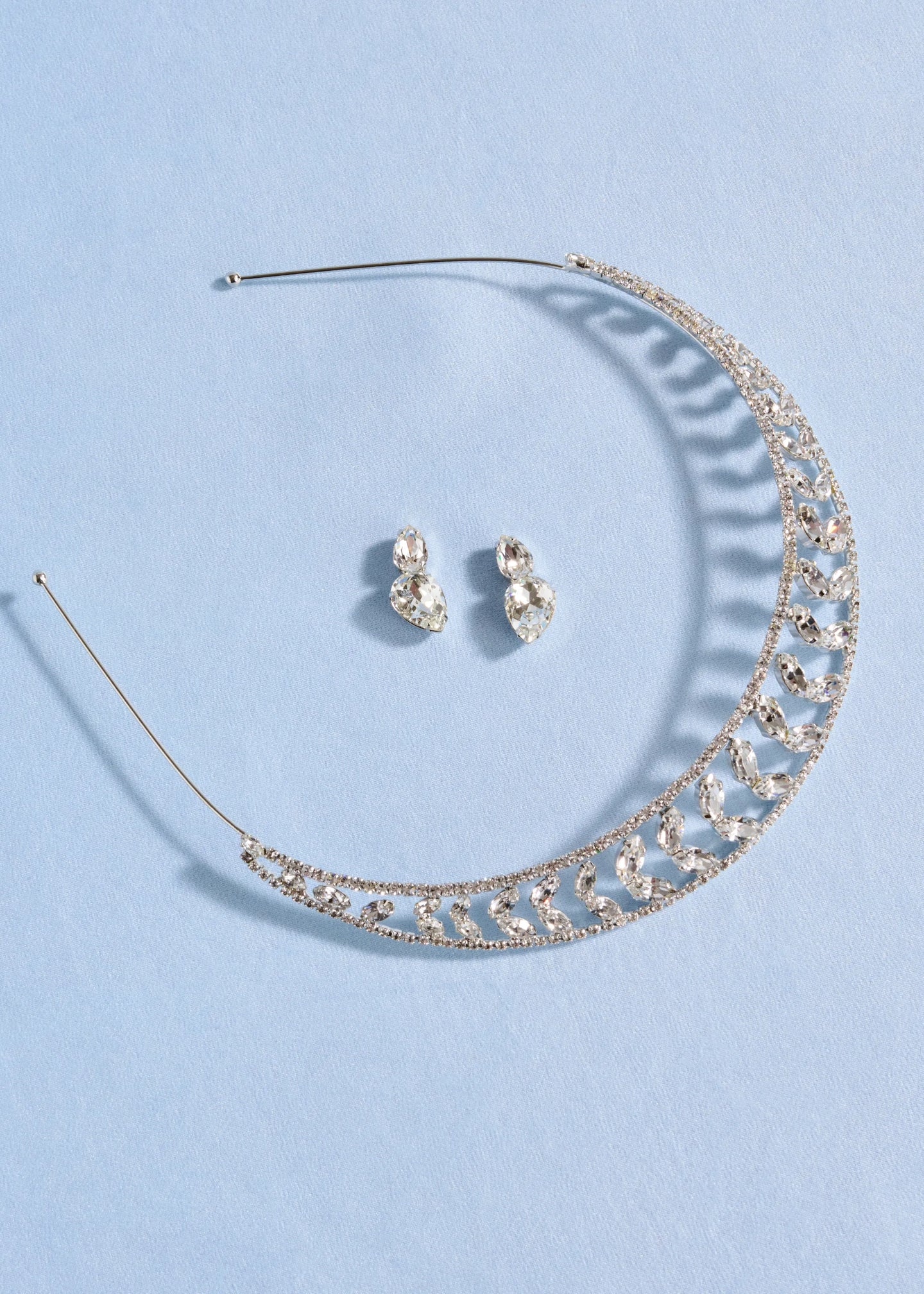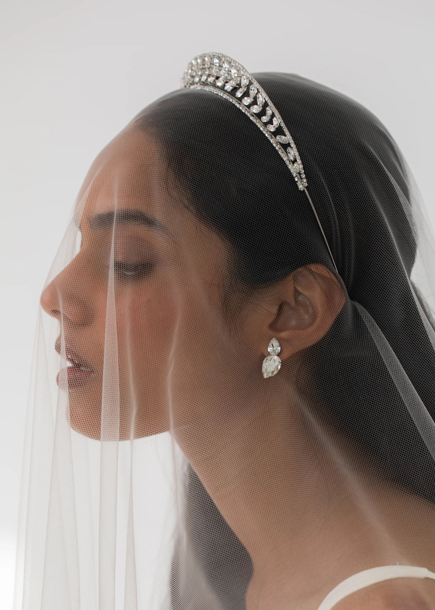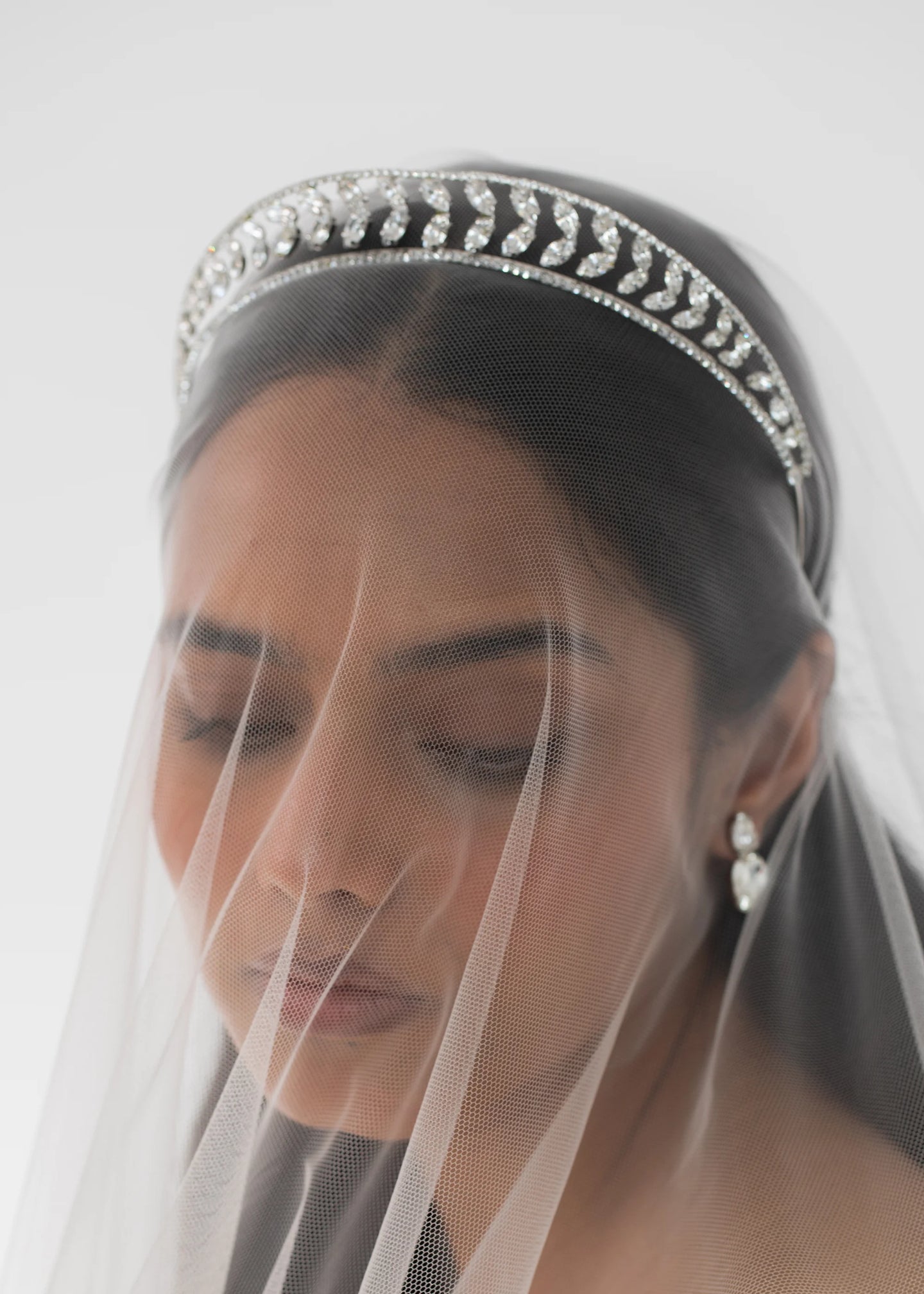 Inspired by bandeau tiaras of the 1920s, the Alessa Tiara is an unforgettably striking vision. Perfectly angled to frame the face, fine Austrian crystals form an Art Deco chevron motif. Made by hand in New York, the fine rhodium-plated base disappears in the hair, giving the illusion of a halo of gems.