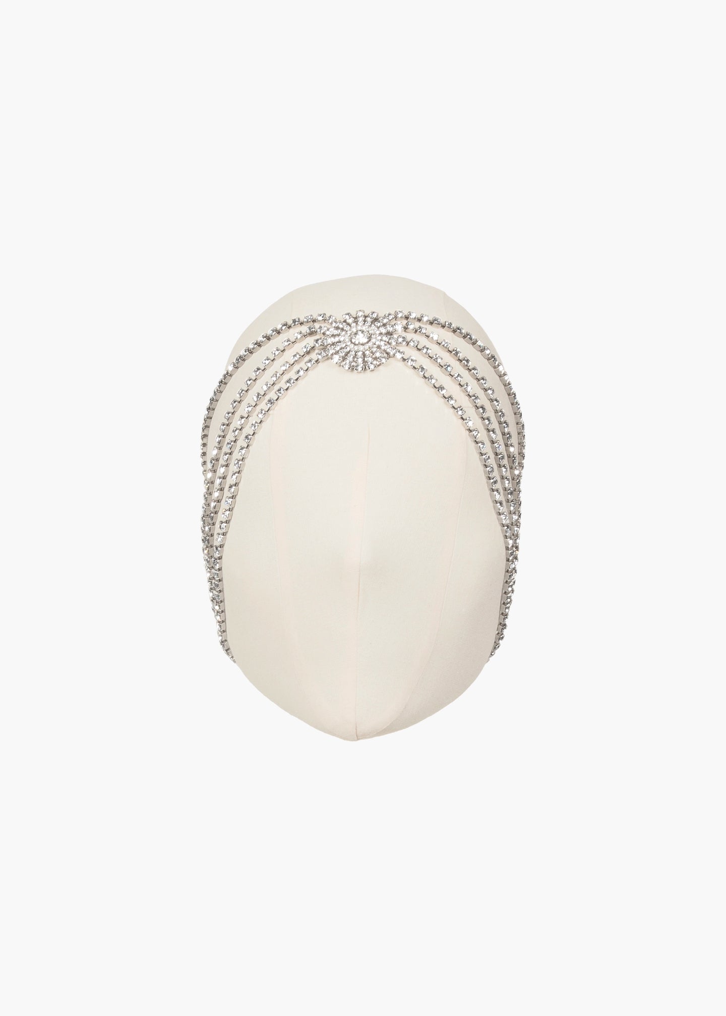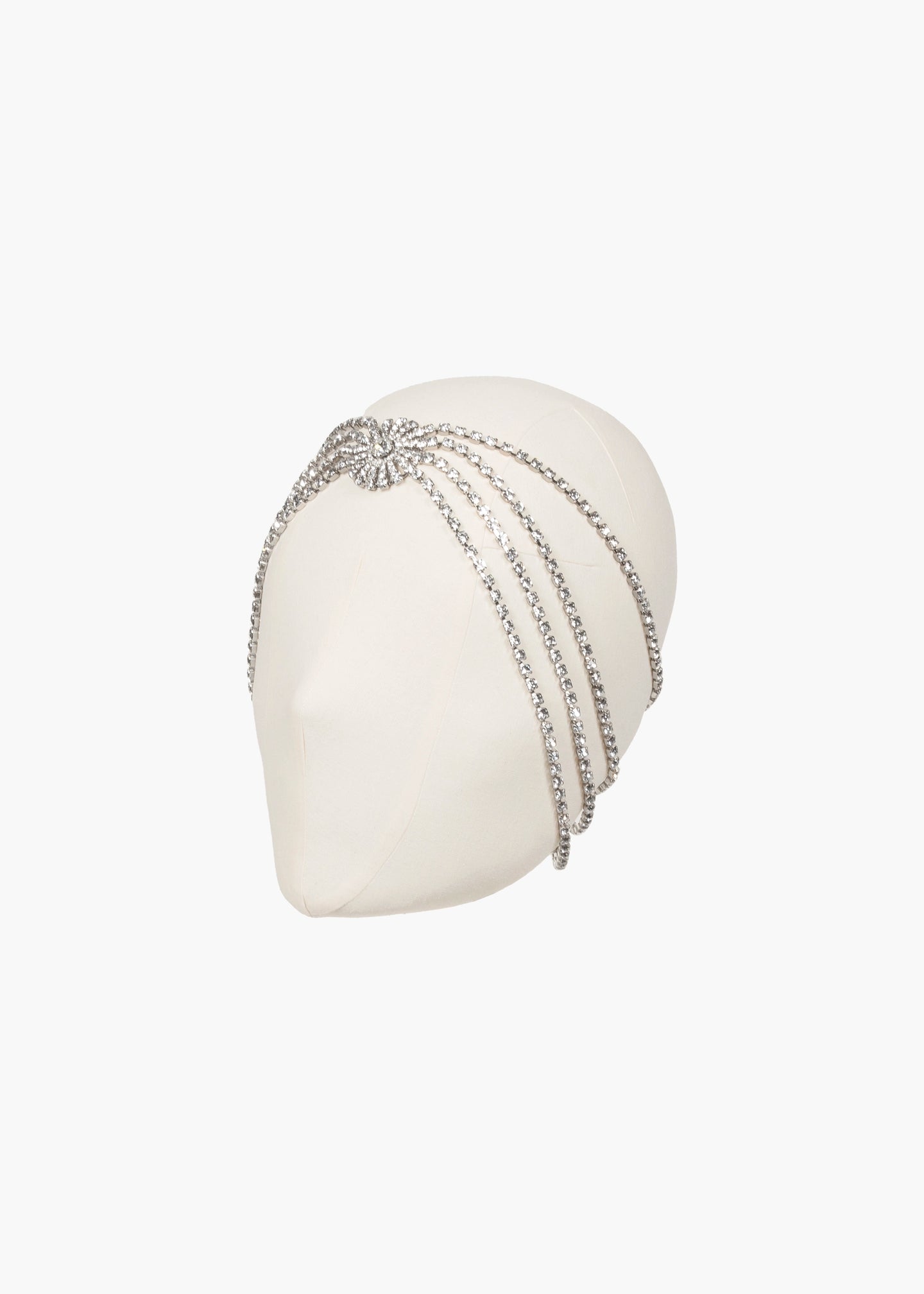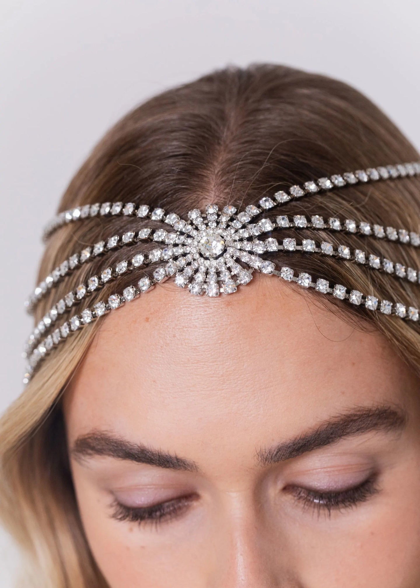 Inspired by 1920s headpieces, the Zelina Diadem is a modern interpretation of an iconic look. Made by hand in New York, Austrian crystal chains are draped along either side of the head. The strands center upon a mesmerizing crystal starburst at the center of the hairline. Dimensions: 10.4" length