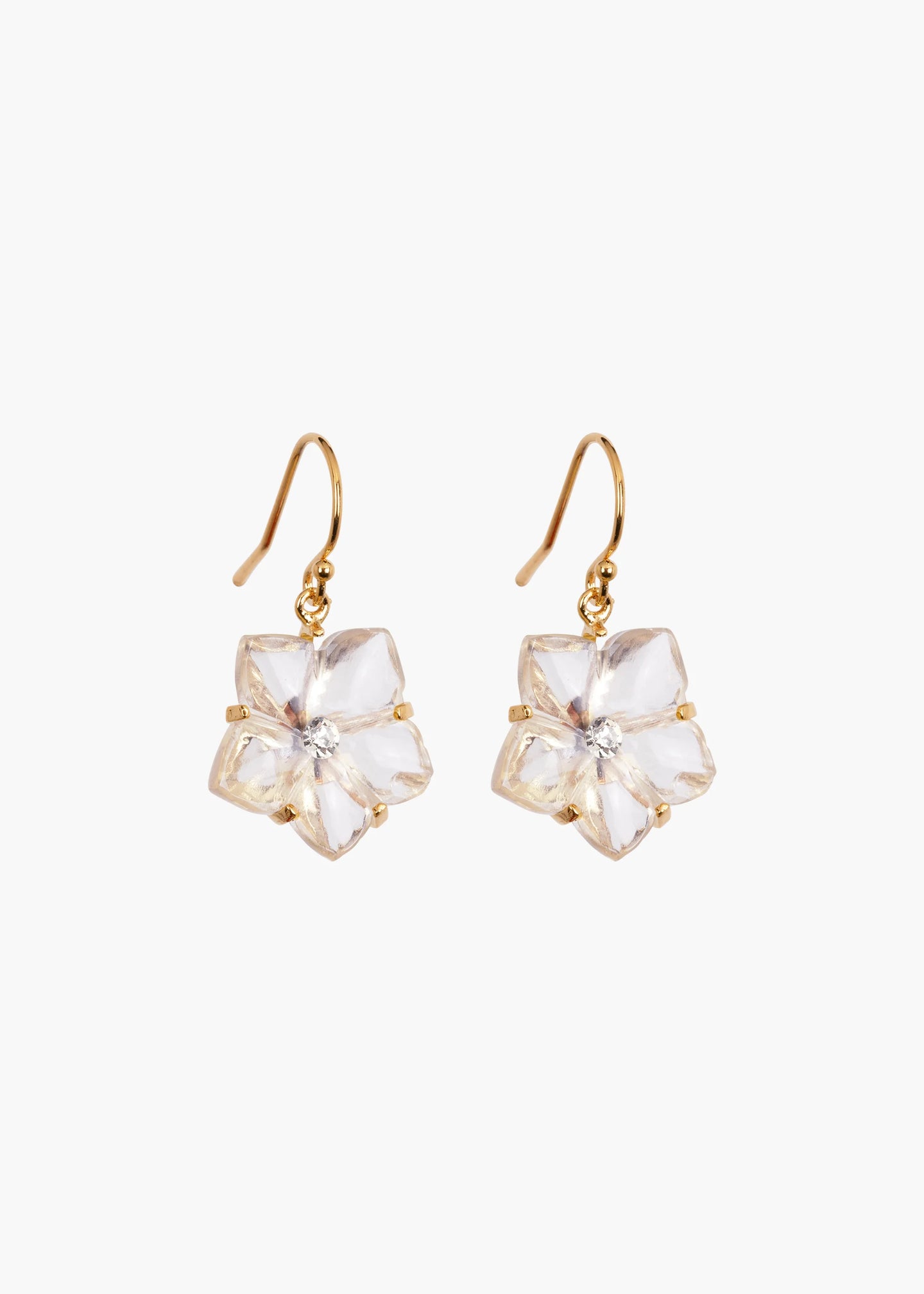 The Lyanna Earrings are made by hand in New York from 18K gold plated brass and hand-carved semi-precious stone flowers with Austrian crystal accents. All stones have natural variances in color and markings that make each one unique. They have a gold-filled ear wire post, are nickel-free, and safe for sensitive skin. We recommend storing earrings in their dust bag while not in use, and avoiding contact with water, perfume, hairspray, and other chemicals. Dimensions: 1.2" length.