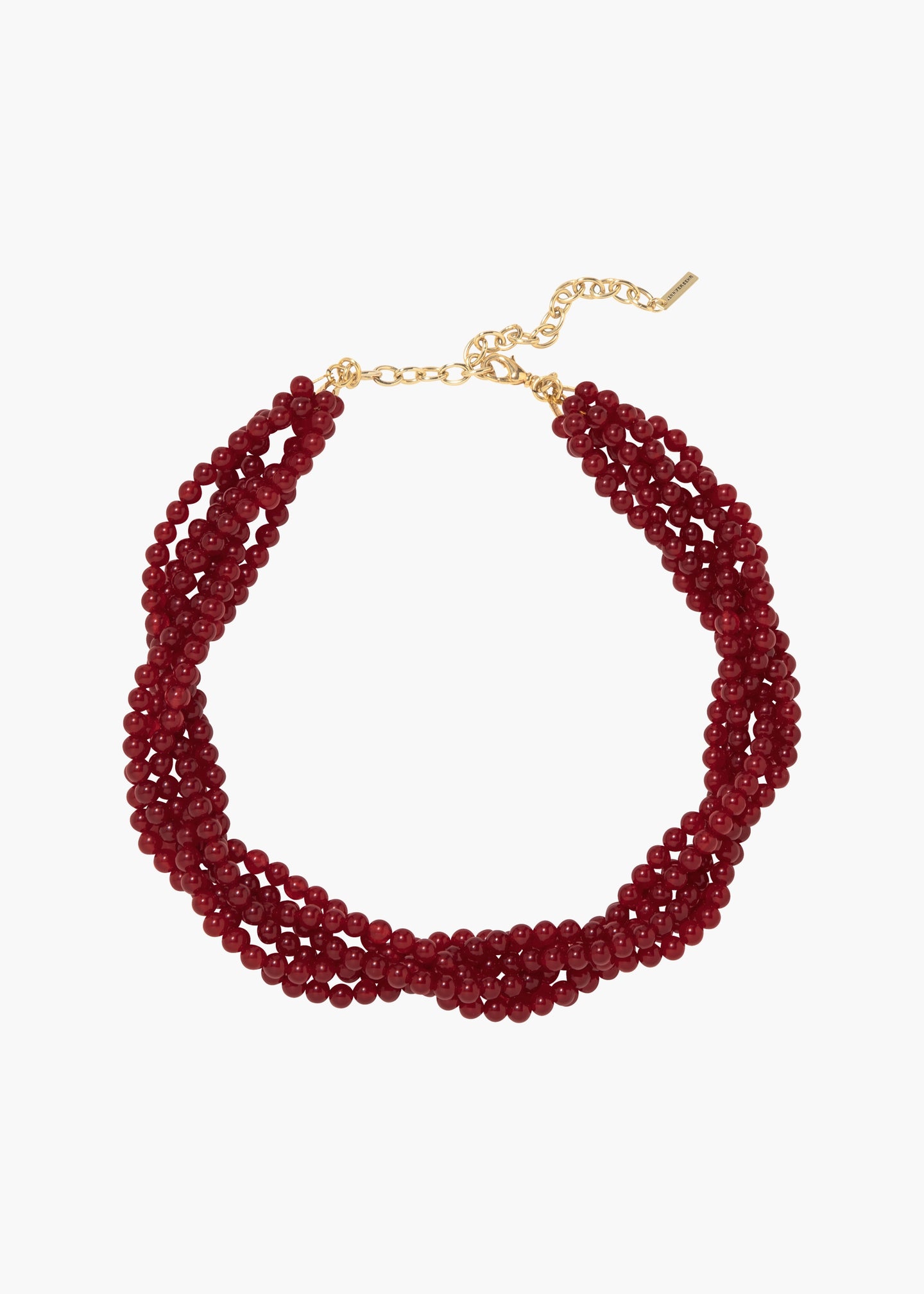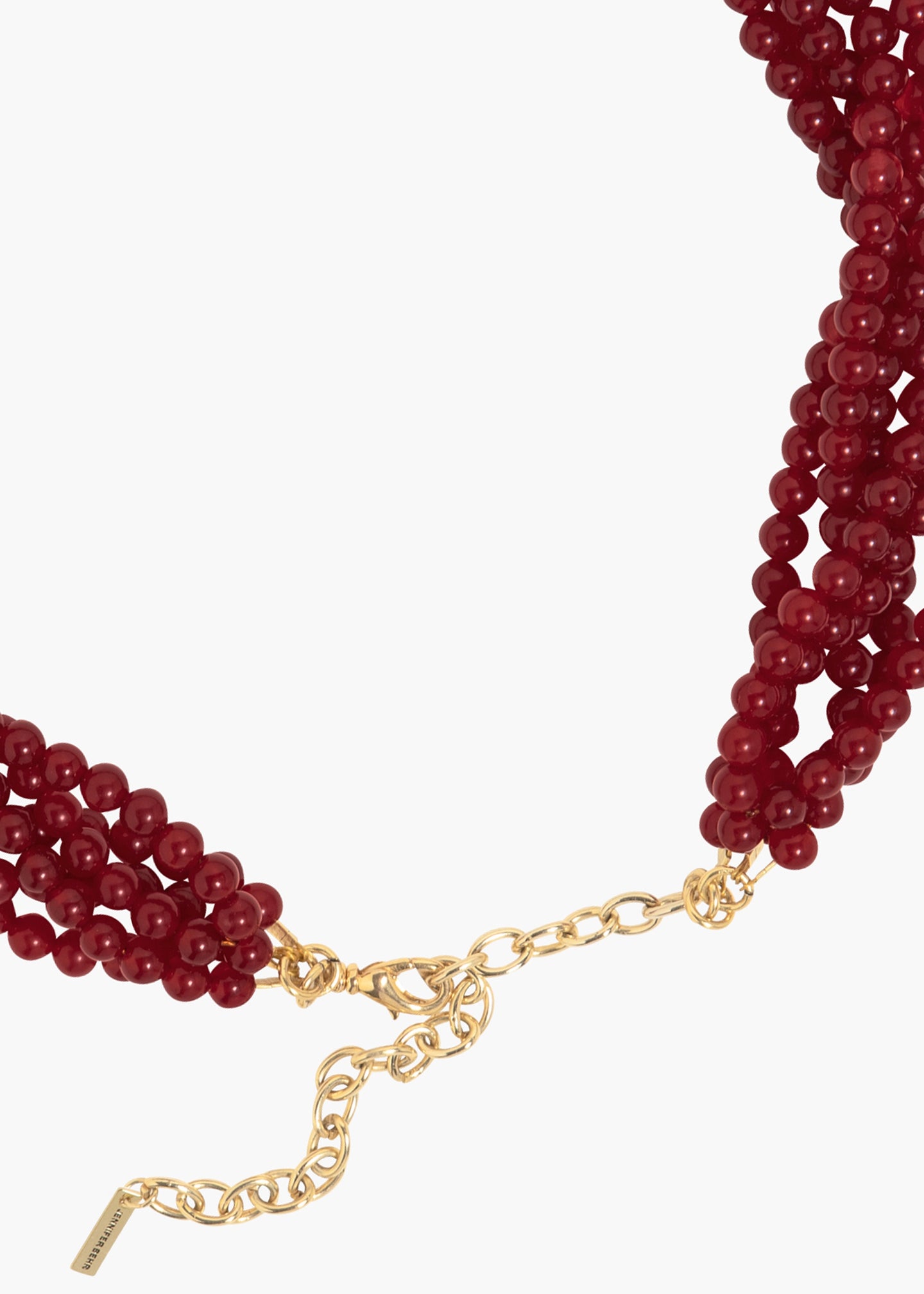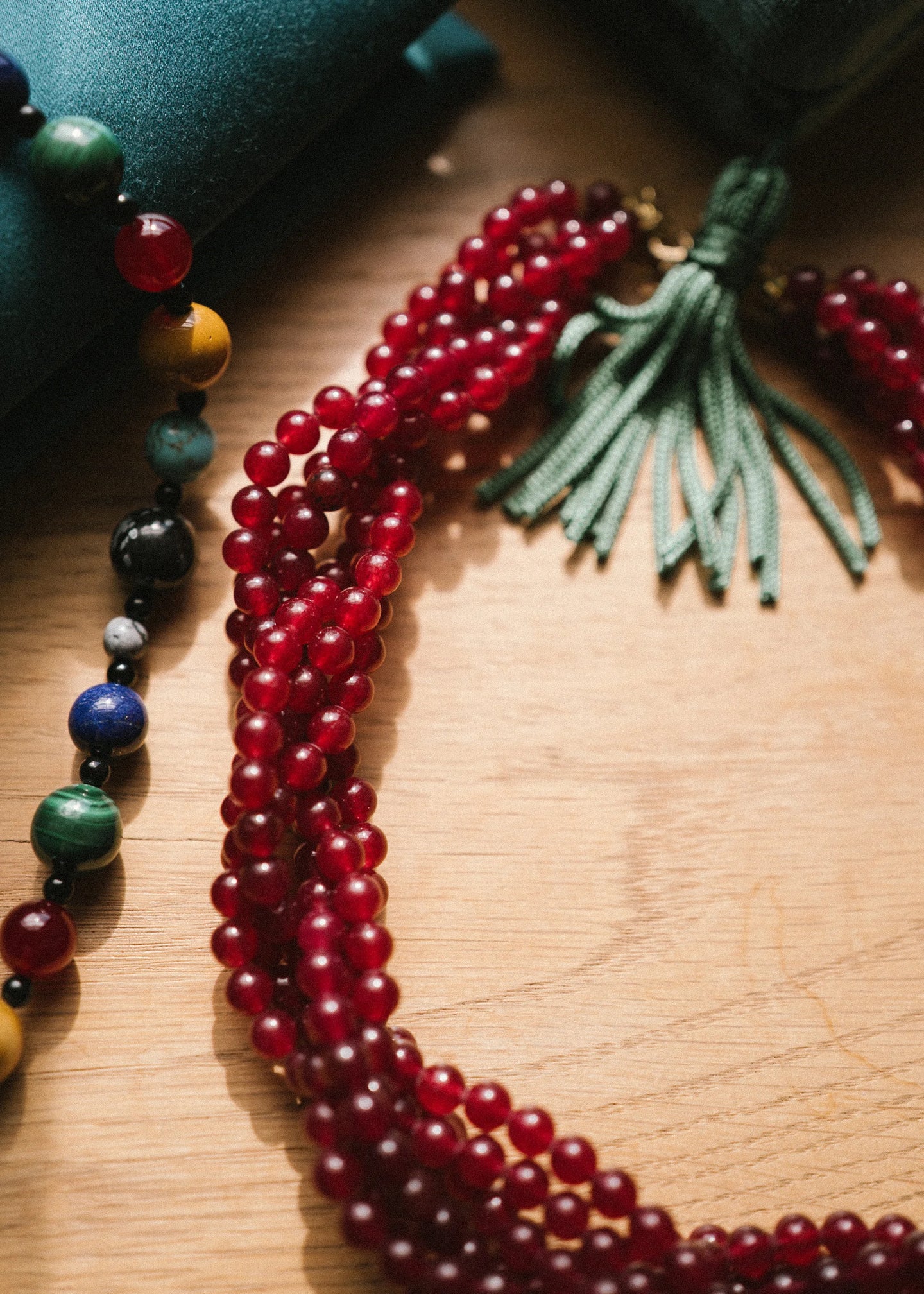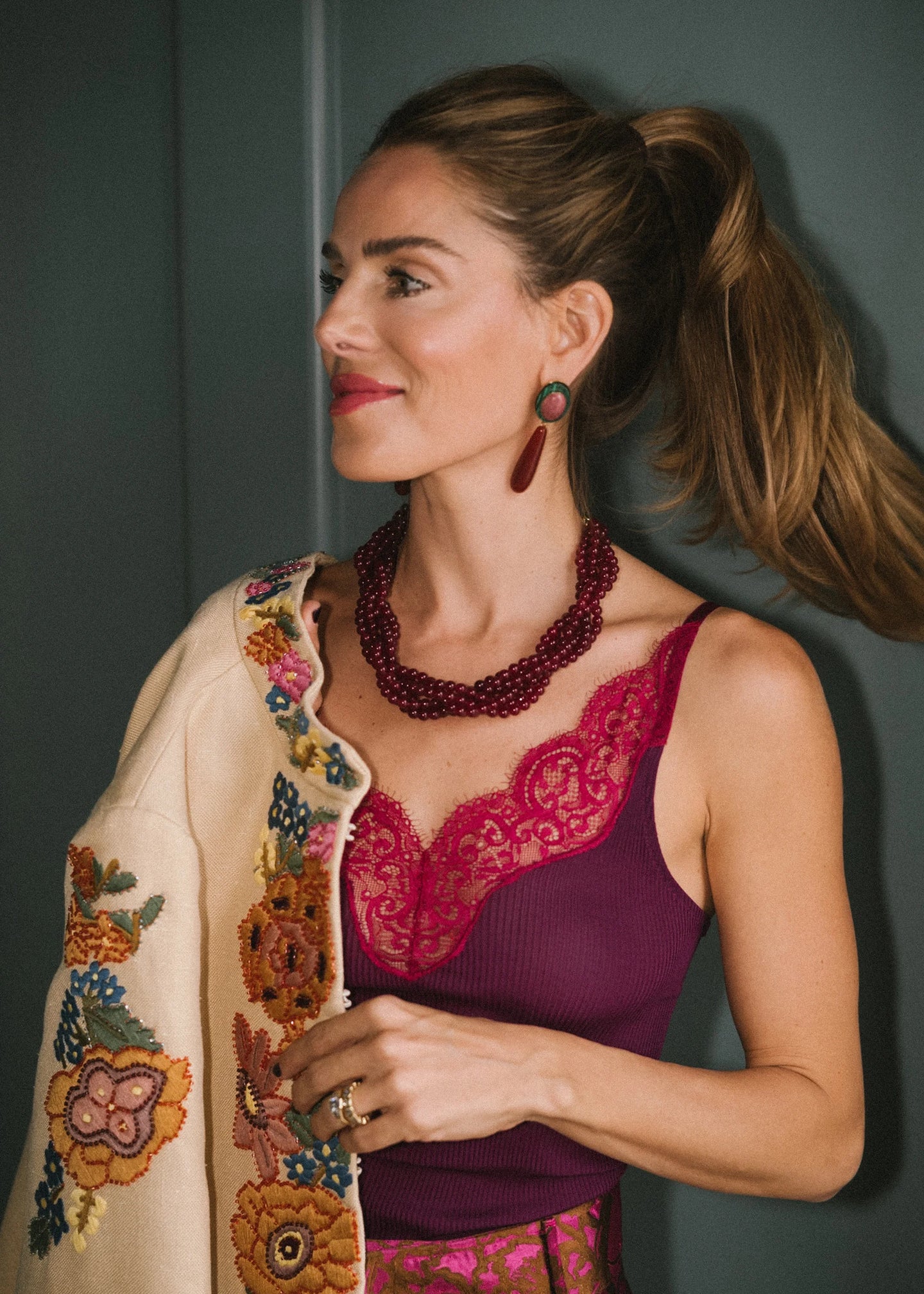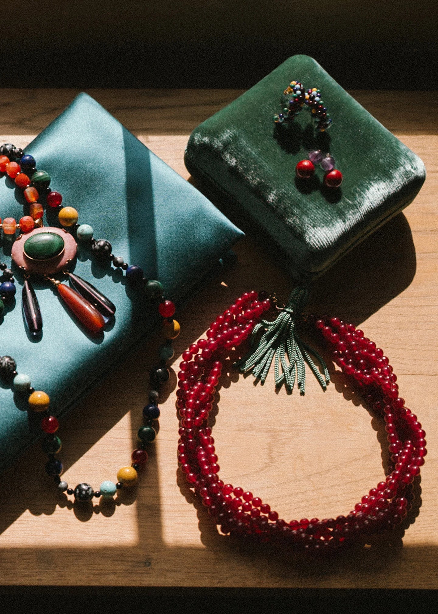 For this collaboration between Julia Berolzheimer and Jennifer Behr, Julia and Jennifer built upon their past designs, creating pieces that seamlessly shift with the moment, like the vintage-inspired Paloma Necklace. For Julia, this design is a chic manifestation of where her own style has moved: "more expressive, more collected, and grounded in strong color," she says. Each necklace is made by hand in New York, featuring multiple strands of Austrian crystal beads in a rich ruby hue, complete with an 18-karat gold-plated lobster clasp and an extender chain to adjust the length, ensuring it lays perfectly with every neckline. Pair with the Cora Earrings or layer in the Cordelia Necklace or Talula Necklace for extra impact—the collection was designed so that the pieces could be mixed and layered together to build a visual story.