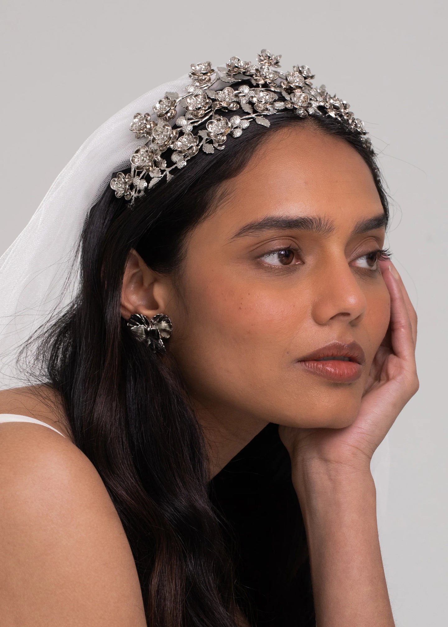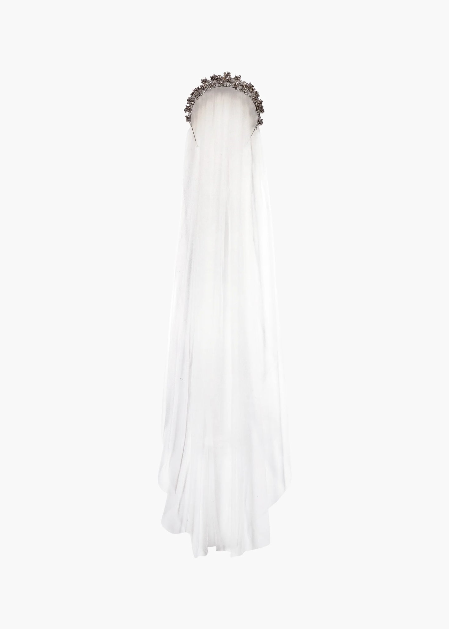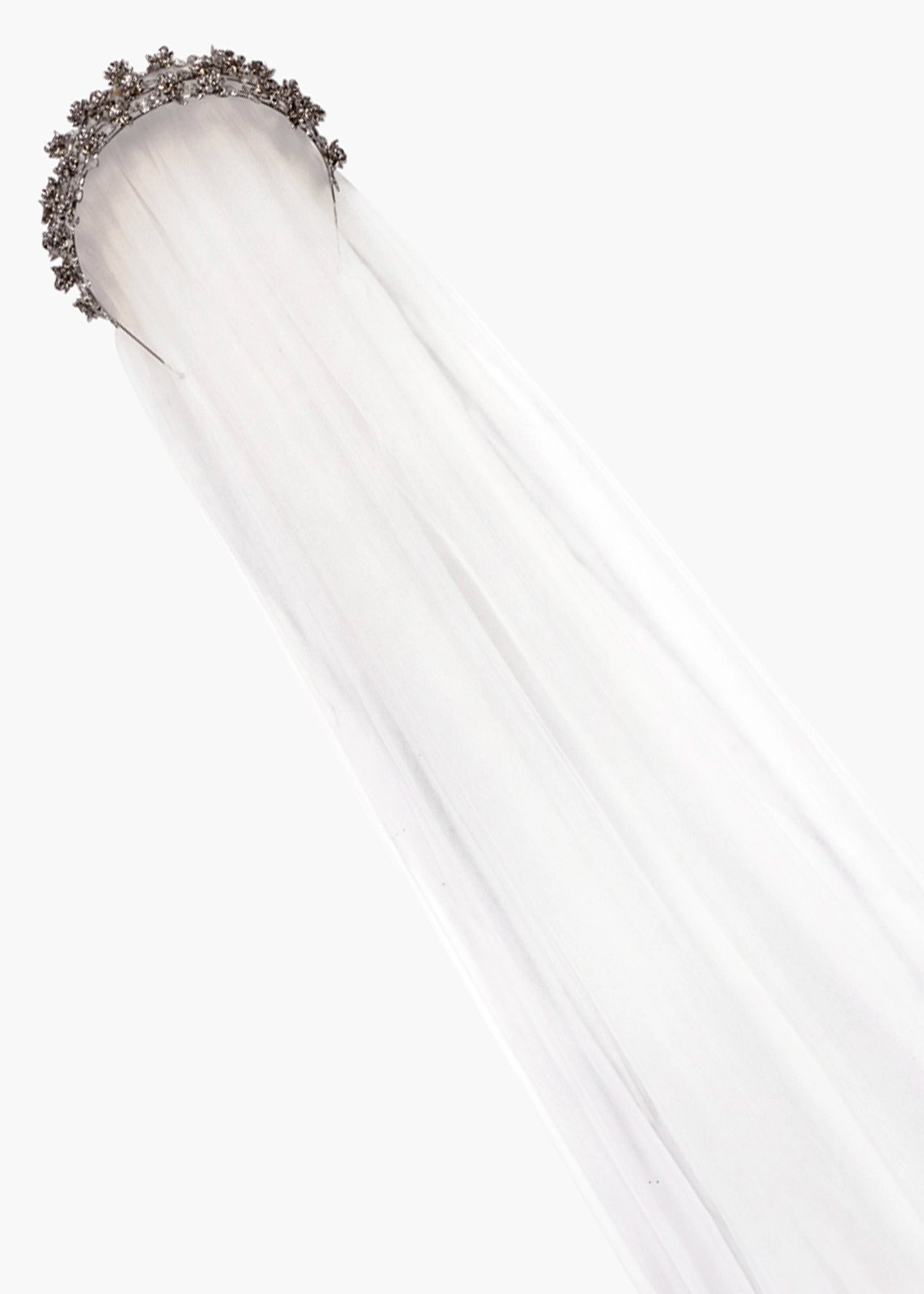 Inspired by the sinuous forms and whiplash curves of the Art Nouveau age, the Braelynn Juliette Veil channels the unparalleled romance of the era. Made by hand in New York, rhodium-plated high-shine florals are juxtaposed by softer etched botanical elements, creating a sense of depth and texture. A tulle veil completes the look.