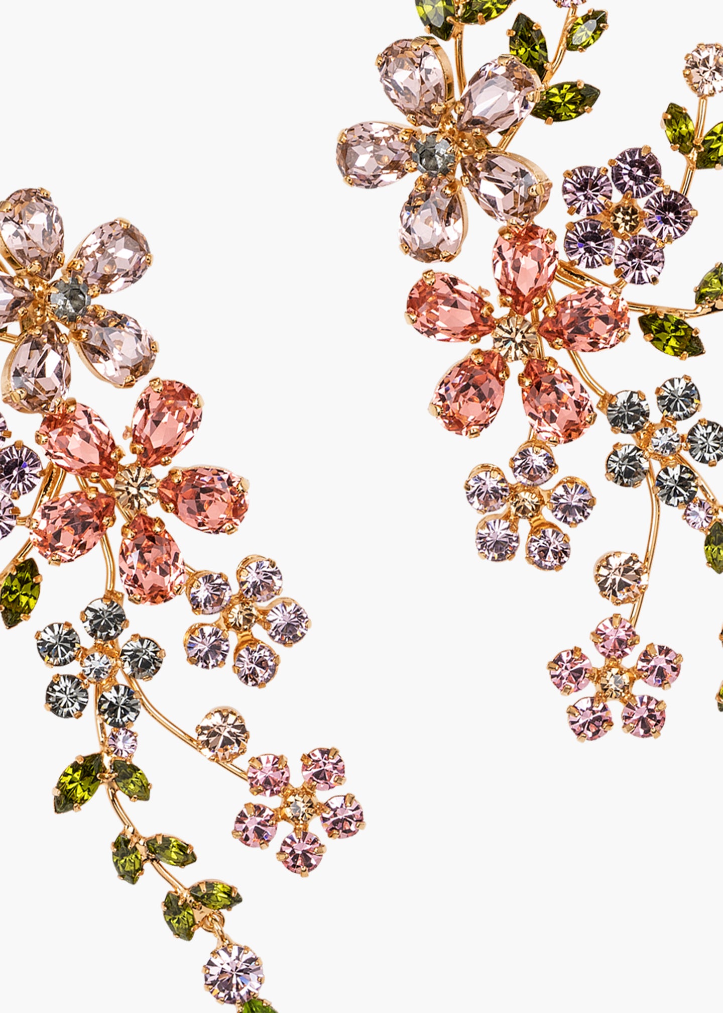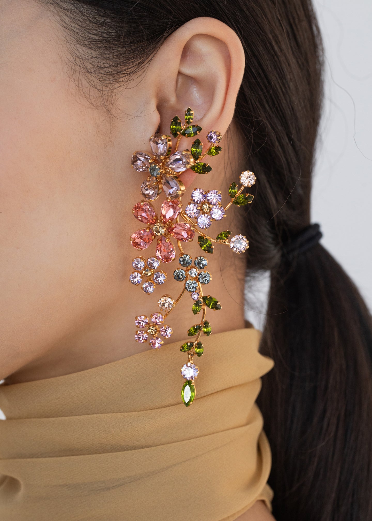 With dramatic floral sprays, the Darianna Earrings frame the face and steal the show. Inspired by the gardens of Versailles, these earrings are set by hand with dozens of fine crystals. Made by hand in New York, the delicate setting all but disappears, giving the illusion of flowers floating midair. Dimensions: 4 inch length