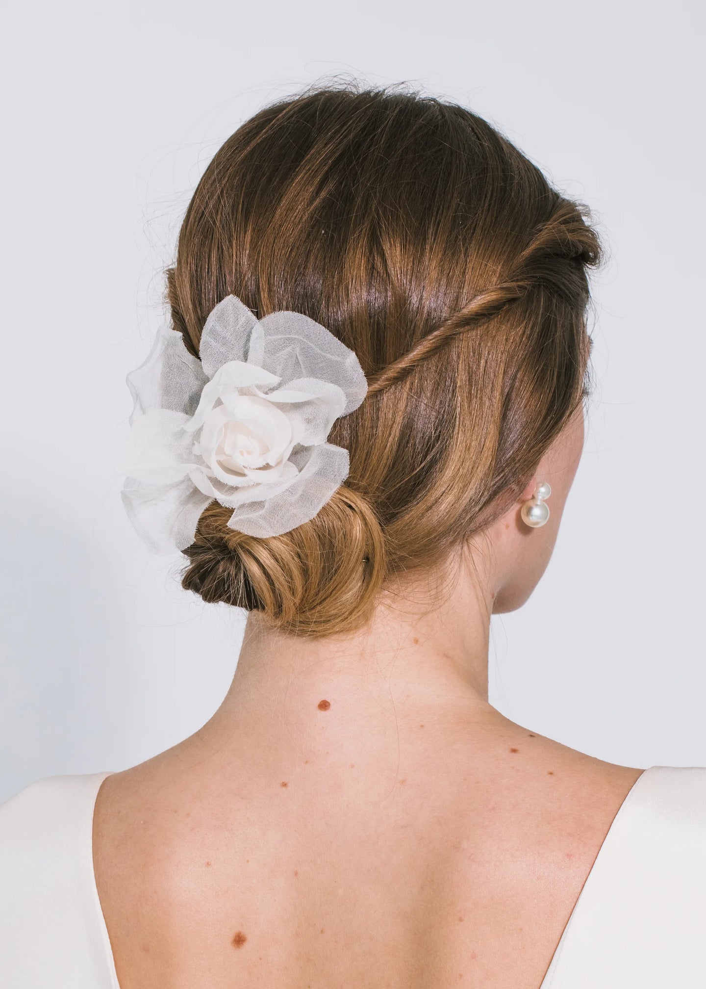 The Belen Comb is made by hand in New York of a silk chiffon rose on a rhodium plated comb which is designed to stay firmly in place, once other pins have the hairstyle securely fastened. We recommend treating this comb as you would a piece of jewelry, and storing in the dust bag when not in use. Avoid contact with water, perfume, and other chemicals, including hairspray, which should be used before placement in the hair.