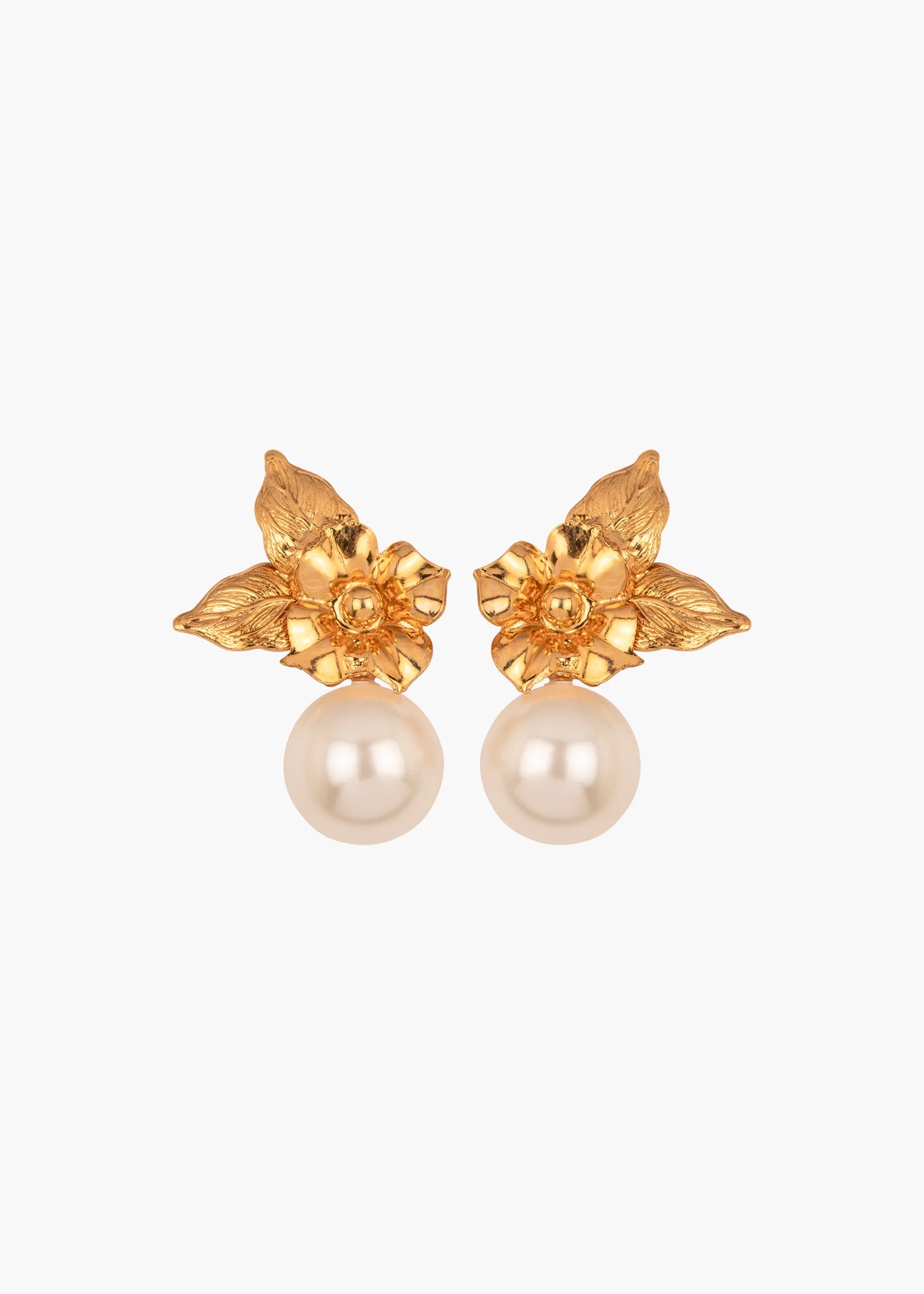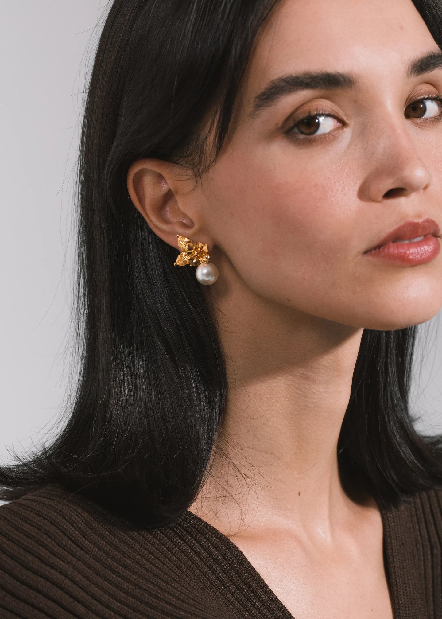 The Rici Earrings are a golden twist on our best-selling Vivi Earrings. Made by hand in New York, the 18-karat gold-plated floral motif is rich with lifelike detail. Finished with an Austrian crystal pearl drop, these earrings will take you anywhere. Dimensions: 1 1/4in x 7/8in