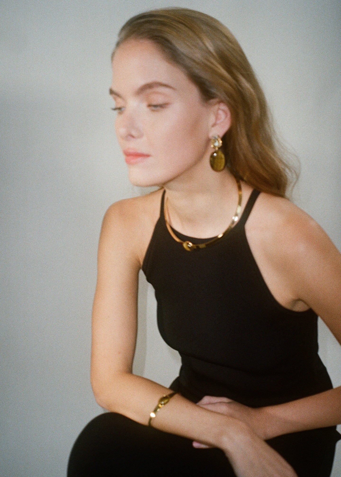 A cornerstone of our debut bracelet collection, the Elaine Cuff is a classic wardrobe staple. Made by hand in New York, it's plated with 18-karat gold and set with a cabochon tiger's eye, a natural semi-precious gemstone, defined by its distinct markings that make each bracelet unique. The ultimate stacking piece, we love layering multiple at once, and pairing with other bracelets in our collection.