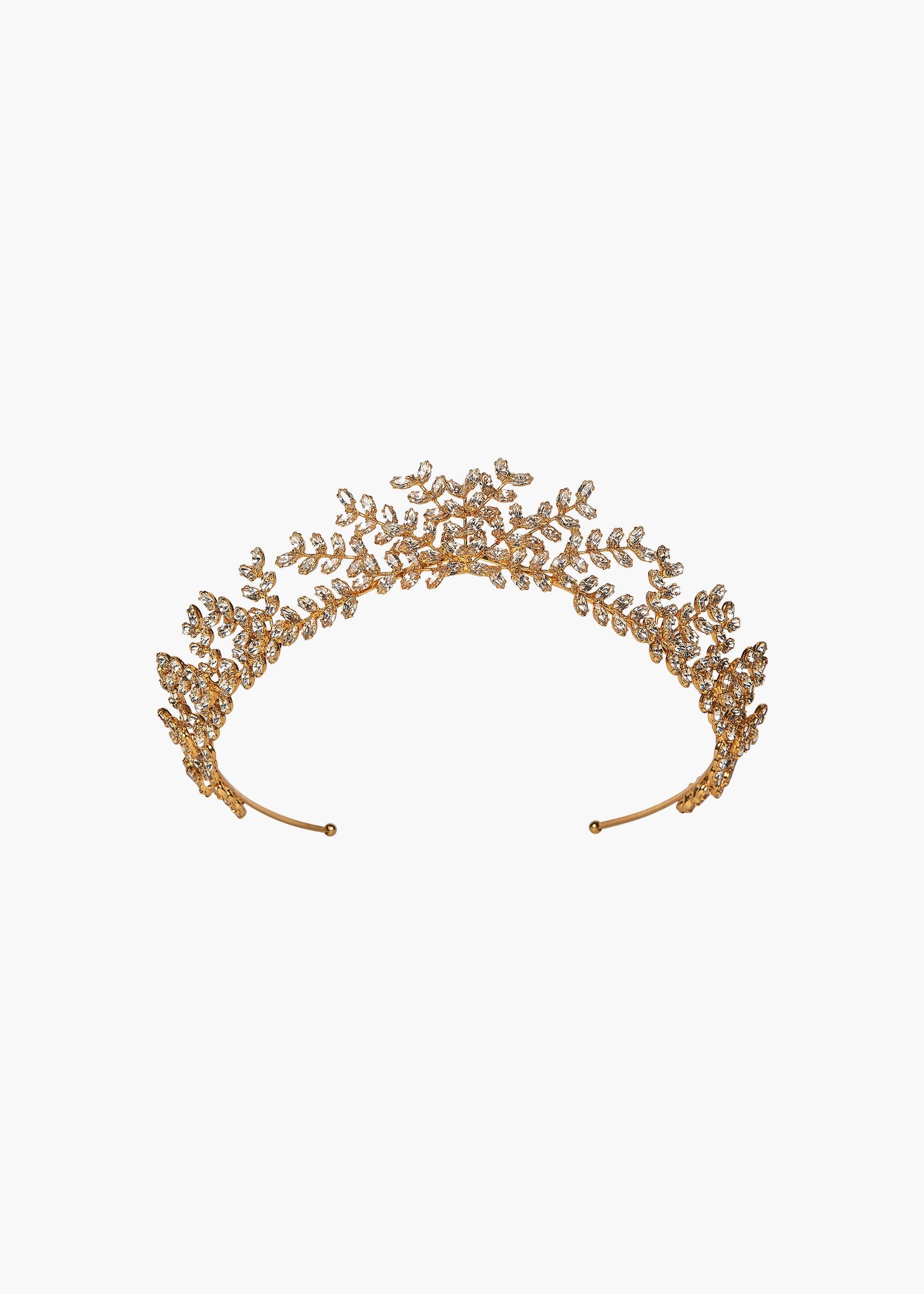 The Mignonette Tiara is made by hand in New York of Swarovski crystal, on a gold-plated or silver-plated brass base. We recommend treating this headpiece as you would a piece of jewelry, and storing it in the dust bag when not in use. Avoid contact with water, perfume, and other chemicals, including hairspray, which should be used before placement in the hair.