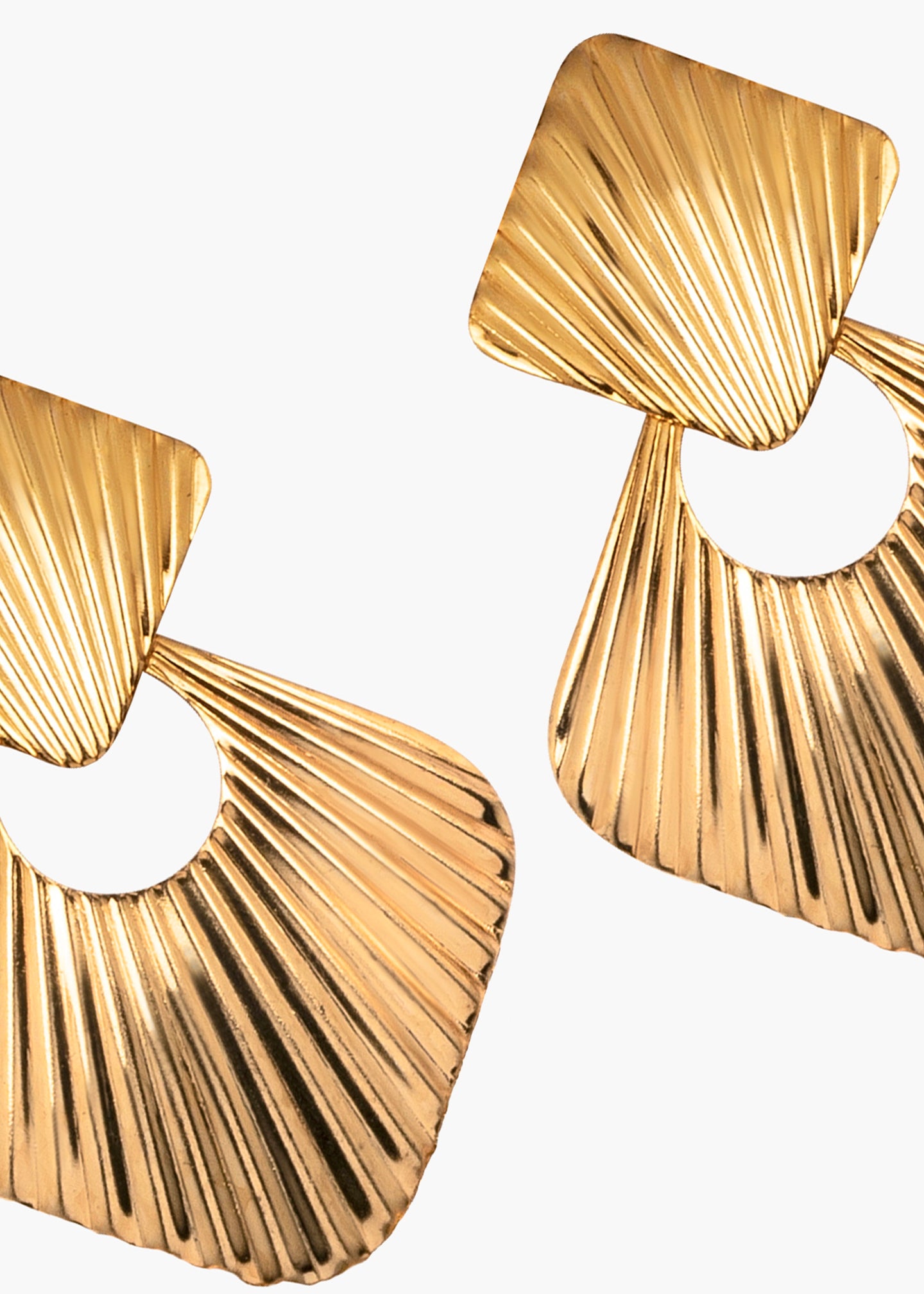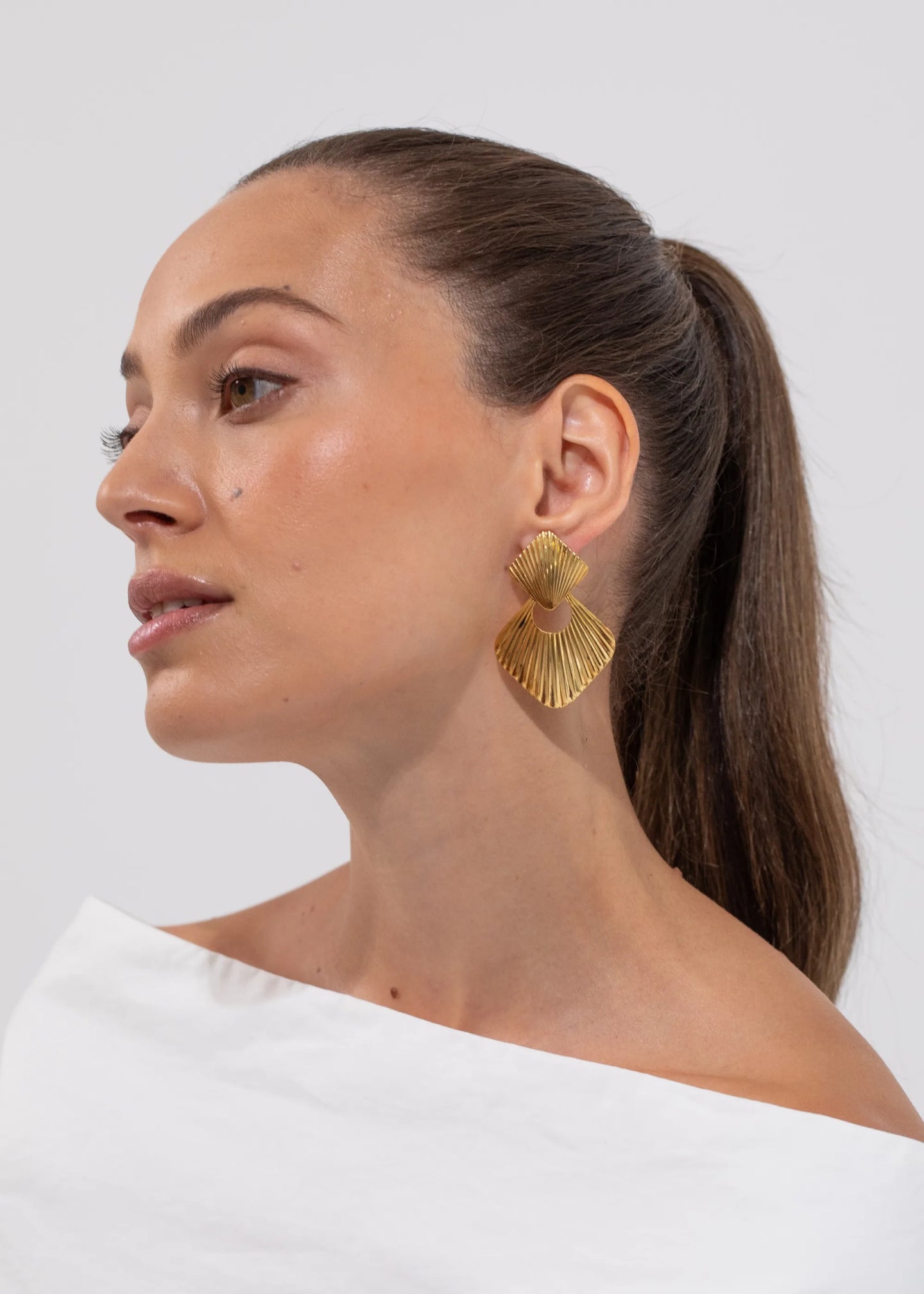 A modern silhouette with Art Deco influences, the Demetra Earrings take the fluting and pyramid themes that defined the Art Deco era, and reinterpret them in a fresh statement earring. Made by hand in New York and finished with 18-karat gold or rhodium plating, the symmetrical rays can only be achieved with scrupulous handwork. Our take on a doorknocker earring, these are simultaneously wearable and dramatic. Dimensions: 2.25"
