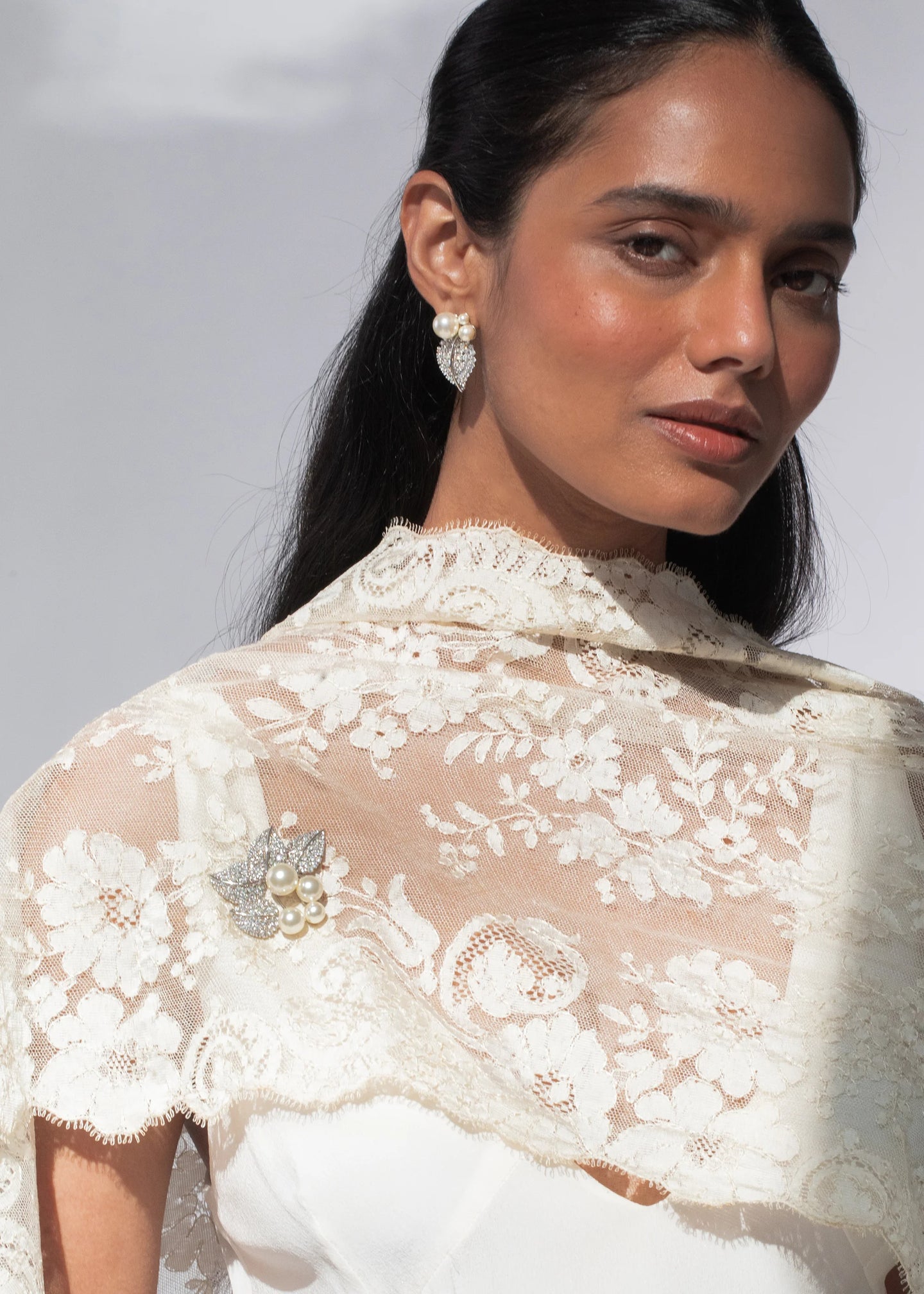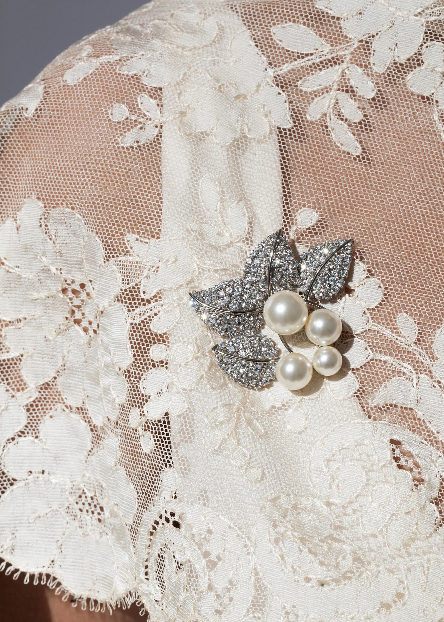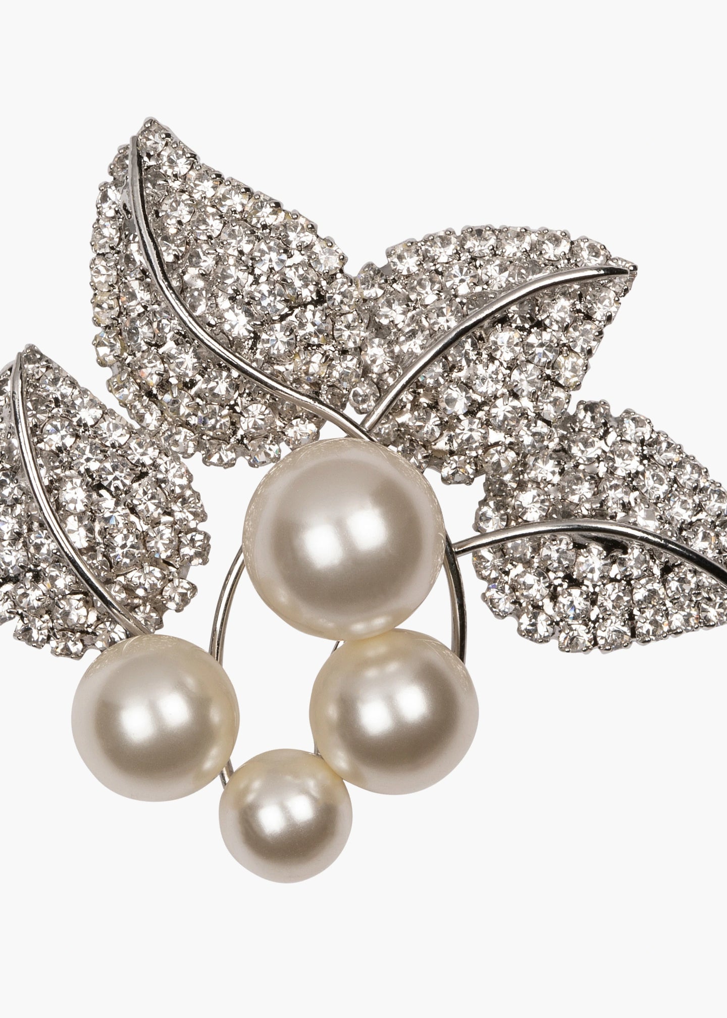 The Blanche Brooch is made by hand in New York of rhodium plated Austrian crystal leaf motifs and crystal pearl accents on a steel brooch pin closure. We recommend storing brooches in their dust bag while not in use, and avoiding contact with water, perfume, hairspray, and other chemicals.