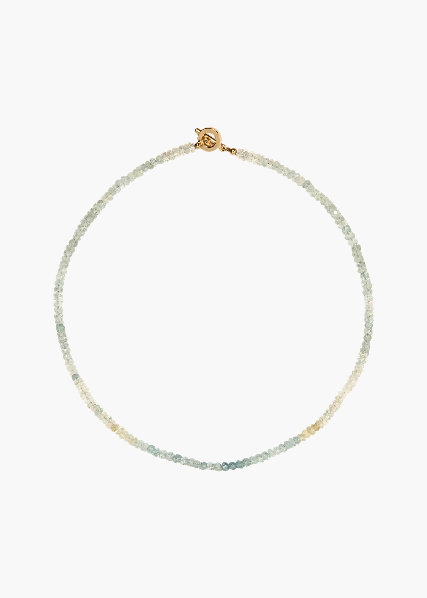 The Elba Necklace's ethereal palette is inspired by seafoam meeting a sandy beach, rendered in semi-precious aquamarine. Each hand-carved bead is faceted to emulate that same vision of a sparkling sea. Made in New York, it is finished with a T-bar clasp. Dimensions: 16 inch length