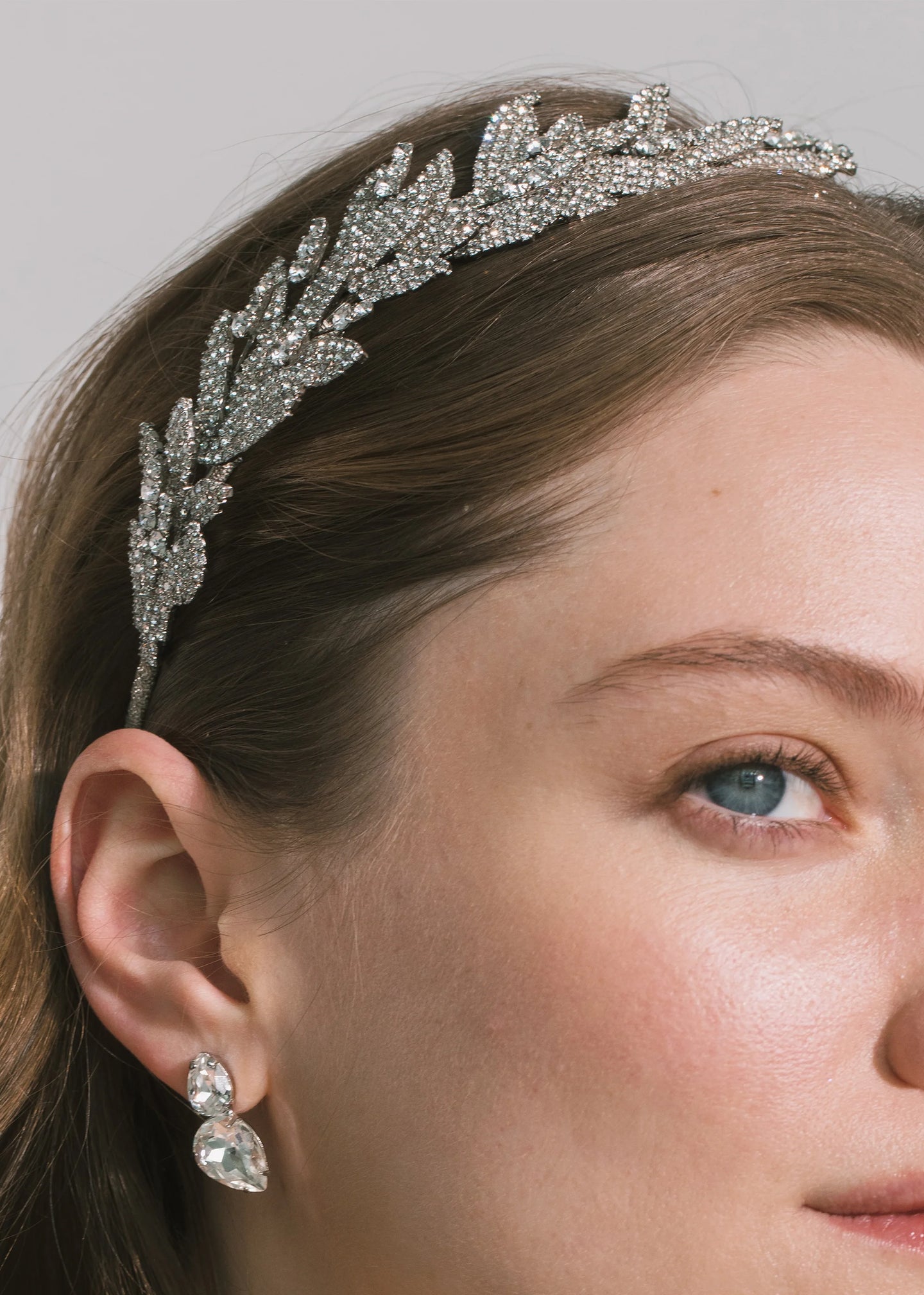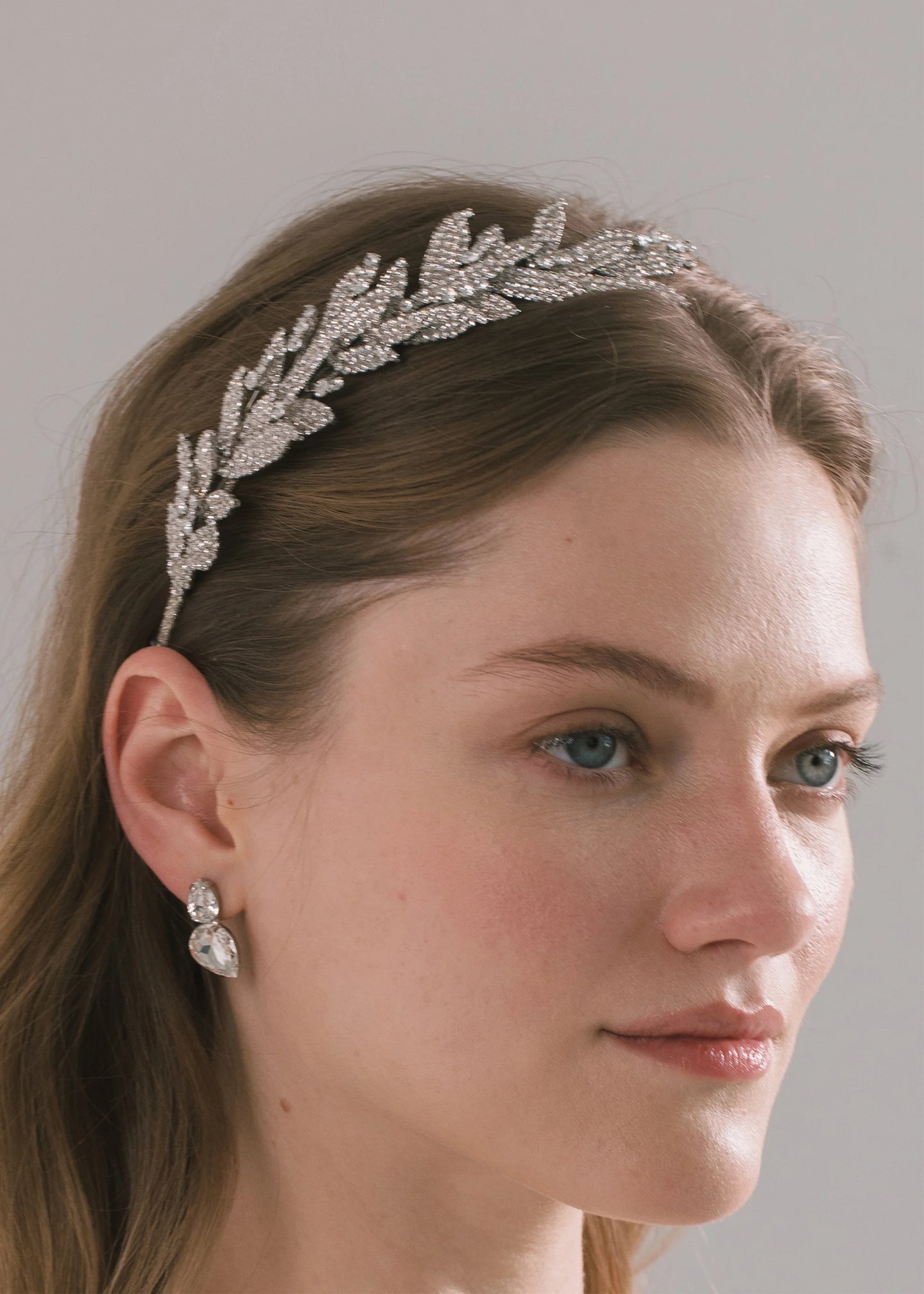 The Arielle Headband was originally created in the Fall of 2010. It features hundreds of Swarovski crystal adorned leaves fastened to a silver ribbon wrapped skinny headband. The Arielle Headband is the show-stopping solution that elevates a bridal look to the next level. It can be worn with a veil or alone, and is an ideal focal point to transition your hair from a ceremony to a celebratory reception. Pair with the coordinating Ariana Earrings.