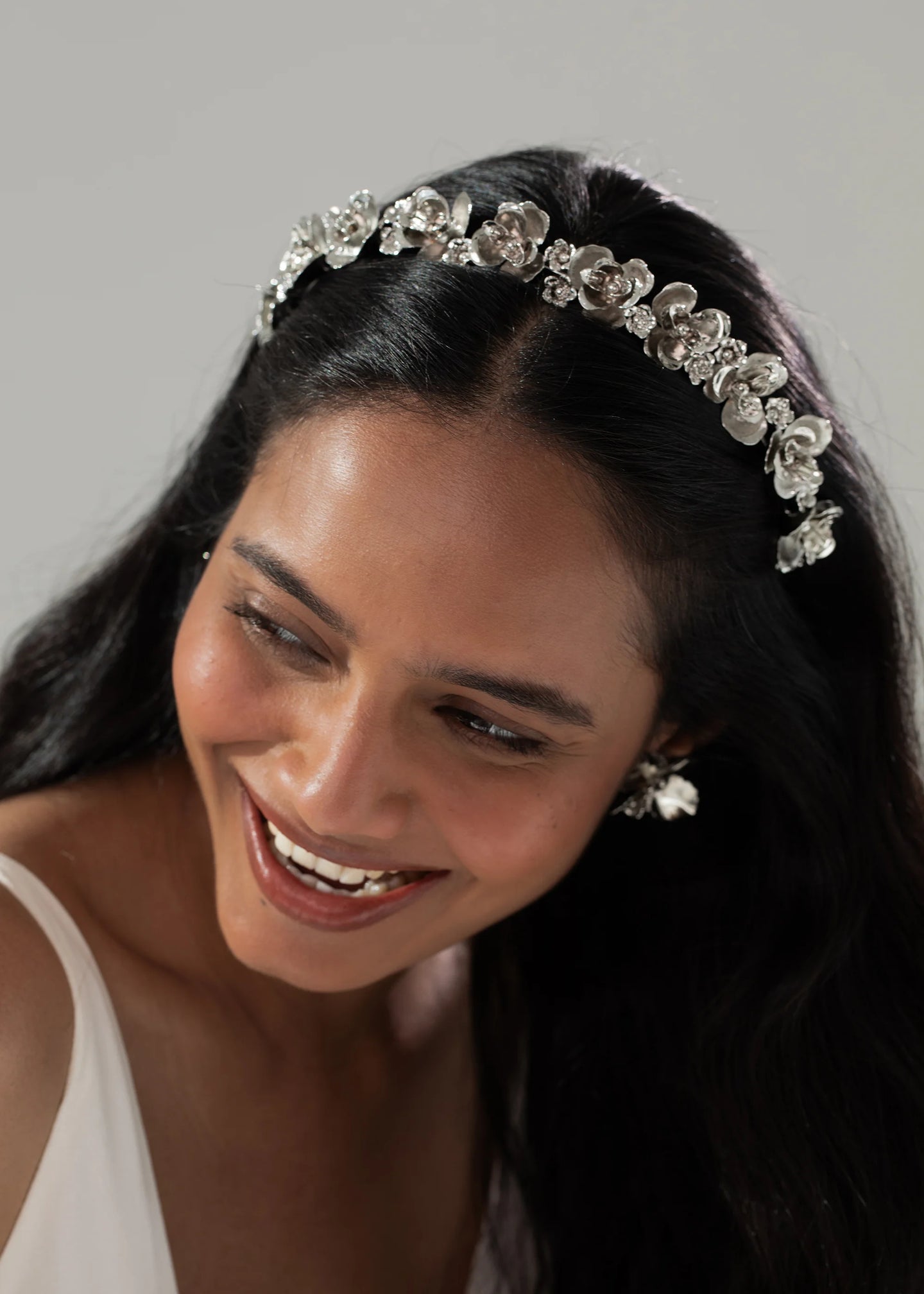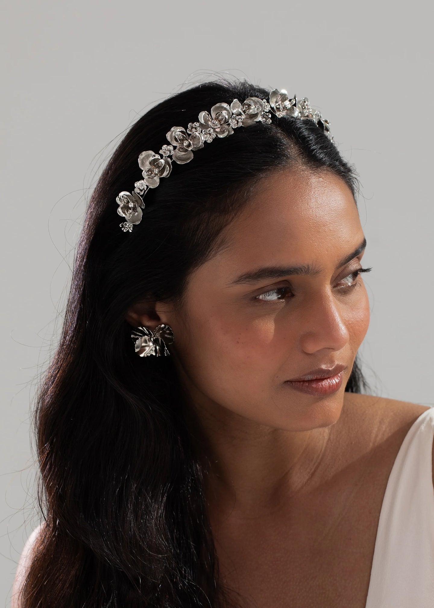 A fresh take on florals, the Larena Headband draws inspiration from Art Deco's Machine Age aesthetic. Made by hand in New York, these flowers are formed by hand and plated with rhodium for a modern look. The fine wire base disappears in the hair, giving the illusion of a crown of flowers.