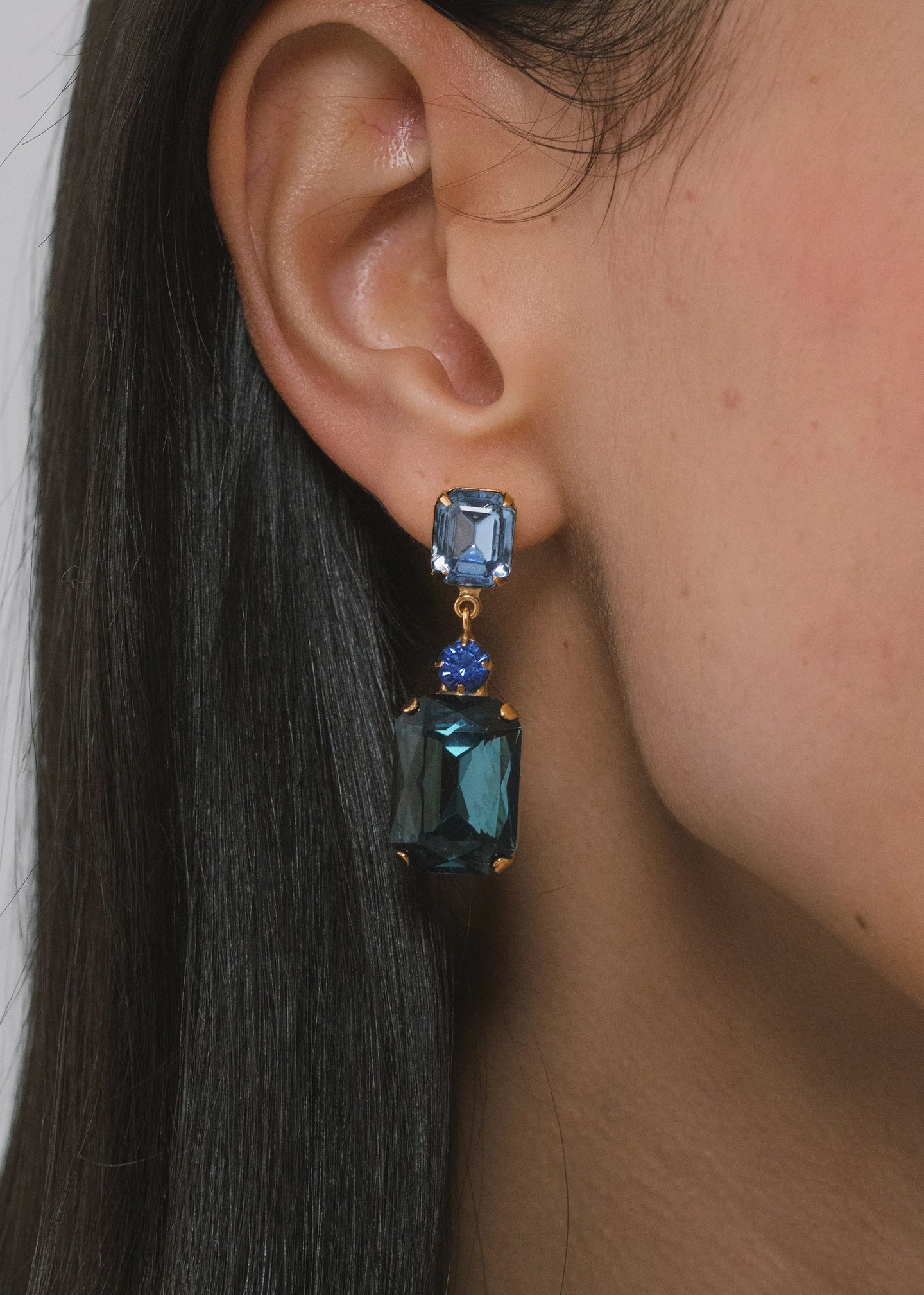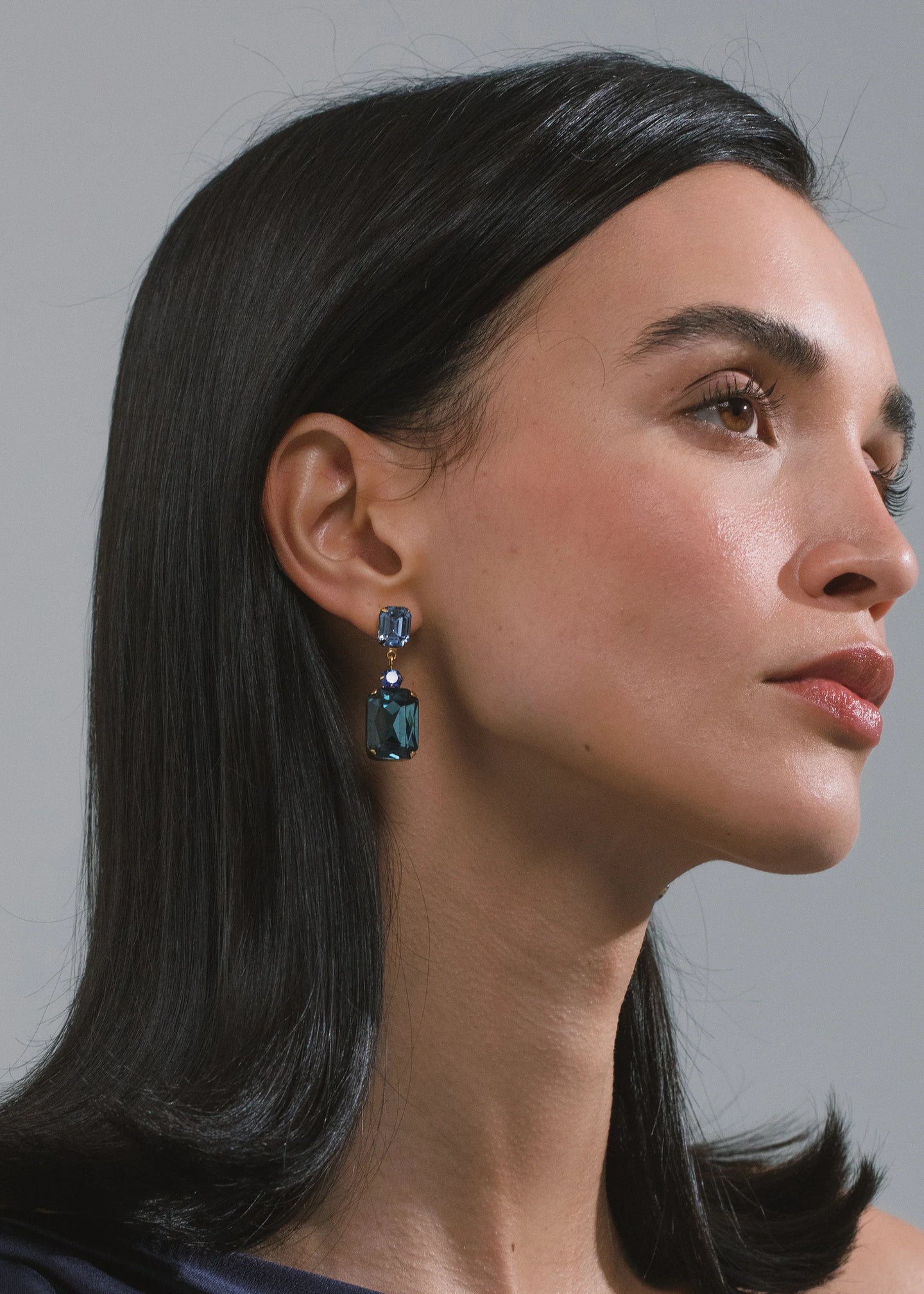 Your Bejeweled Era begins with the Justine Earrings. A pair of stately emerald-cut crystals in complementary hues are separated by a single delicate round stone. These superior drops will remain in constant rotation in your wardrobe for years to come. Dimensions: 1.5" length.