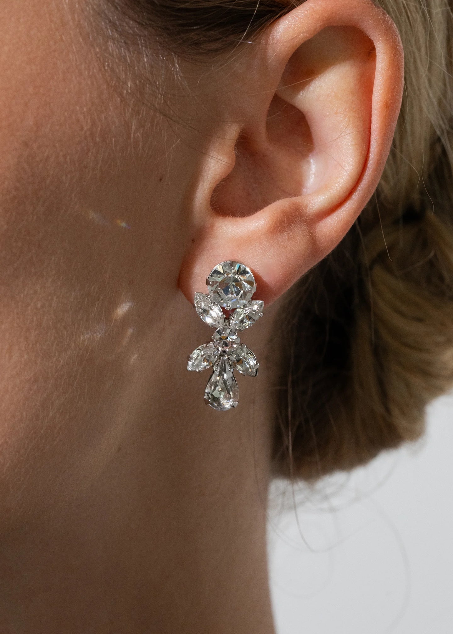 The Parker Earrings are timeless drop earrings inspired by vintage styles. The subtle geometric design is composed of fine Czech crystals in round, marquise, and pear cuts. These versatile crystal earrings serve as the perfect backdrop for other accessories, like one of our headbands. Dimensions: 1 1/8" in length, 1/2" in width.