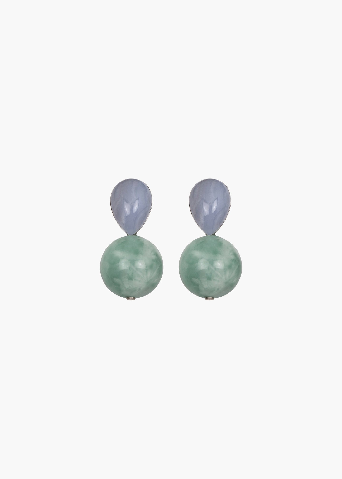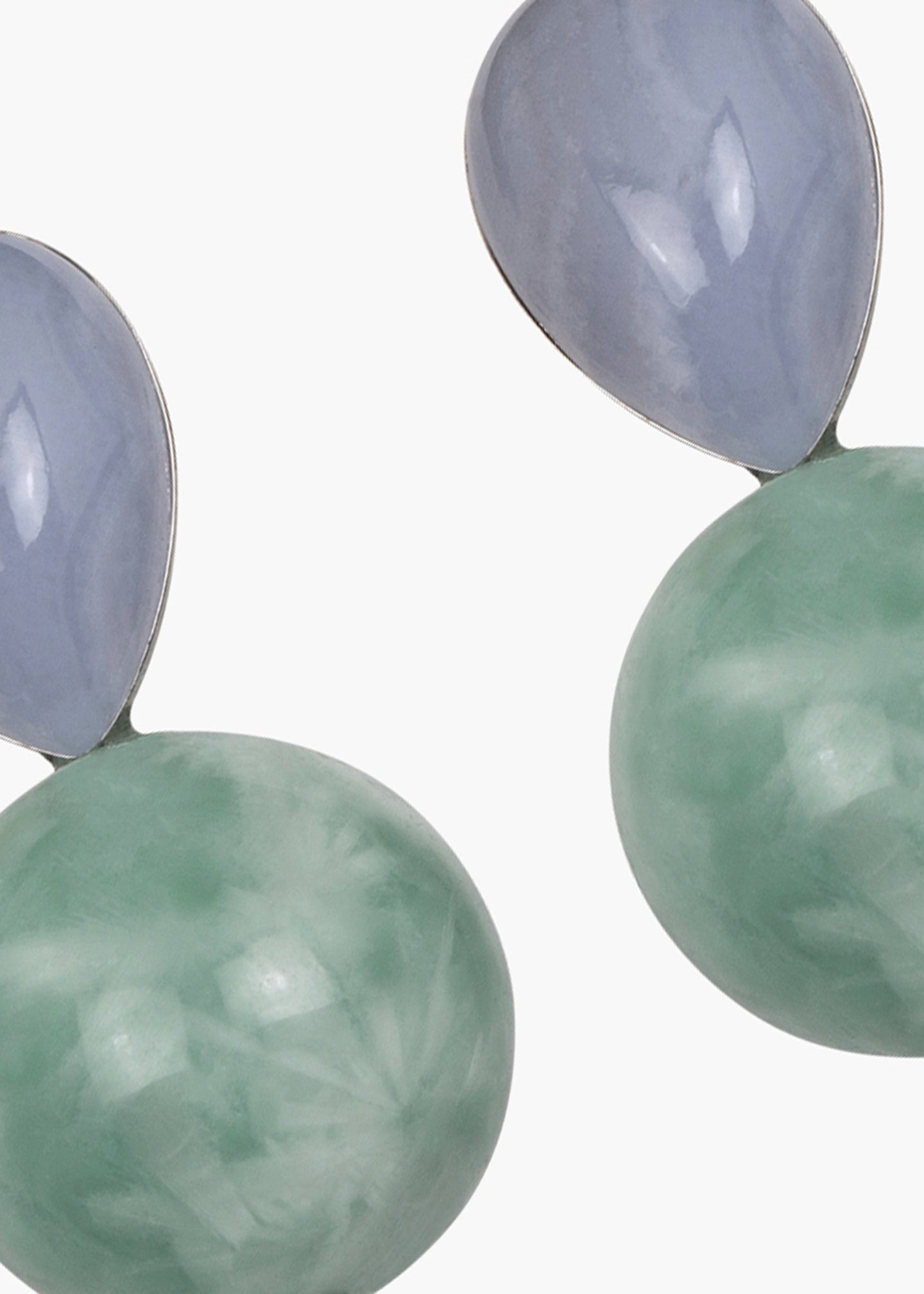 With semi-precious gemstones taking the shape of eye-catching gumballs, the Allison Earrings have an undeniably playful nature. The jadite (the rarer of the two type of jade) and blue agate stones were specifically selected to create a palette that pairs well with anything in your wardrobe, complimenting similarly muted pastels, and livening up more serious tones. Made by hand in New York with an 18-karat gold-plated setting, we love these earrings layered with our semi-precious jewelry, like the Louisa Necklace and the Salome Necklace.