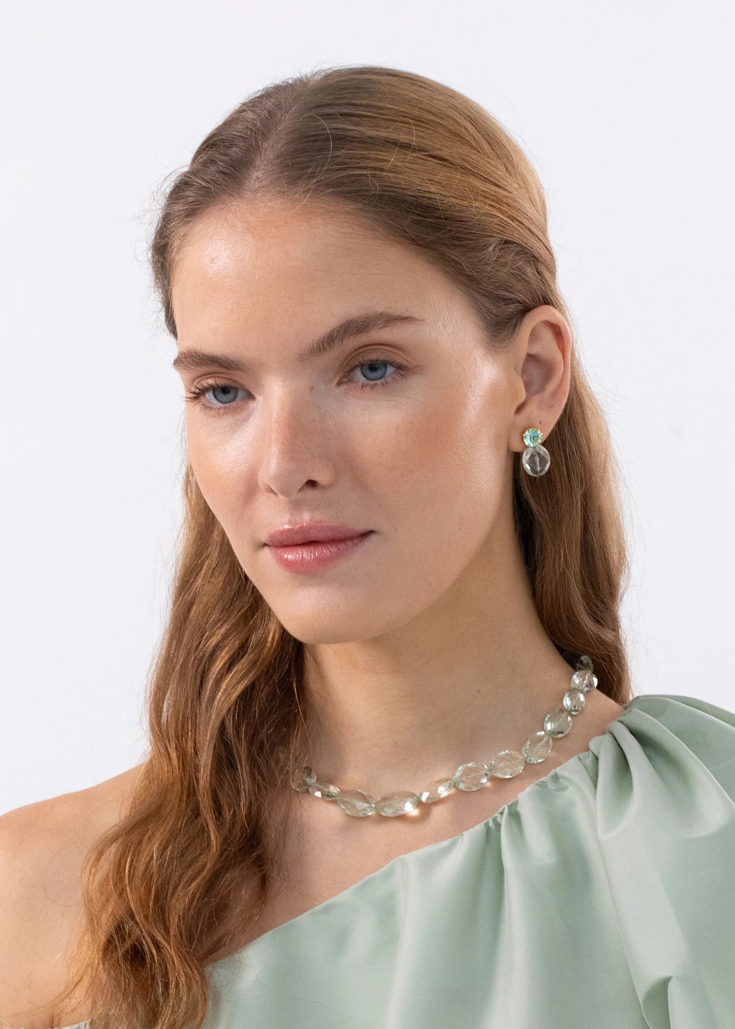 The Claire Necklace is made by hand in New York of semi-precious faceted green amethyst with a 1.5" gold plated extender with lobster clasp closure. All stones have natural variances in color and markings that make each one unique. We recommend storing necklaces in their dust bag while not in use. Avoid contact with water, perfume, and other chemicals, including hairspray and lotion, which should be used before placement on the body.