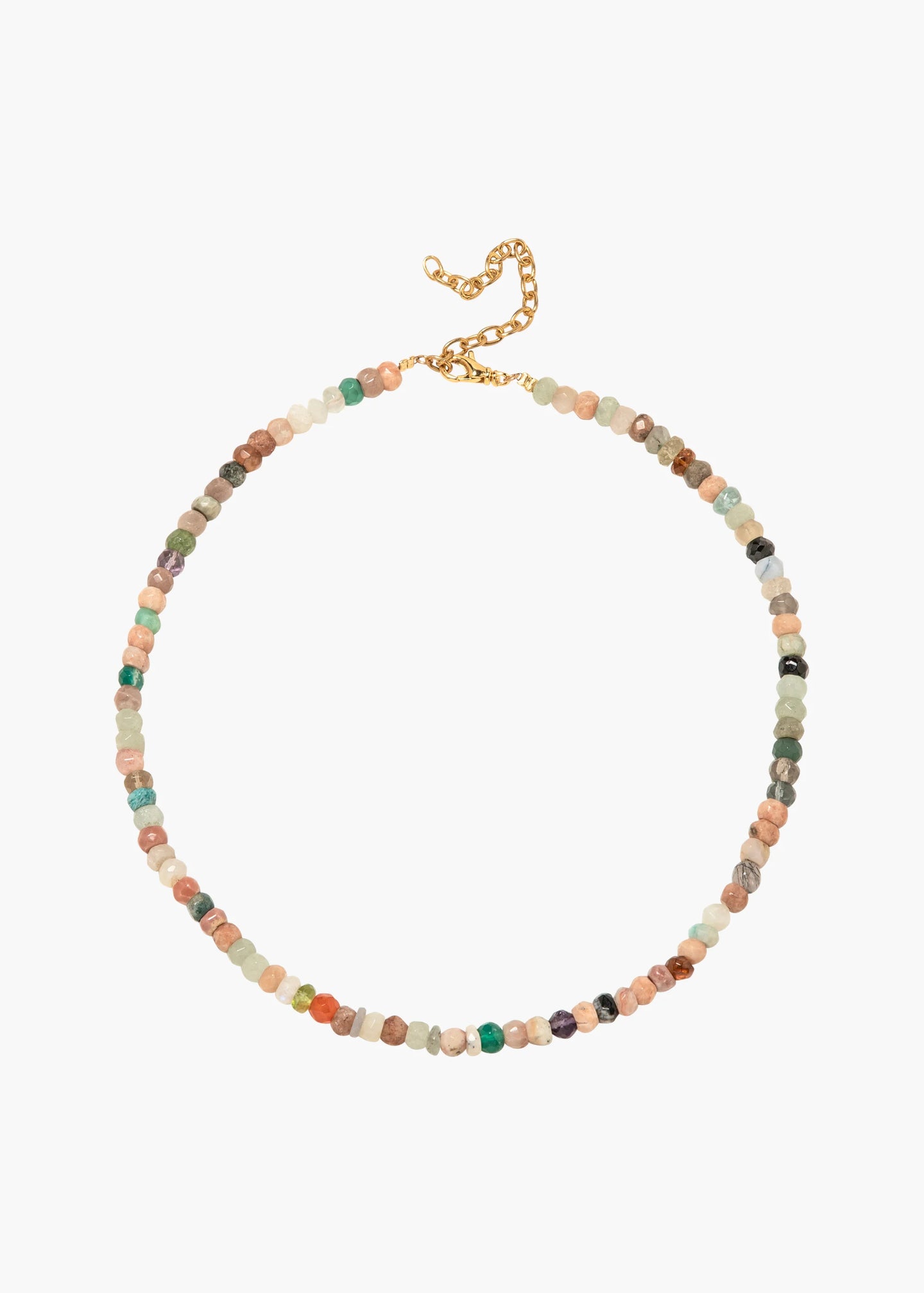 A cornucopia of our favorite gemstones, the Hannah Necklace is strung with faceted semi-precious beads, stacked together to form slices of color in unexpected combinations. Each one-of-a-kind necklace has its own unique combination of semi-precious stones, including carnelian, labradorite, turquoise, pink opal, amazonite, black spinel, tourmaline, and fire opal. Made in New York and complete with 18-karat gold-plated details, the length is adjustable with an extender chain, making this especially easy to stack and layer with other semi-precious necklaces in our collection.