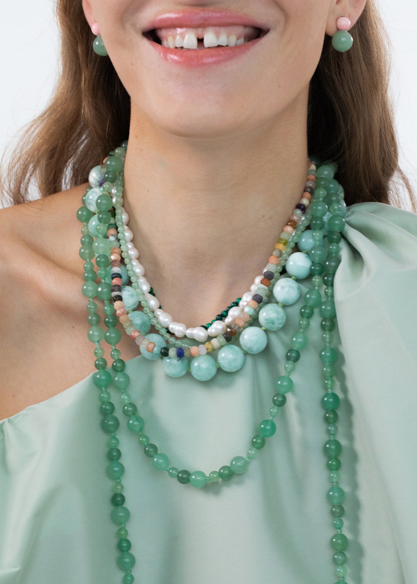 The Hannah Necklace is made by hand in New York of a mix of semi-precious beads including carnelian, labradorite, turquoise, pink opal, amazonite, black spinel, tourmaline, and fire opal, with a 1.5" gold plated extender with lobster clasp closure. All stones have natural variances in color and markings that make each one unique and each necklace will feature a different color and bead pattern. We recommend storing necklaces in their dust bag while not in use. Avoid contact with water, perfume, and other chemicals, including hairspray and lotion, which should be used before placement on the body.