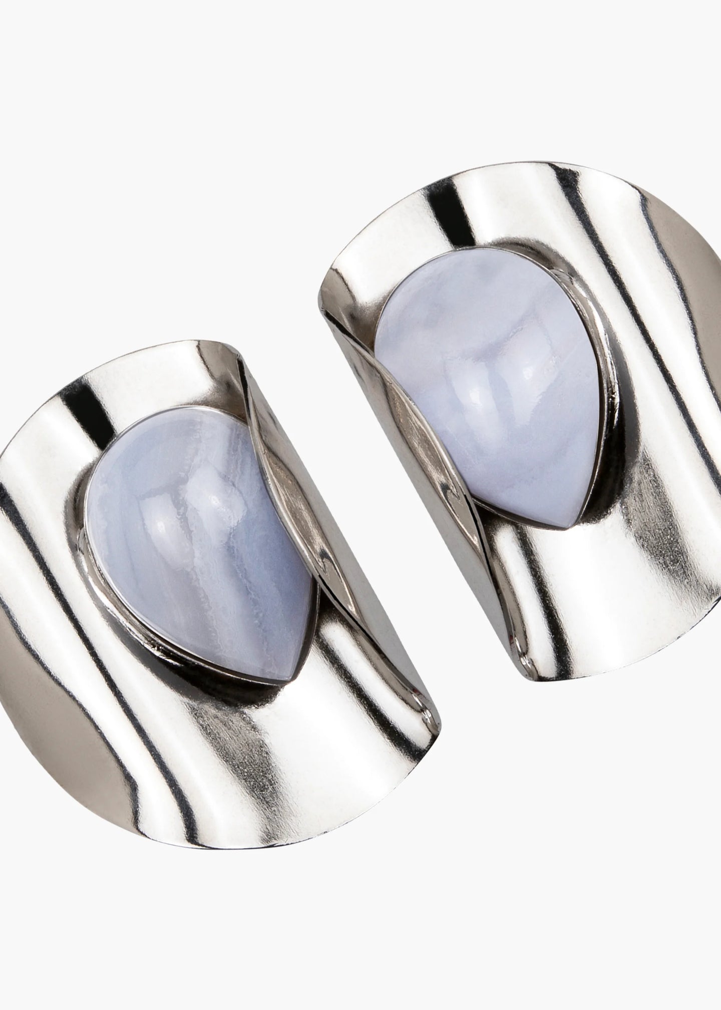 Like miniature sculptures, the Keziah Earrings combine high-shine metallics with soft, milky semi-precious gemstones. Made by hand in New York, the 18-karat gold or rhodium-plated discs are scrupulously hand-formed to create an organic wave shape. Each is set with a pear-cut jade or blue agate stone.