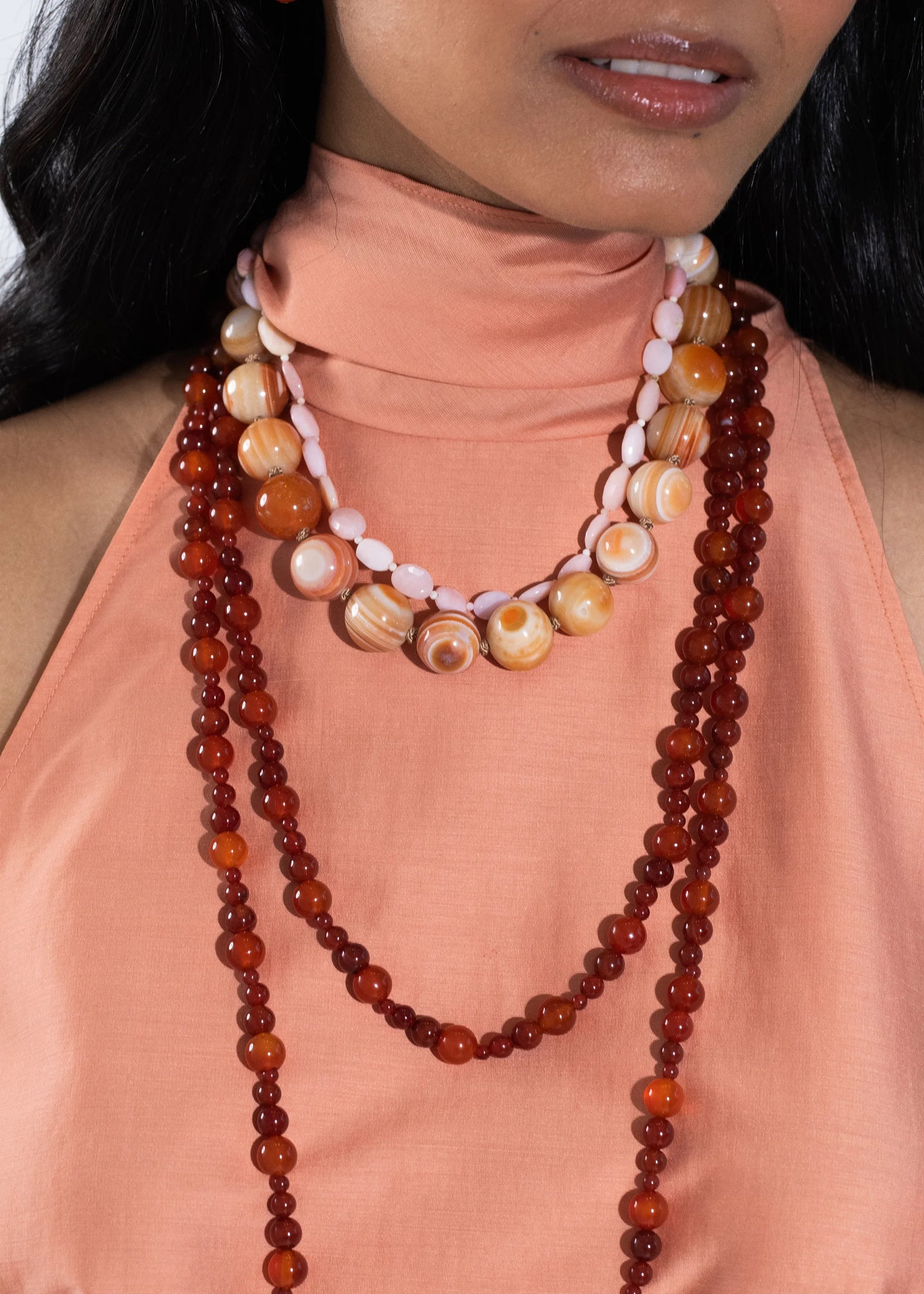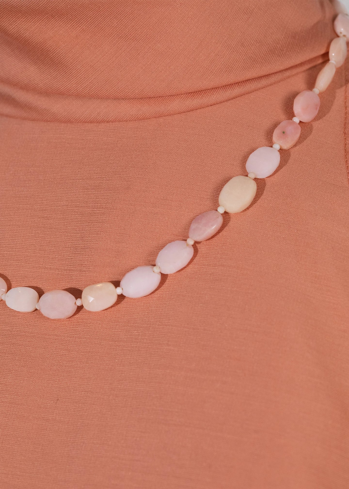 Strung with semi-precious pink opal stones, the Samantha Necklace is designed to highlight the stones' range of color that we love so much. The pink opal material—different from a standard opal—was carefully chosen, providing more interesting color variation than one would typically see, calling to mind the inside of a seashell. Made by hand in New York and complete with 18-karat gold-plated details, the length is adjustable thanks to an extender chain, making this especially easy to stack and layer with other semi-precious necklaces in our collection.
