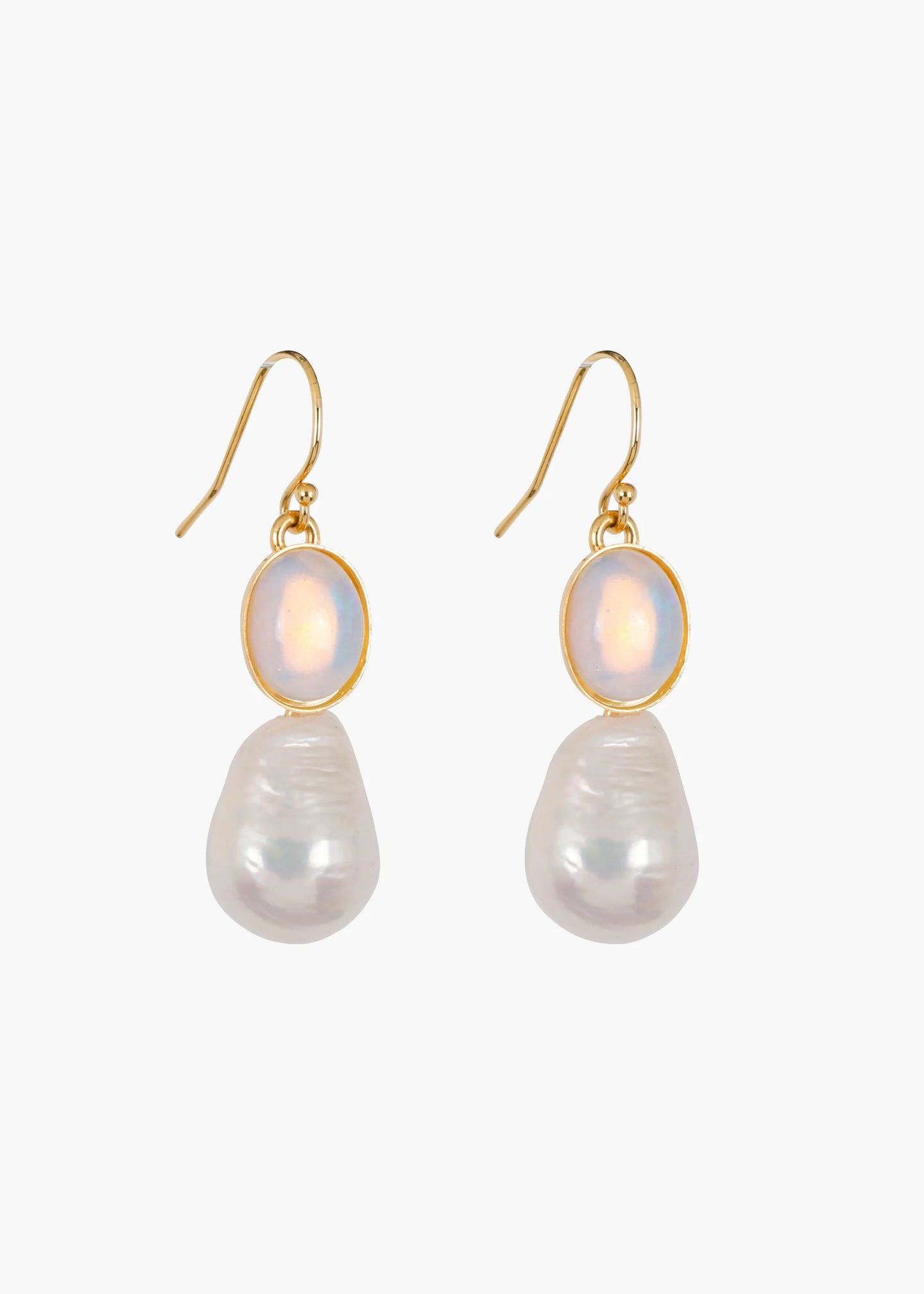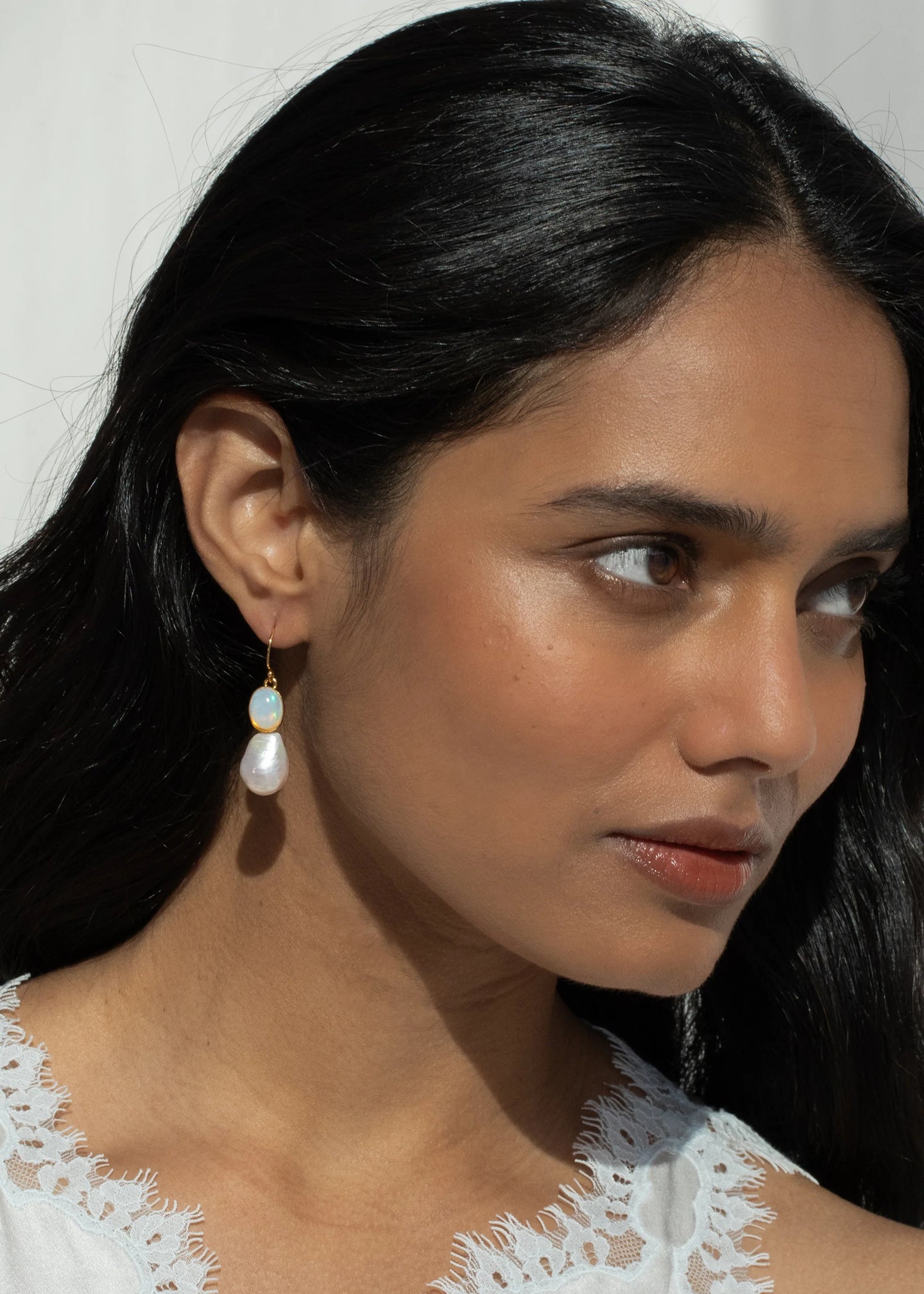 Opal and freshwater pearl are kindred spirits— a shared luminescence, each one making the other shine brighter. This ethereal combination inspired the Tatum Earrings, comprised of semi-precious opal, a gemstone known for amplifying positivity, and freshwater pearl, which we love for its organic shape and natural iridescence. Made by hand in New York, incorporating fine jewelry materials and techniques, they sit on a gold-filled ear wire— pair them with the opal Claire Necklace to complete the look.