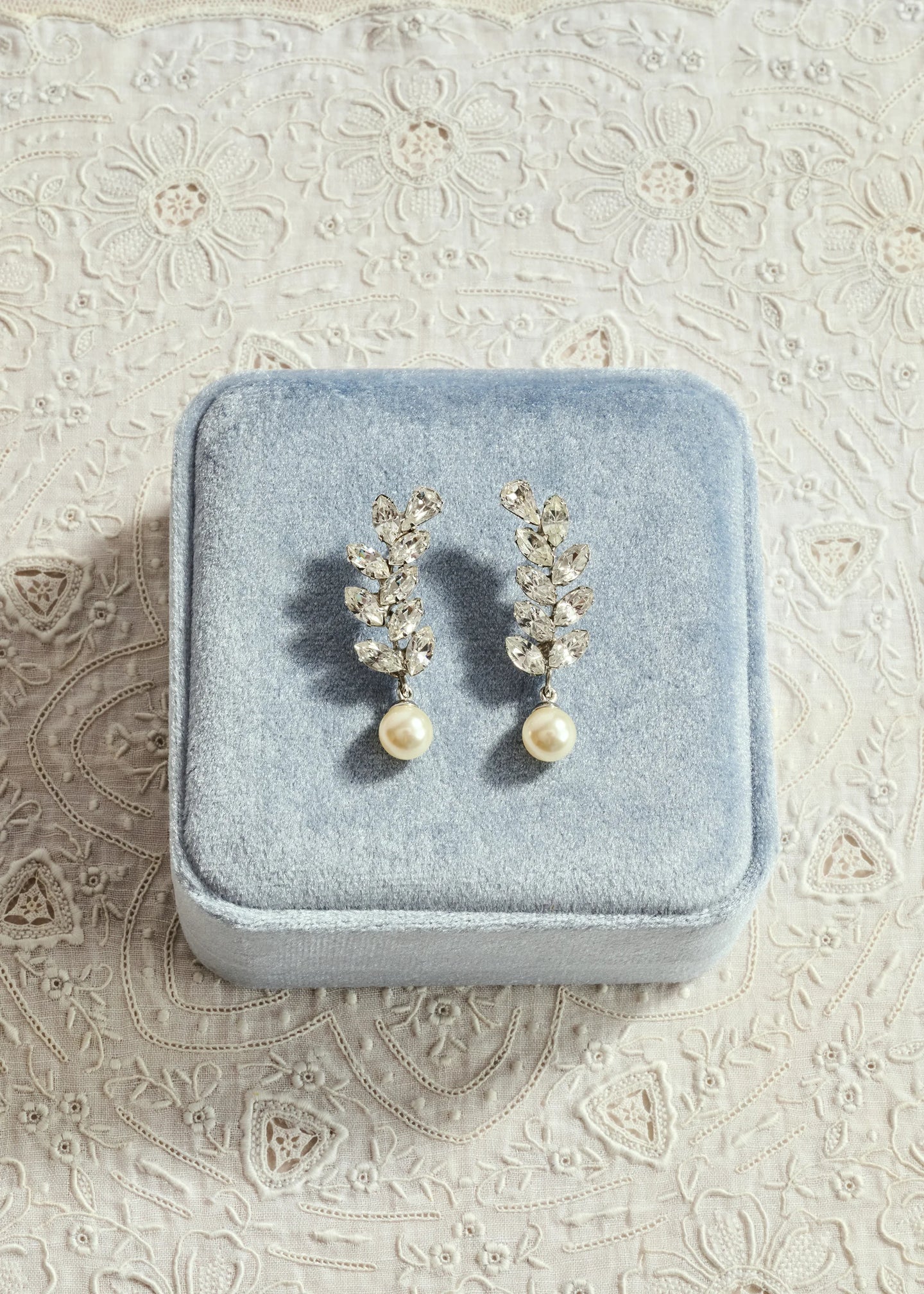 The Verla Earrings are made by hand in New York, from rhodium plated brass, crystals, and crystal pearls. They have a surgical-steel post, are nickel-free, and safe for sensitive skin. We recommend storing earrings in their dust bag while not in use, and avoiding contact with water, perfume, hairspray, and other chemicals.