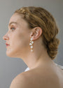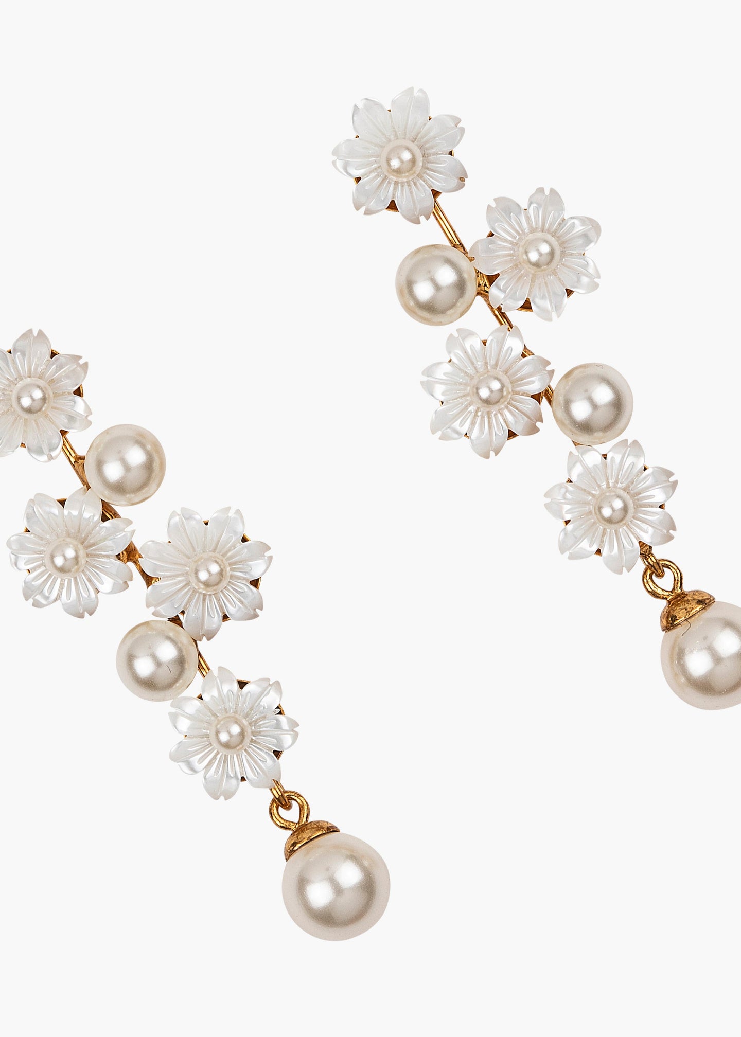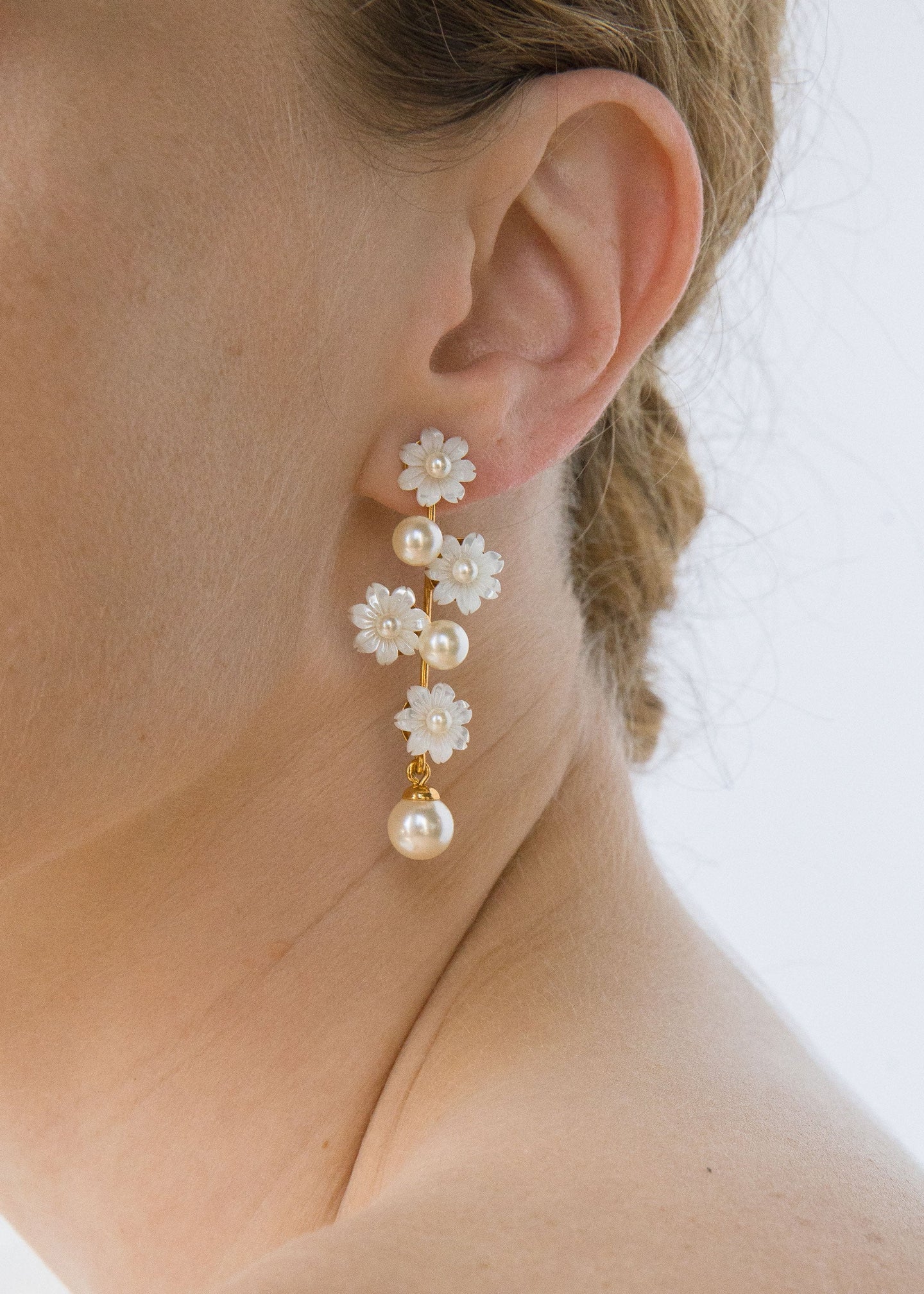 The Calissa Earring is a dainty, dangling style, comprised of small hand-carved mother of pearl flowers and crystal pearls. We love mother of pearl for its natural iridescence, and the magical way it catches the light. Combined with the graceful movement of these drops, it creates a flattering glow you won't want to be without.
