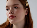 The Sariyah Headband forms a halo with three rows of sculptural flowers. The flexible headband base disappears into the hair, so that these blooming florals appear to be floating in the hair. For even more glow, pair this style with the coordinating Pansy Earrings.