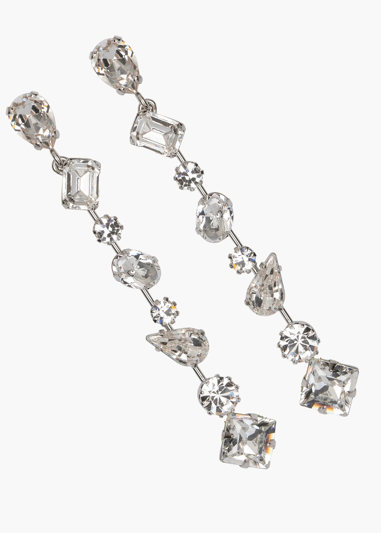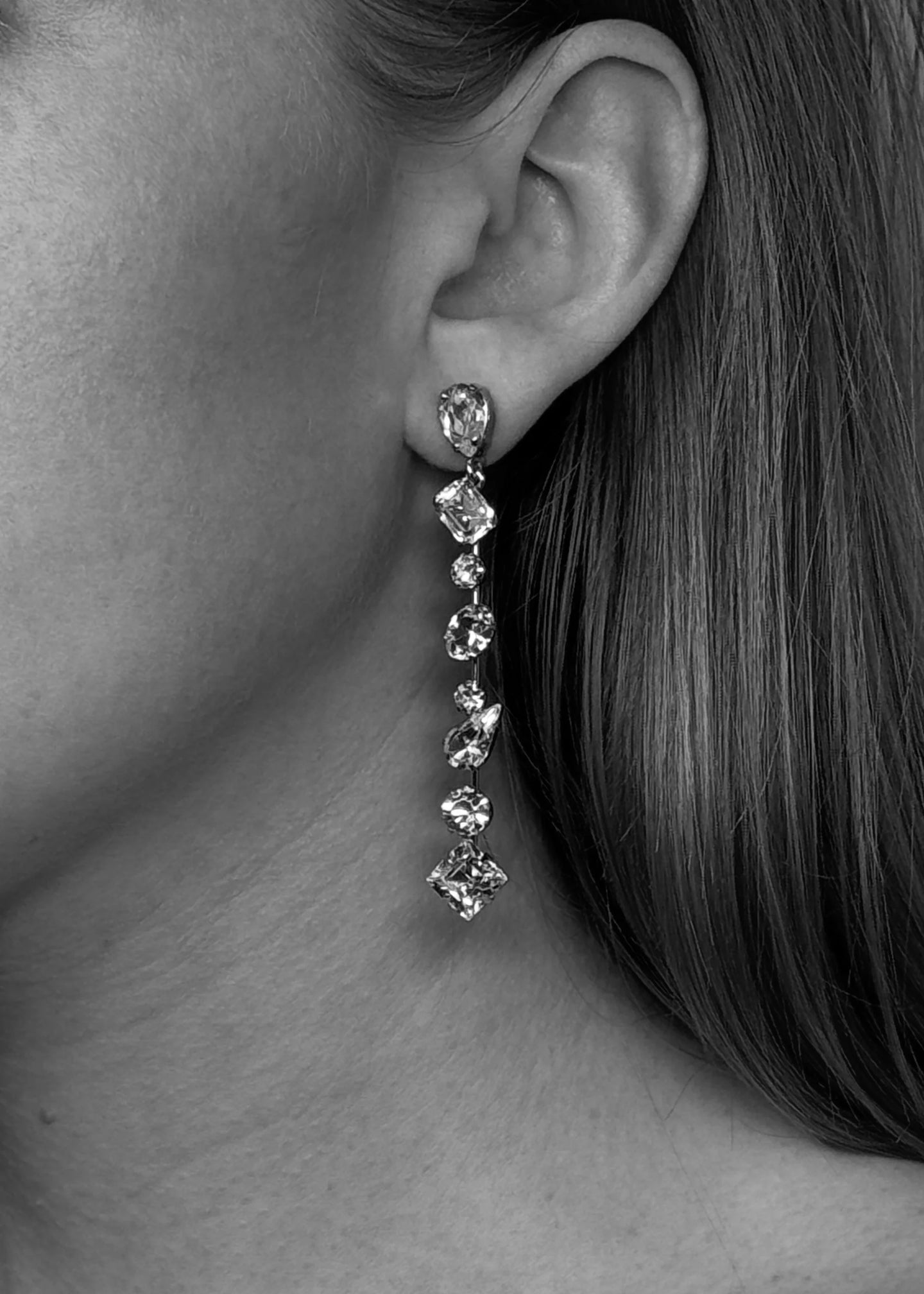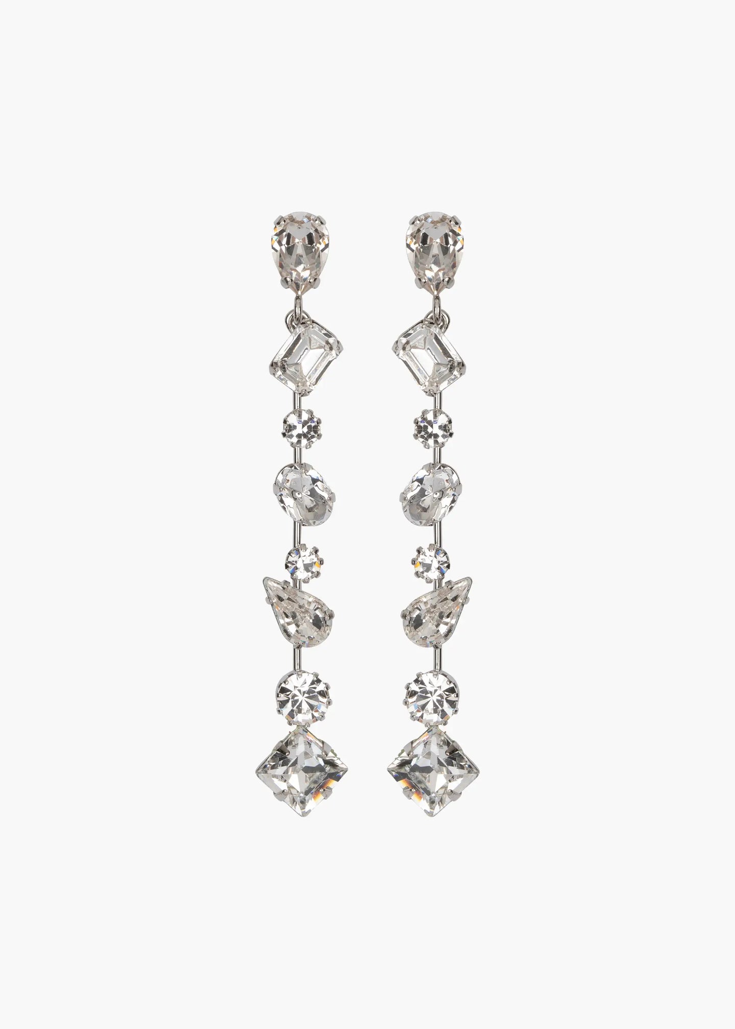 The Lourdes Earrings deliver a striking, modern sparkle. Crafted with a sleek rhodium finish, this linear silhouette features alternating Czech crystals in mixed cuts—each one catching the light in its own unique way. The varied shapes create a refined sense of movement, while the surgical steel post offers comfortable, effortless wear. Elegant, dimensional, and endlessly versatile, they’re a luminous finishing touch for day or night. Dimensions: 2 7/8in x 3/8in
