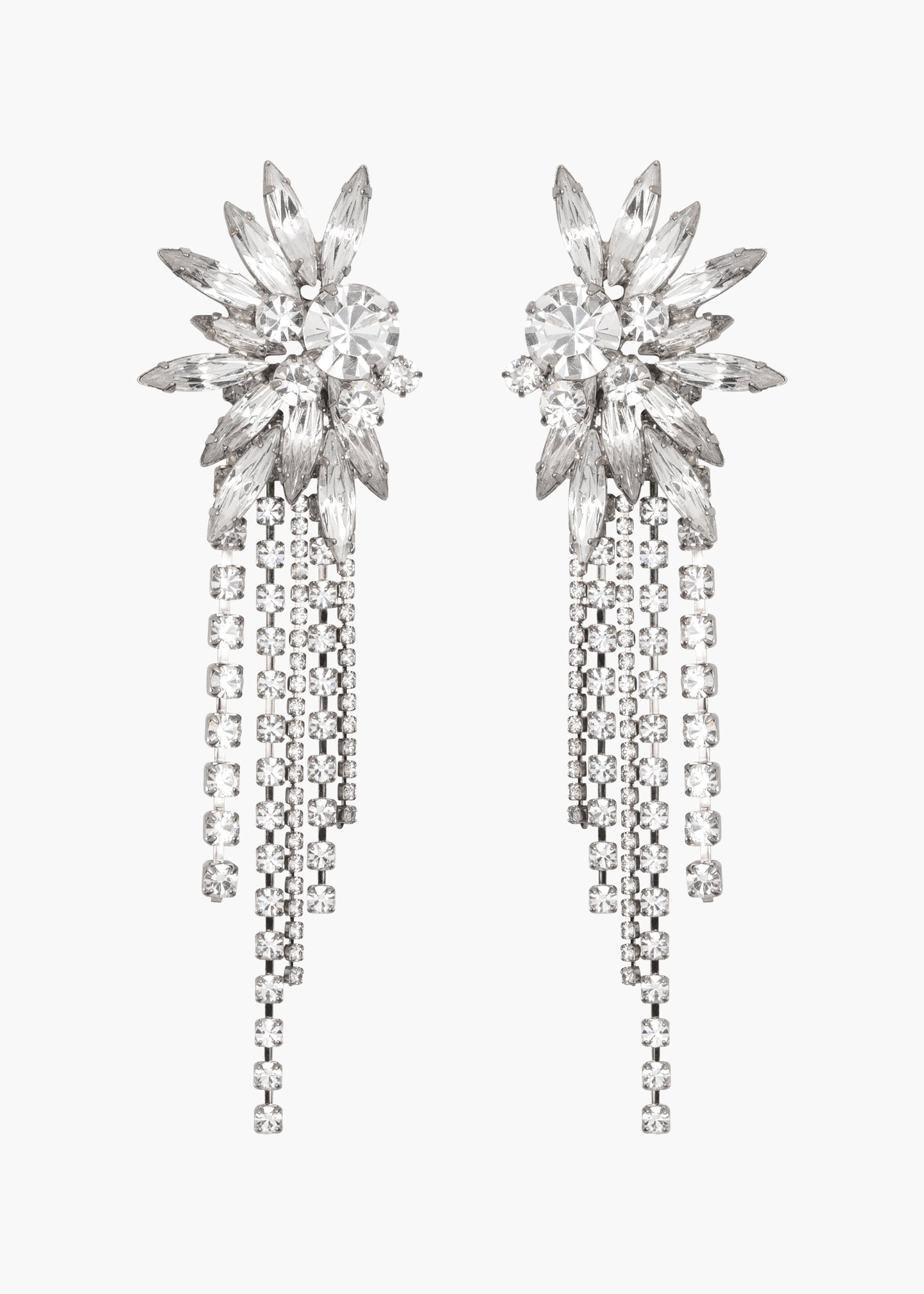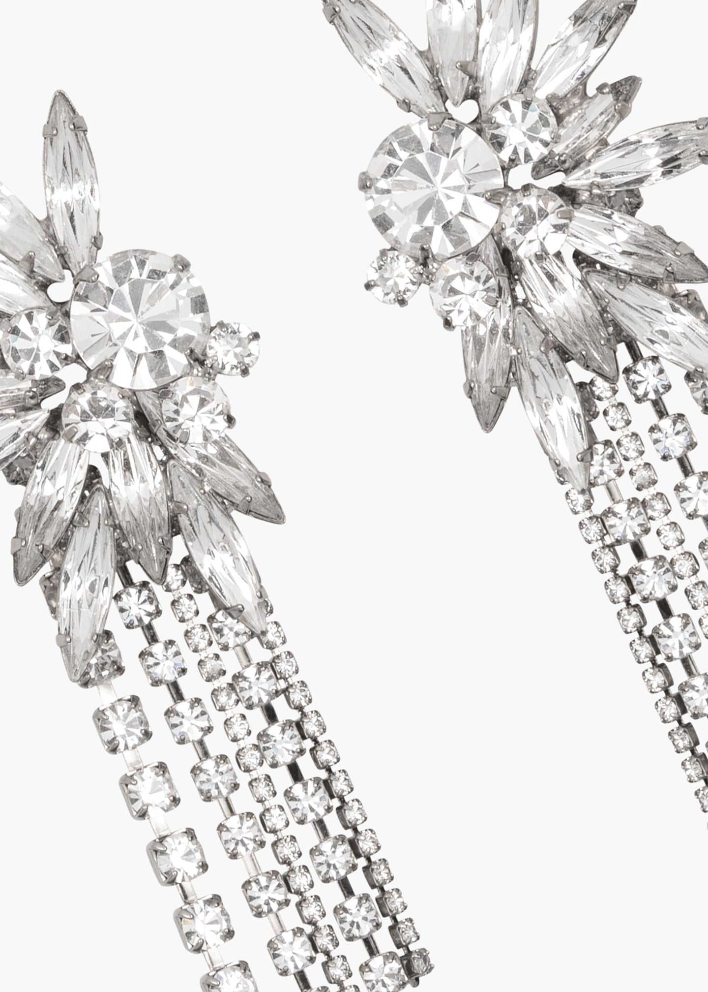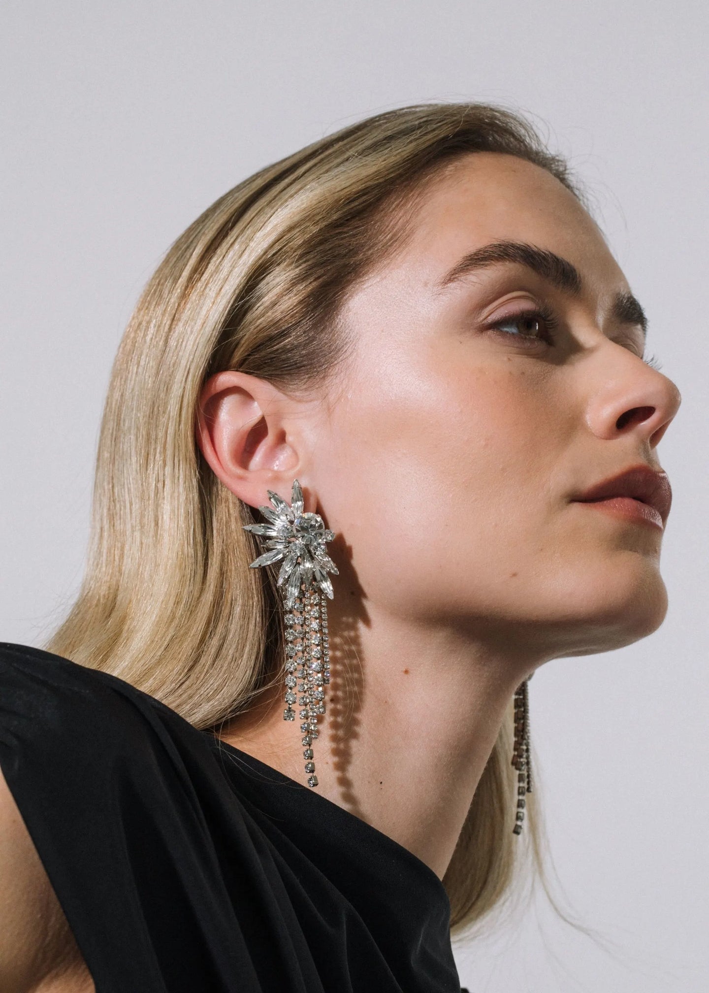 Featuring a graphic crystal starburst with cascading fringe, the Shantalle Earrings leave all eyes on you. Made by hand in New York of fine Austrian crystals, the brilliant spears frame the face in a halo of light. The crystal chain fringe adds movement for endless drama.