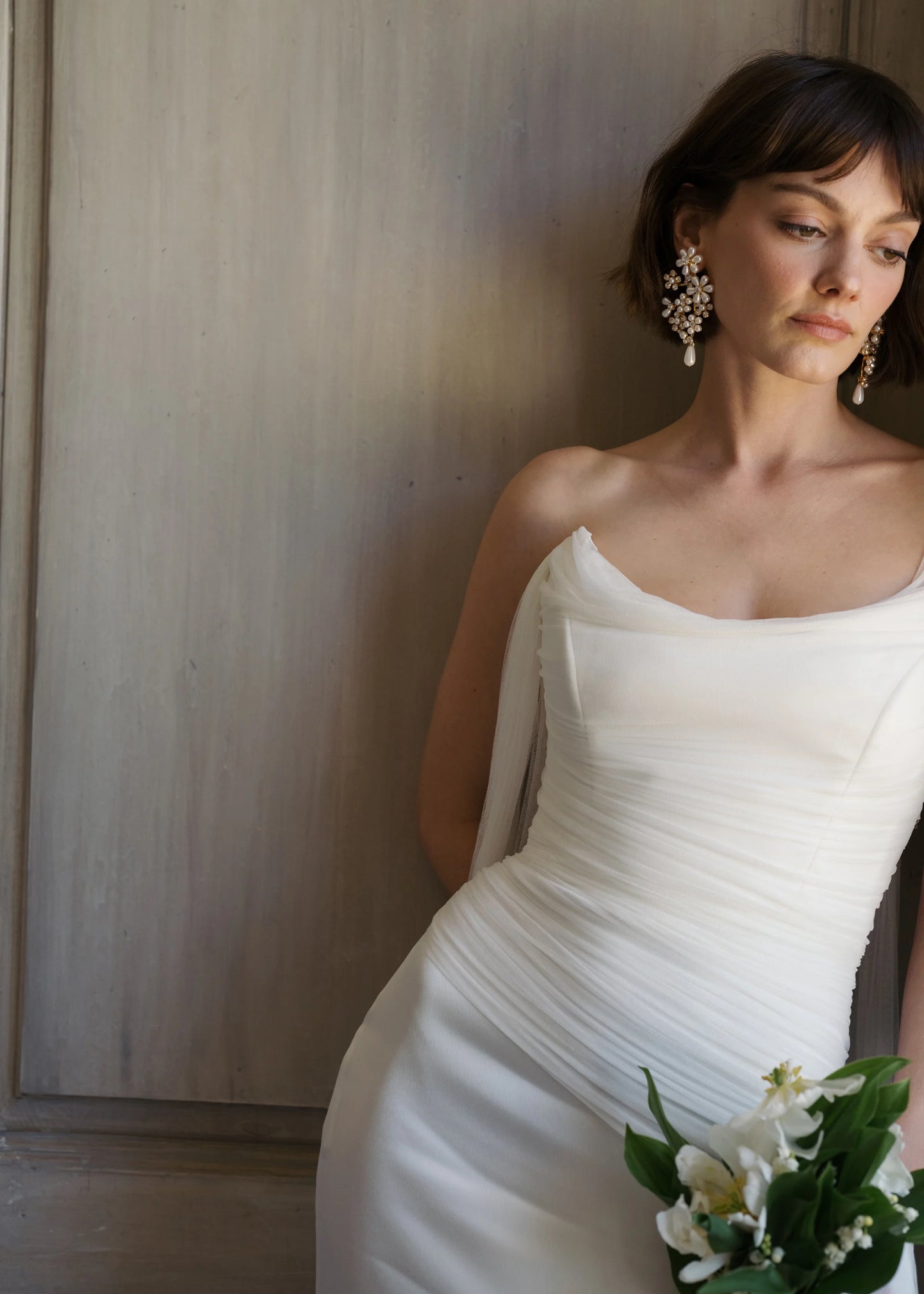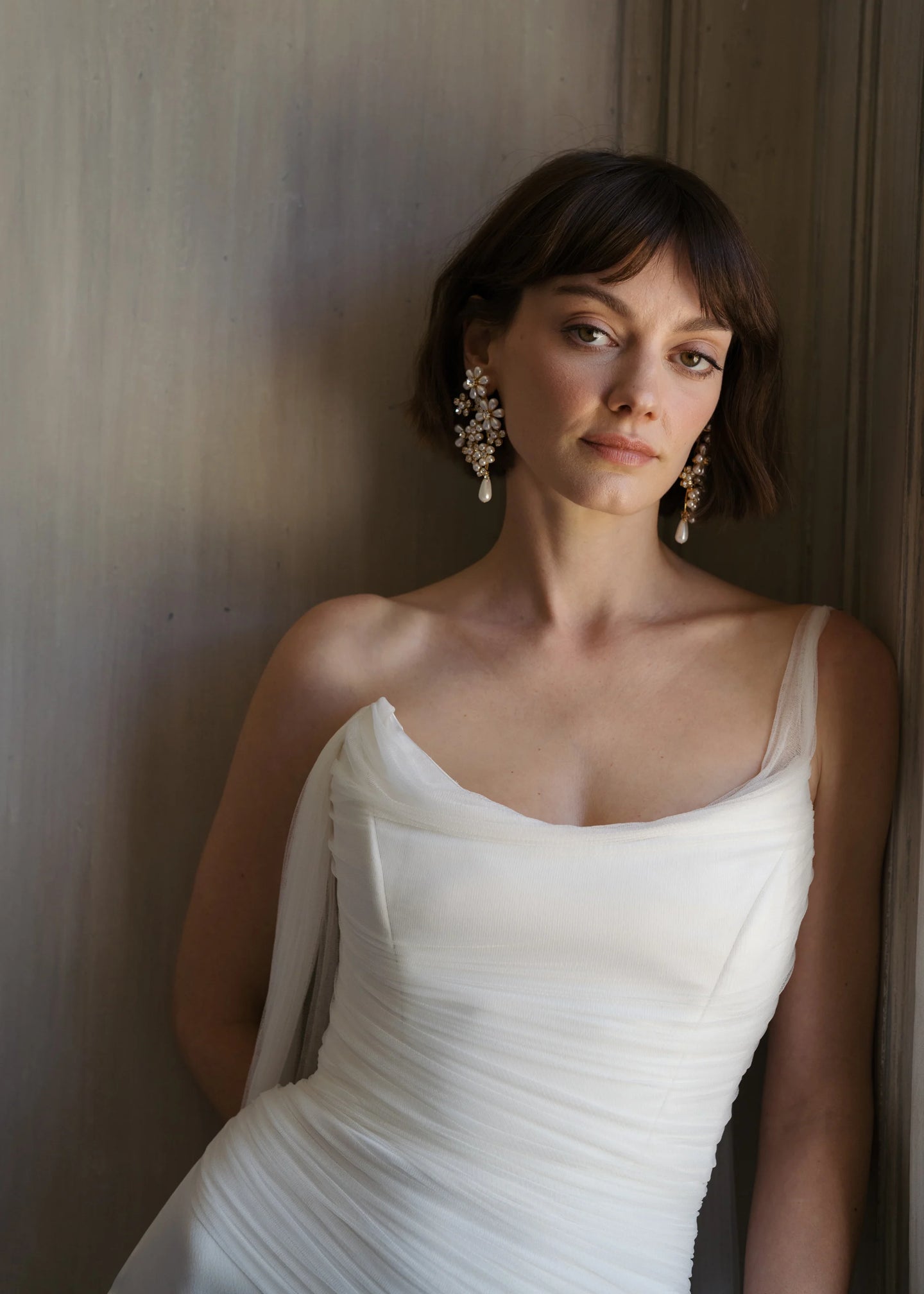 The Ursella Earrings are made by hand in New York, from 18K gold or rhodium plated brass, crystals, and crystal pearls. They have a surgical-steel post, are nickel-free, and safe for sensitive skin. We recommend storing earrings in their dust bag while not in use, and avoiding contact with water, perfume, hairspray, and other chemicals.