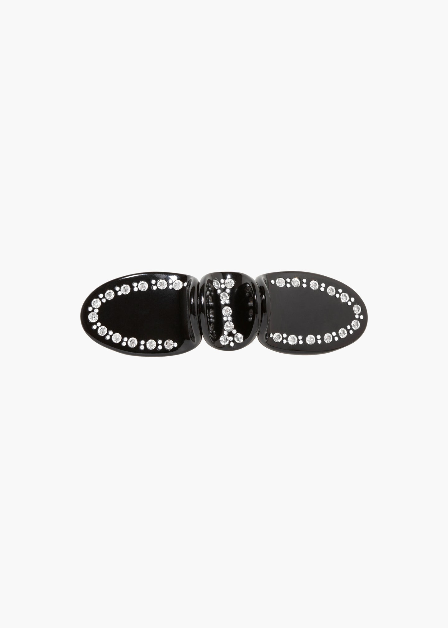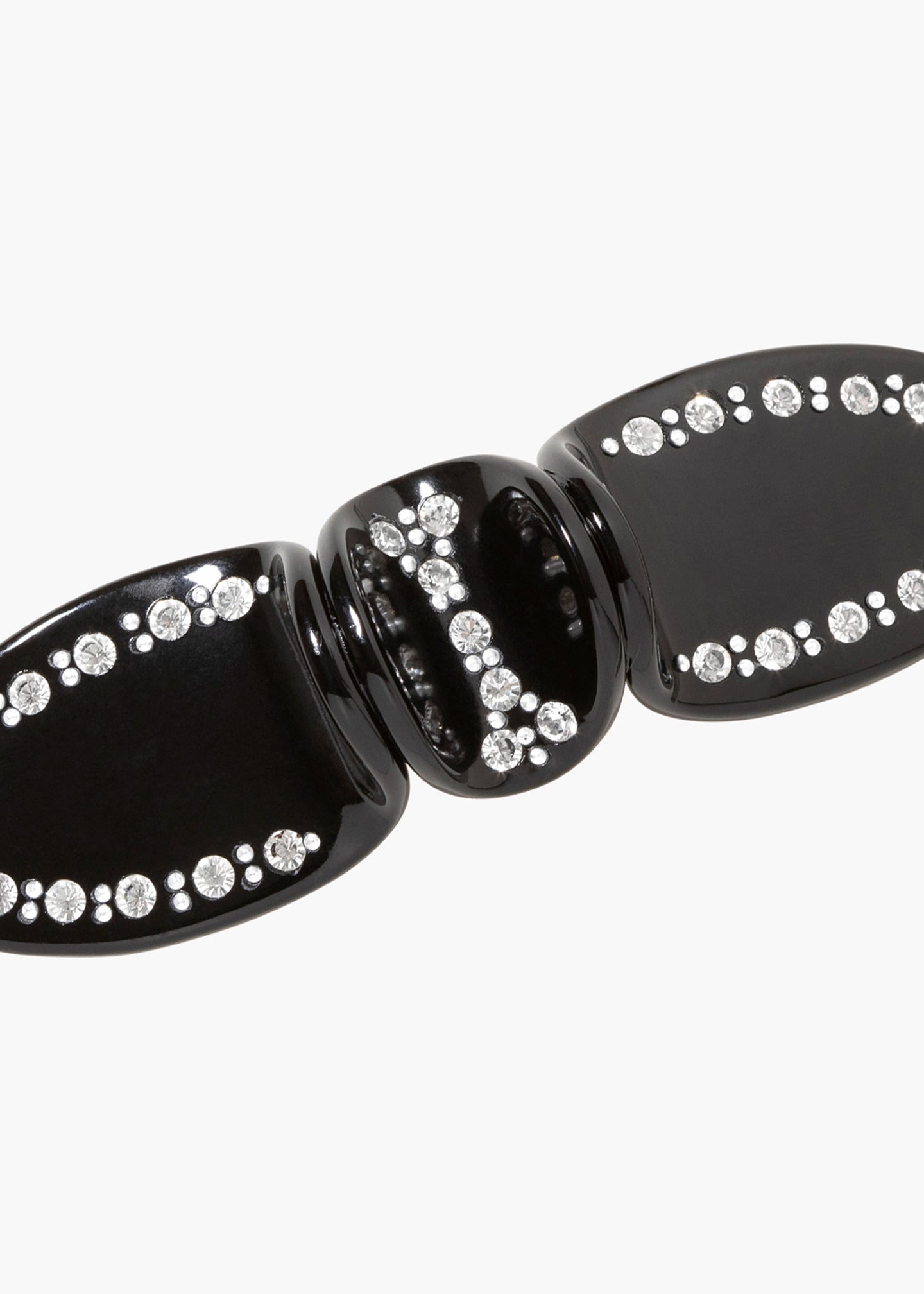 Made in France between the 1920s and 1950s, the one-of-a-kind Gladys Vintage French Barrette speaks to the quality of French hair accessories from this era. The cellulose acetate features inset Austrian crystal, emphasizing the graphic shape. It's finished with an automatic French barrette clasp for easy and secure placement in any hairstyle.