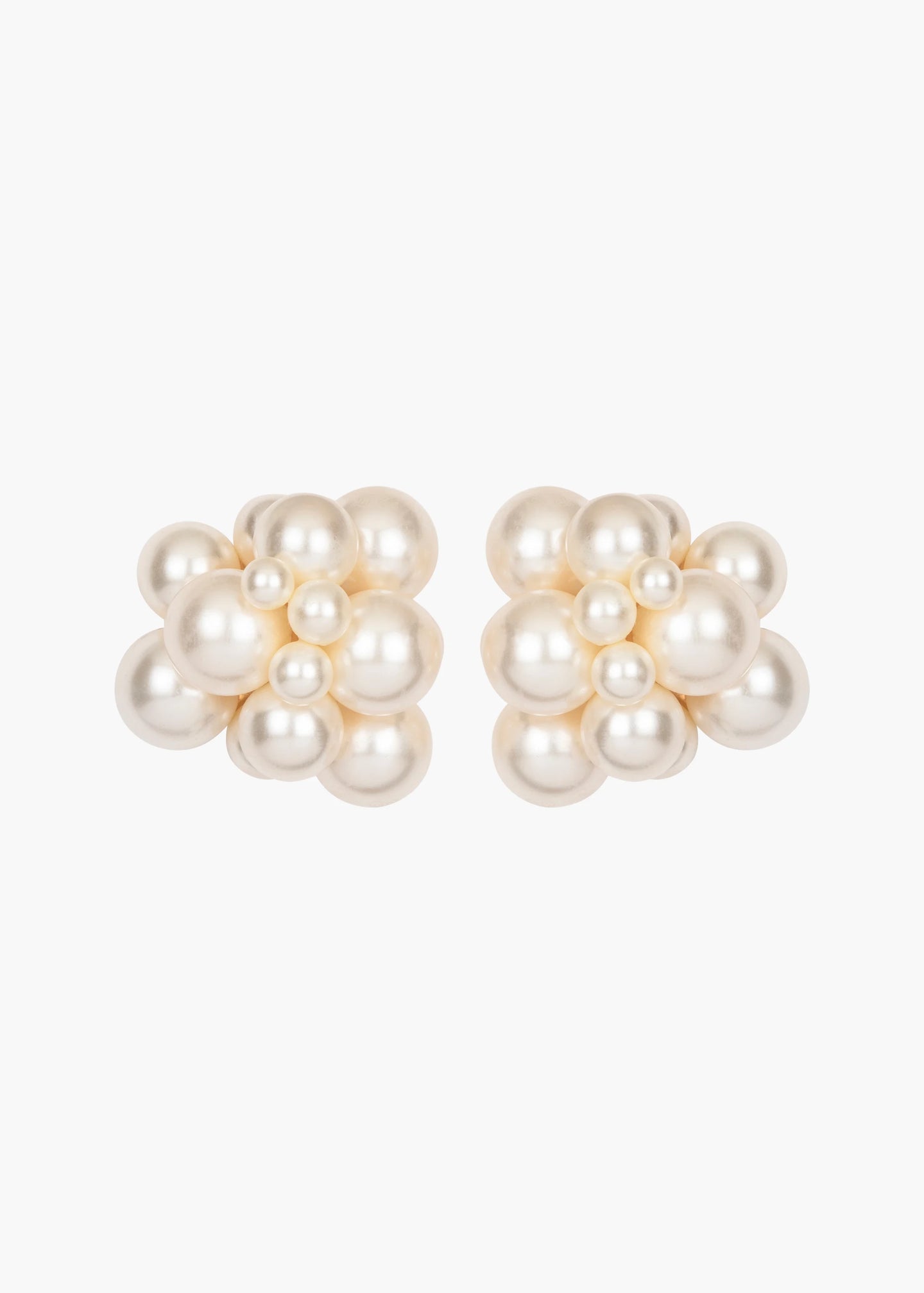 The Paula Earrings are a modern nod to classic pearls, arranged in a clustered silhouette that feels sculptural and fresh. Each earring features a mix of Czech crystal pearls in varying sizes, creating soft dimension and a luminous, full-bodied glow. Set in an 18k gold–plated base, they’re an effortless statement—elevated, elegant, and endlessly wearable. Dimensions: 1 3/8in x 1 3/8in