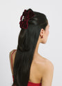 The Matilda Jaw Clip is made by hand in New York of velvet ribbon, with an acrylic resin claw clip. We recommend treating this clip as you would a piece of jewelry, and storing in the dust bag when not in use. Avoid contact with water, perfume, and other chemicals, including hairspray, which should be used before placement in the hair.