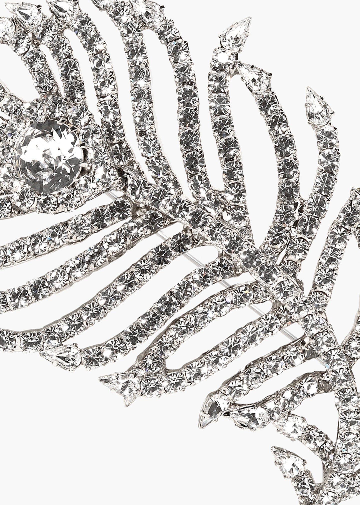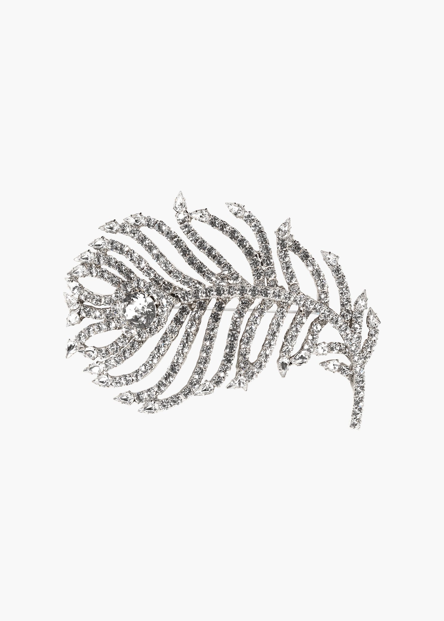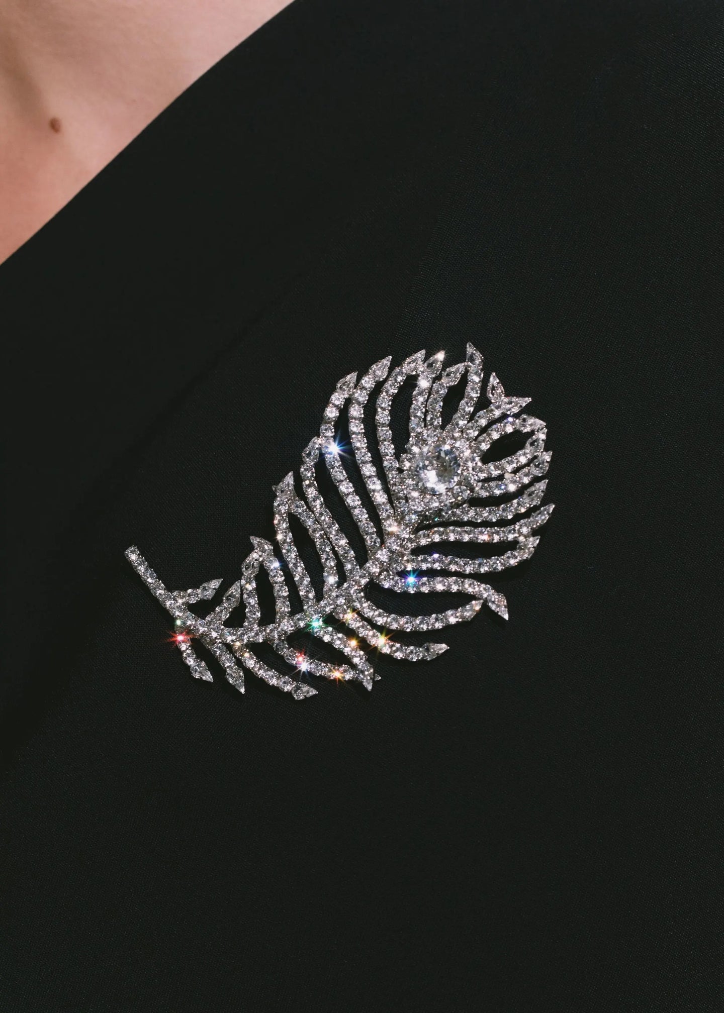 The Pluma Brooch is made by hand in New York of of Austrian crystals with a steel brooch pin closure plated in rhodium. We recommend storing brooches in their dust bag while not in use, and avoiding contact with water, perfume, hairspray, and other chemicals.