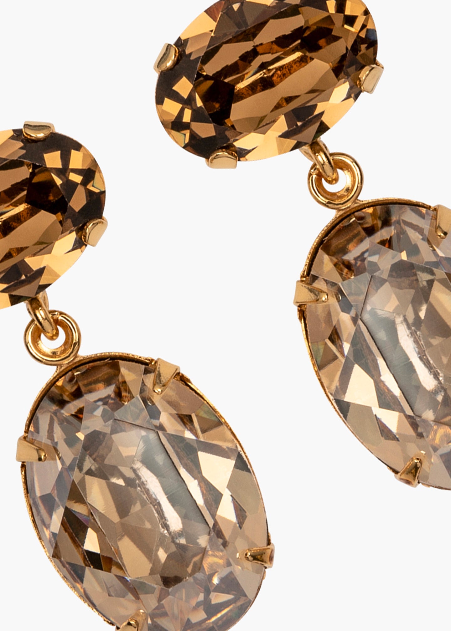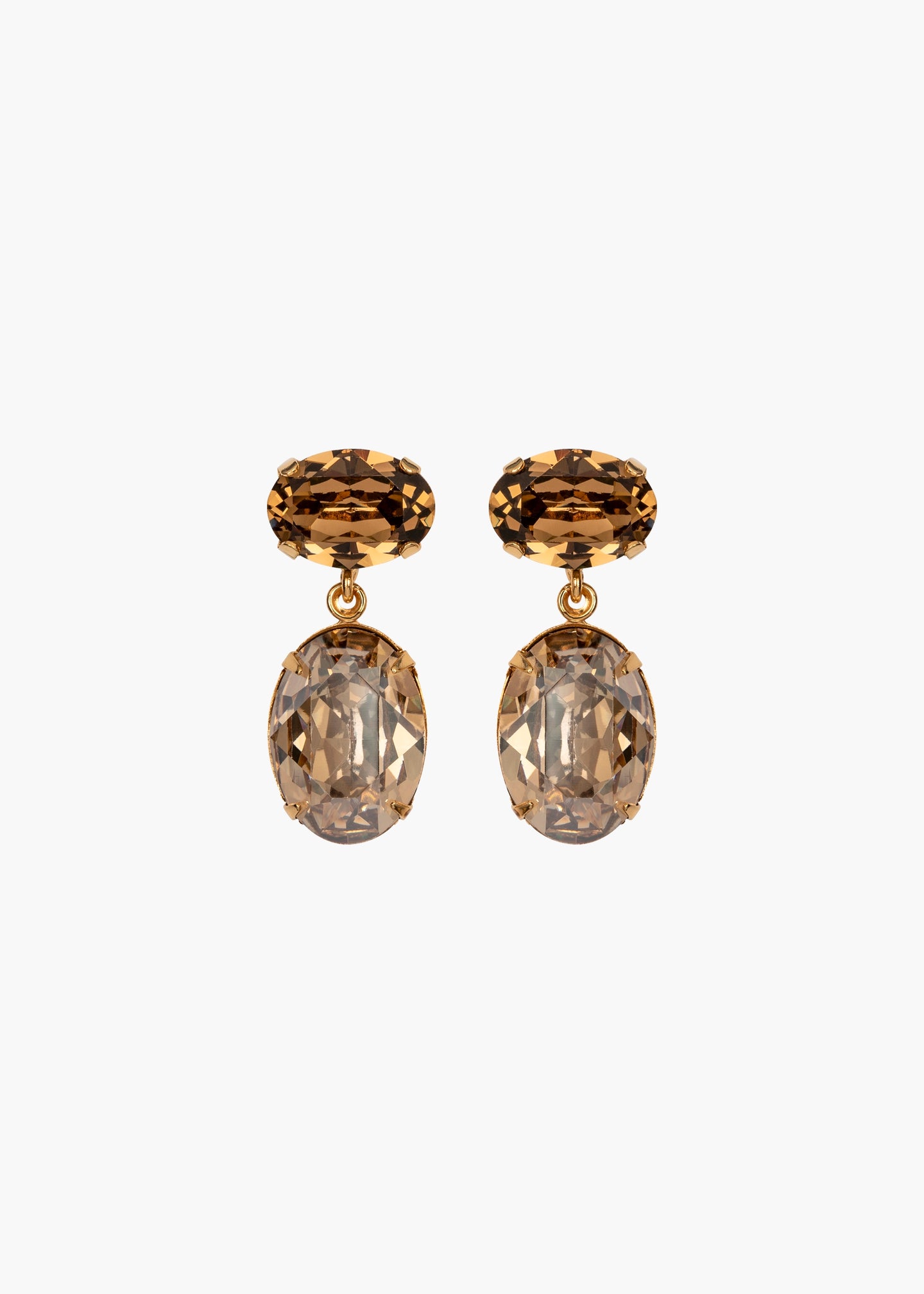 The Lenora Earrings are made by hand in New York from Austrian crystals and 18k gold plated brass. They have a surgical-steel post, are nickel-free and safe for sensitive skin. We recommend storing earrings in their dust bag while not in use, and avoiding contact with water, perfume, hairspray, and other chemicals.