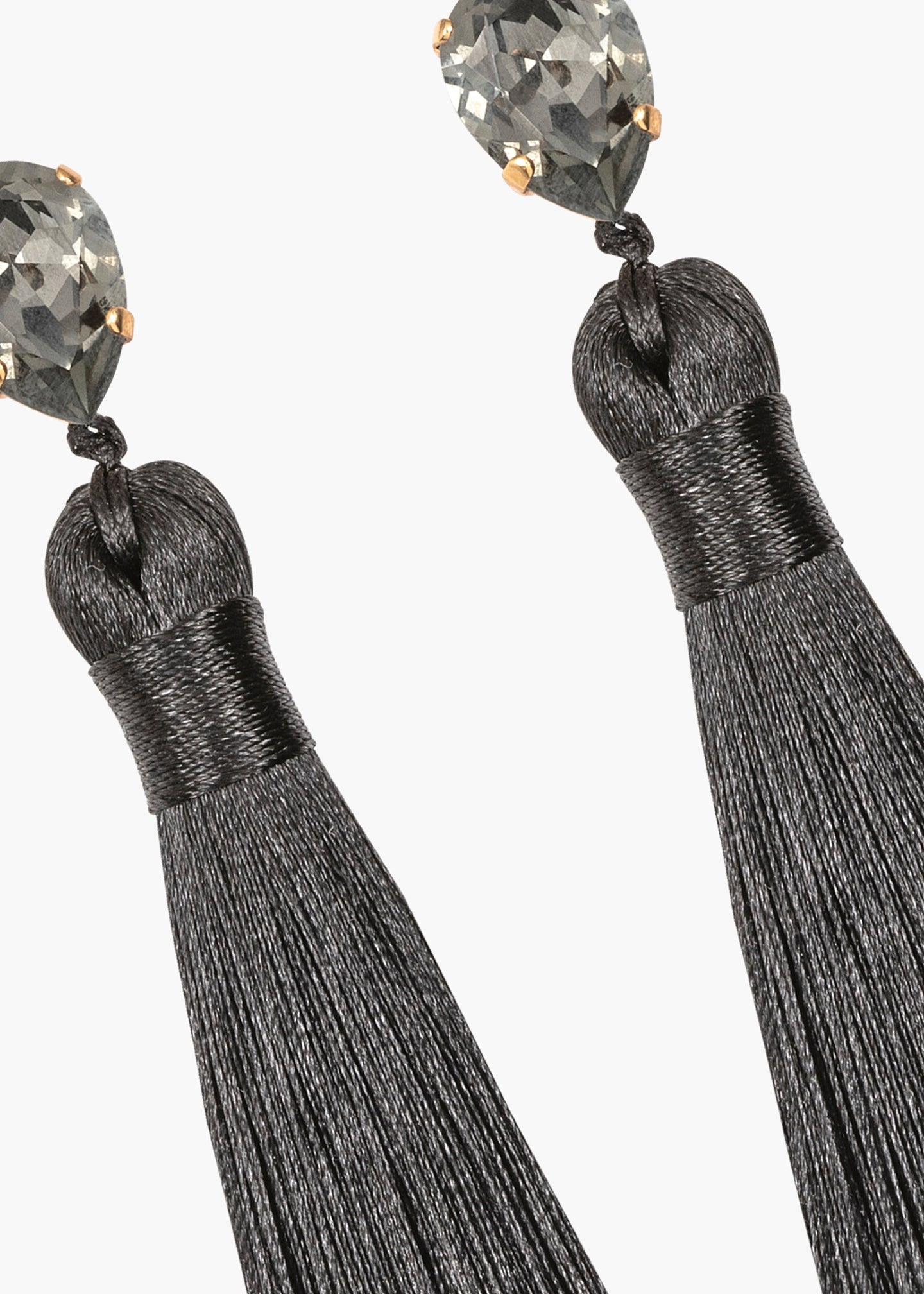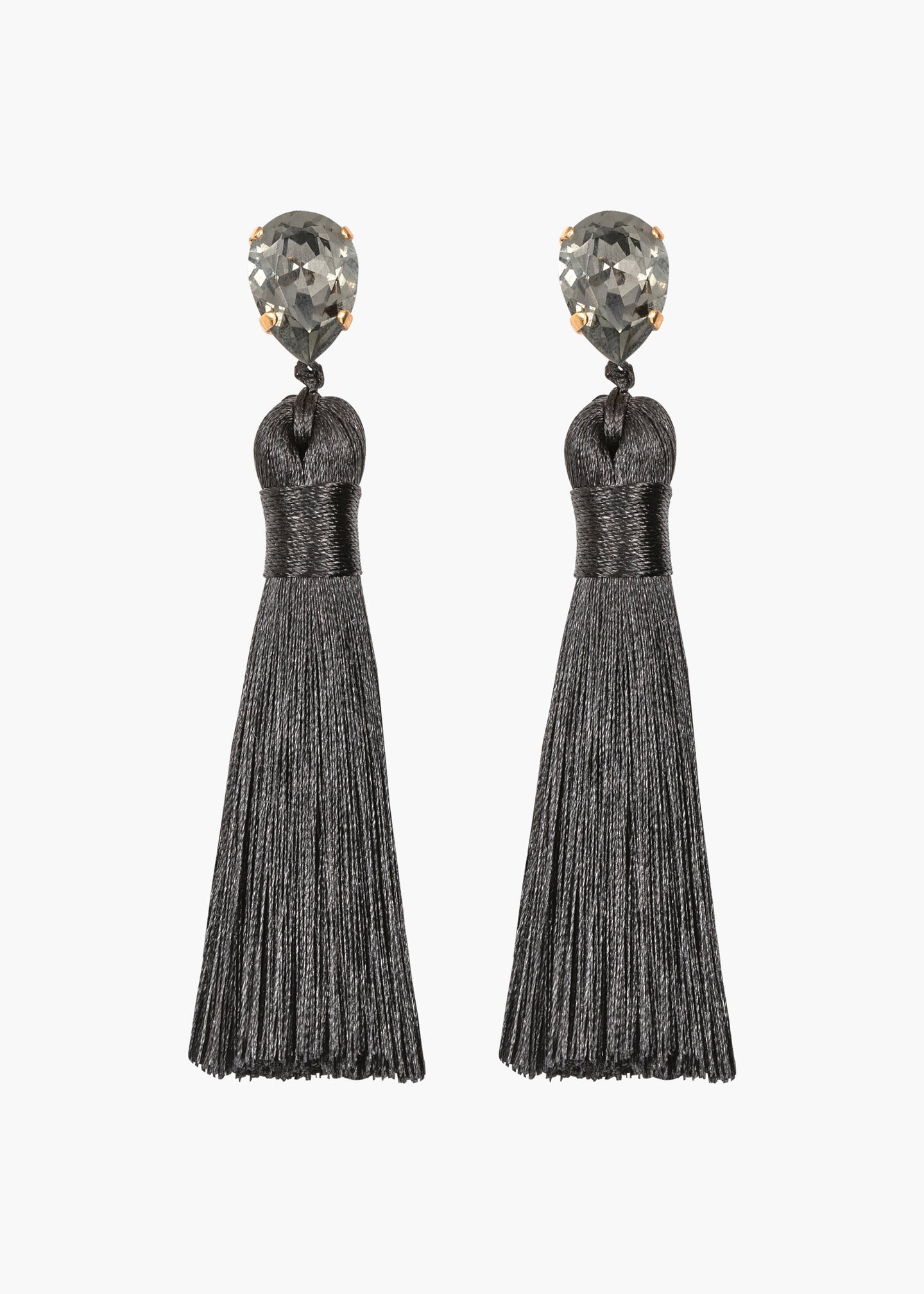 The Francine Earrings reference Art Deco interiors, with lush tassels and rich crystal accents for supreme drama. Made by hand in New York, satin tassels are suspended from pear-cut Austrian crystals. Despite their shoulder-grazing length and noteworthy movement, these earrings are exceptionally lightweight and comfortable to wear. Dimensions: 4.25" length