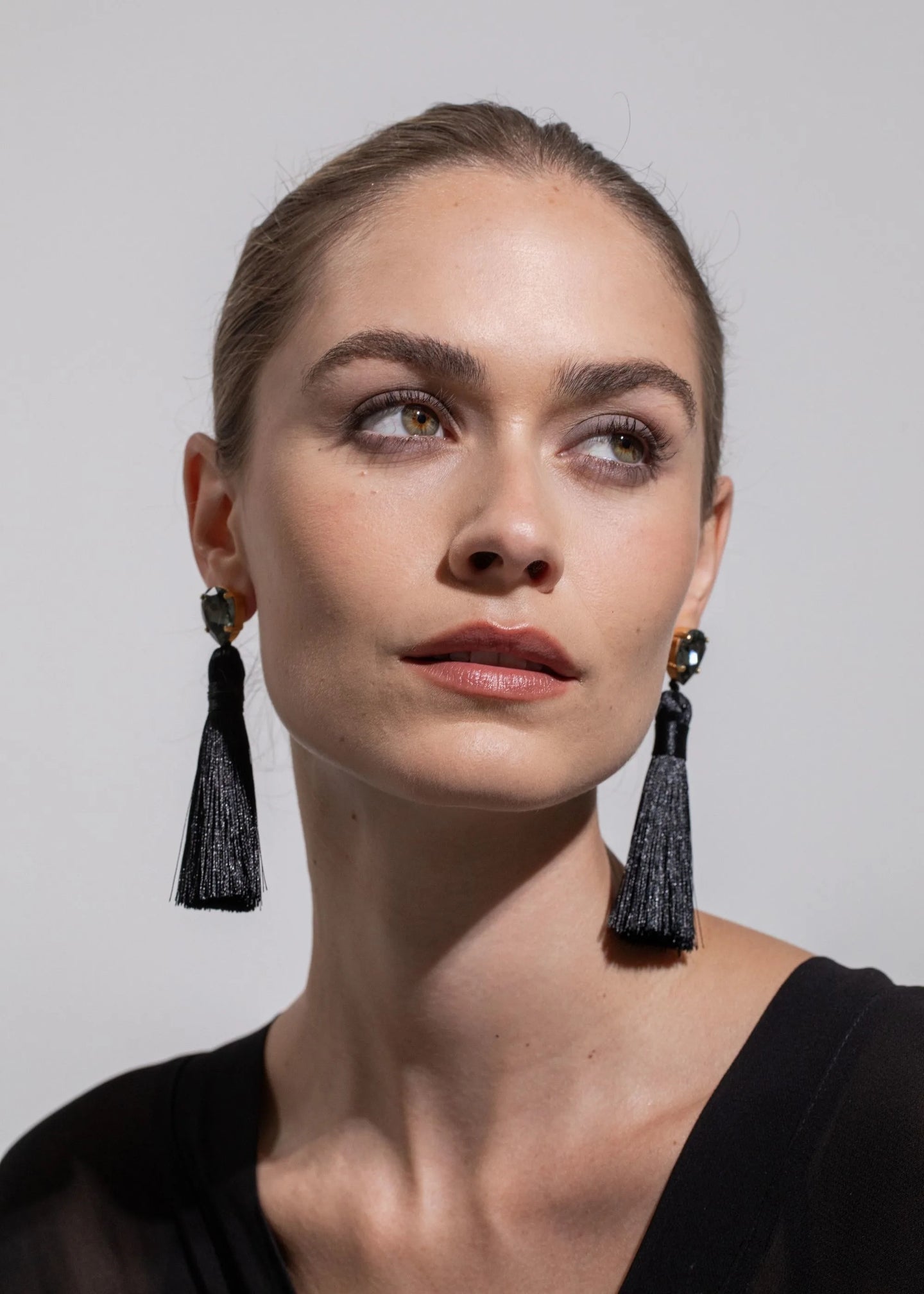 The Francine Earrings are made by hand in New York from Austrian crystals, hand-made silk tassel dangles, and 18k gold plated brass. They have a surgical-steel post, are nickel-free and safe for sensitive skin. We recommend storing earrings in their dust bag while not in use, and avoiding contact with water, perfume, hairspray, and other chemicals.