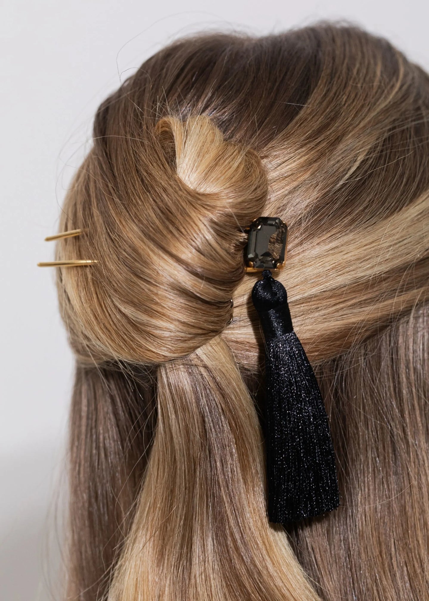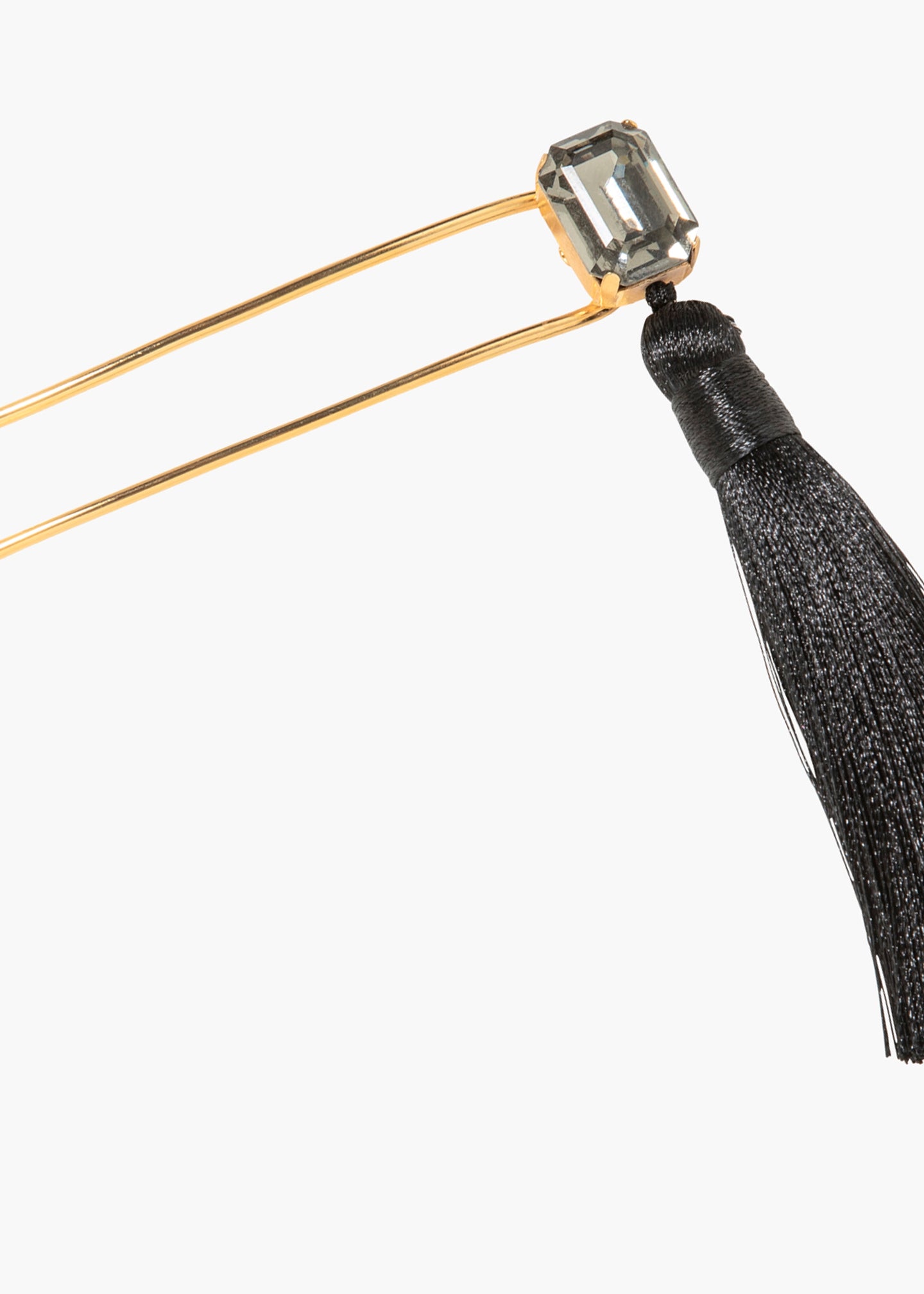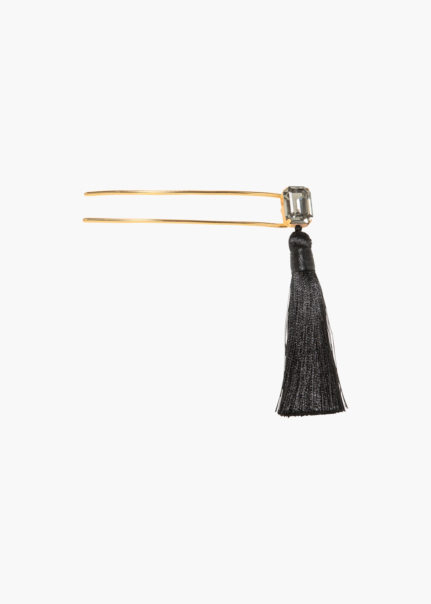 An undeniably fun way to sweep hair back, the Francine Hairpin features an emerald-cut Austrian crystal and a handmade satin tassel. Made by hand in New York, the movement of the tassel gives this piece personality. It's grounded by an 18-karat gold-plated hairpin designed to firmly hold twisted hair in place. Dimensions: 4" tasse;, 4" hairpin