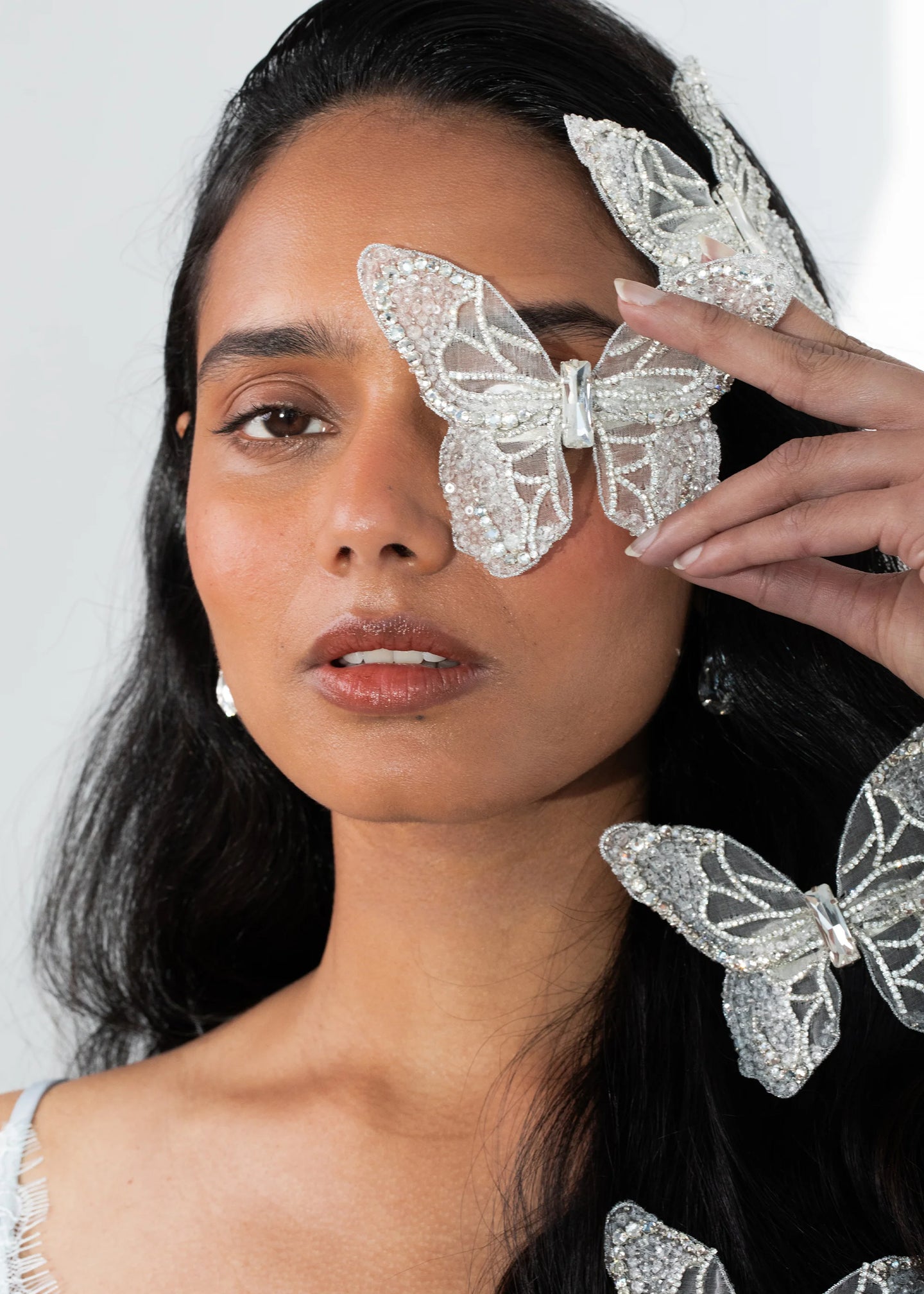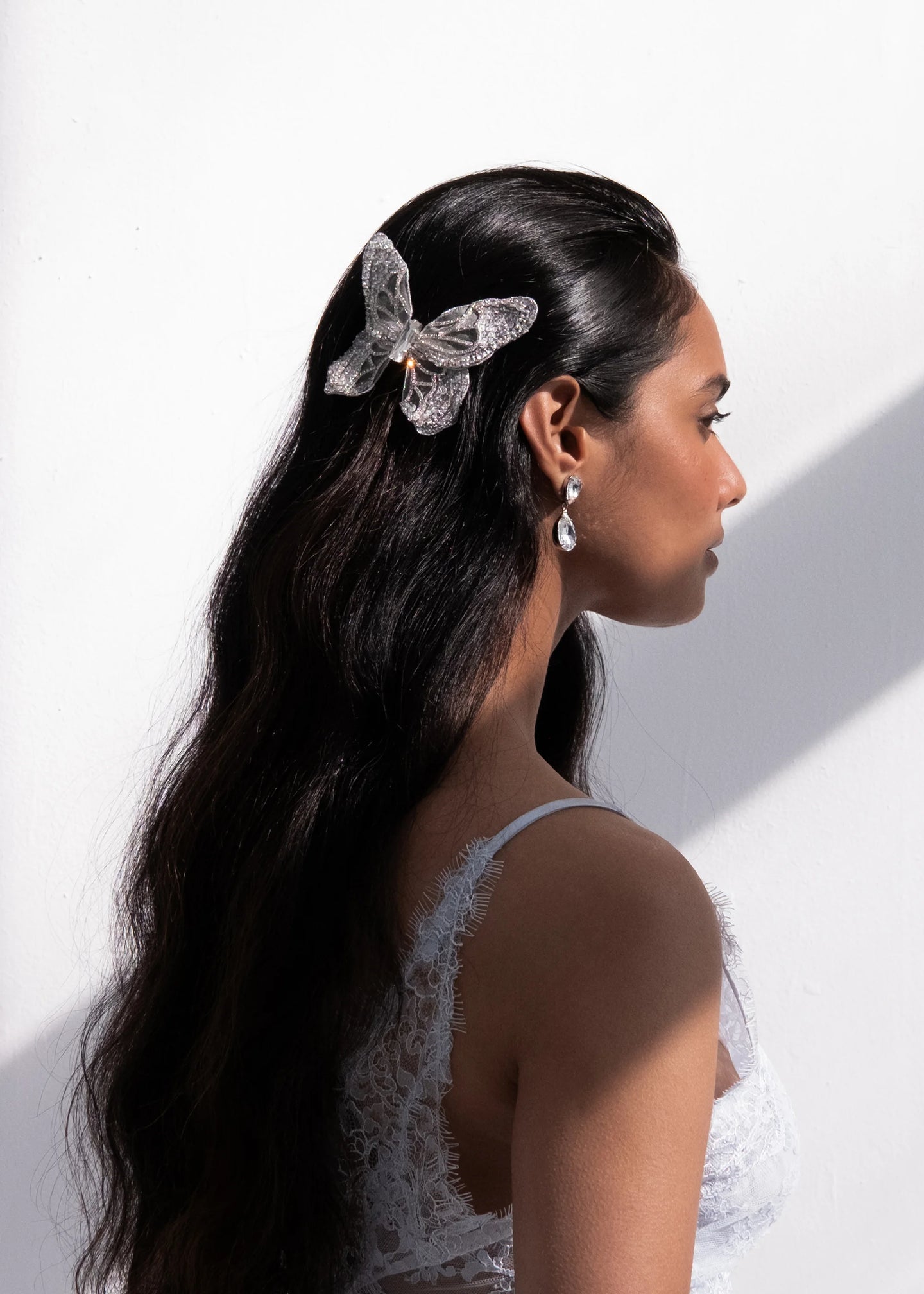 The Absolem Barrette is made by hand in New York featuring a hand-embroidered Austrian crystal butterfly with French steel flip clip closure. We recommend treating this clip as you would a piece of jewelry, and storing in the dust bag when not in use. Avoid contact with water, perfume, and other chemicals, including hairspray, which should be used before placement in the hair.