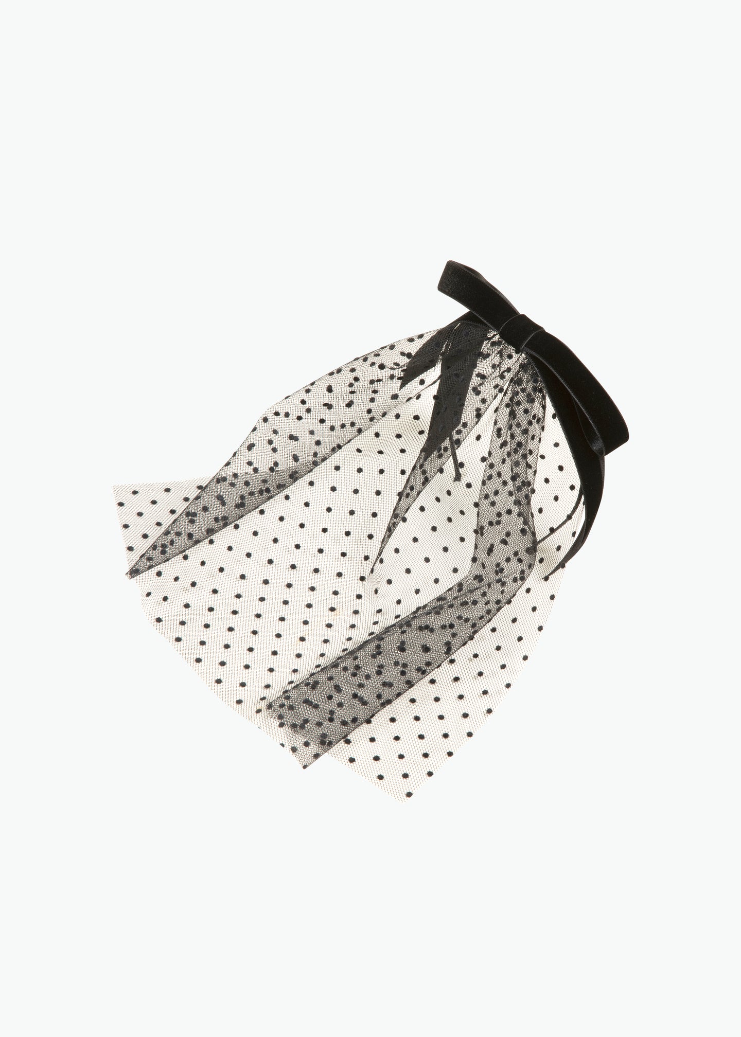Inspired by 1950s silhouettes favored by icons like Audrey Hepburn, the Gracen Voilette indulges in classic ladylike charm. It features a flocked Swiss-dot veil, fixed to a headband decked with a silk-velvet bow— the ribbon cascades exquisitely from the crown of the head. The custom-designed headband base it's perched upon is designed to disappear in the hair, allowing the details to shine.