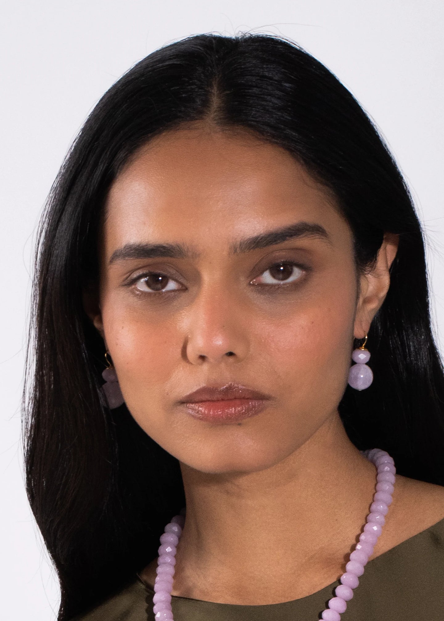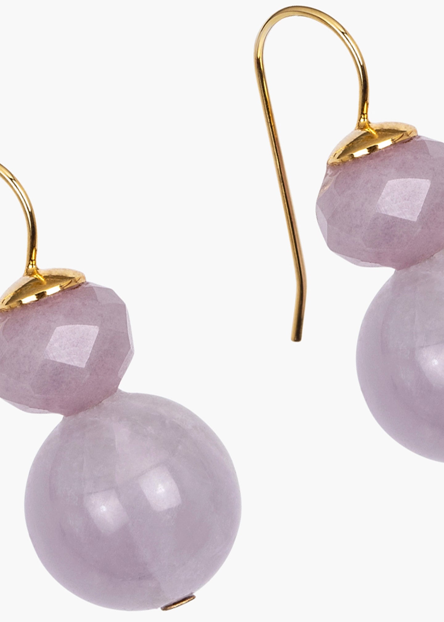 The Jaycee Earrings are made by hand in New York from 18K gold plated brass and semi-precious lilac jadeite jade. All stones have natural variances in color and markings that make each one unique. They have a gold-filled ear wire post, are nickel-free, and safe for sensitive skin. We recommend storing earrings in their dust bag while not in use, and avoiding contact with water, perfume, hairspray, and other chemicals.