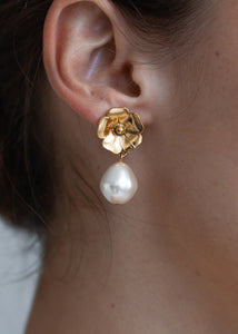 A classic marriage of gold and pearl details, the Luiza Earrings will take you anywhere. The flower's concave shape brings boosts of shine across its surface, and suggests a kinetic energy, like a petal being carried by the wind. The pearl drop contributes fluid movement to this classic drop earring.