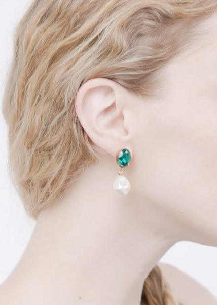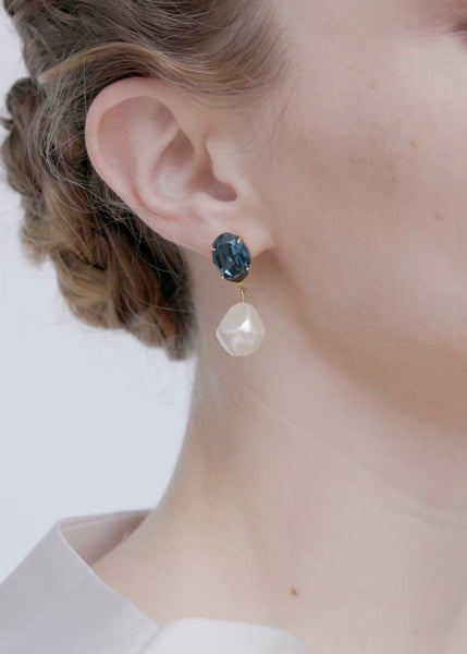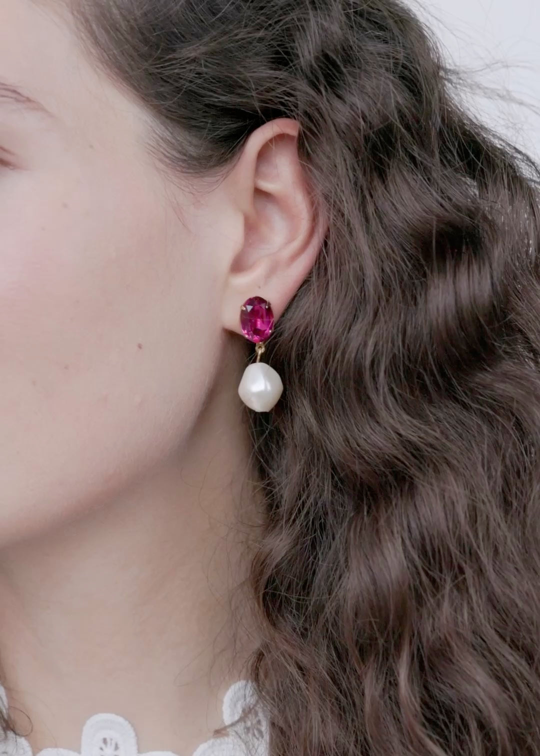 The Tunis Earring is a post earring with a surgical-steel post. Our earrings are nickel-free and safe for sensitive skin. This earring is crafted in New York from 18K gold plated brass, glass crystals, and glass pearl. We recommend storing earrings in their dust bag while not in use, and avoiding contact with water, perfume, hairspray, and other chemicals.