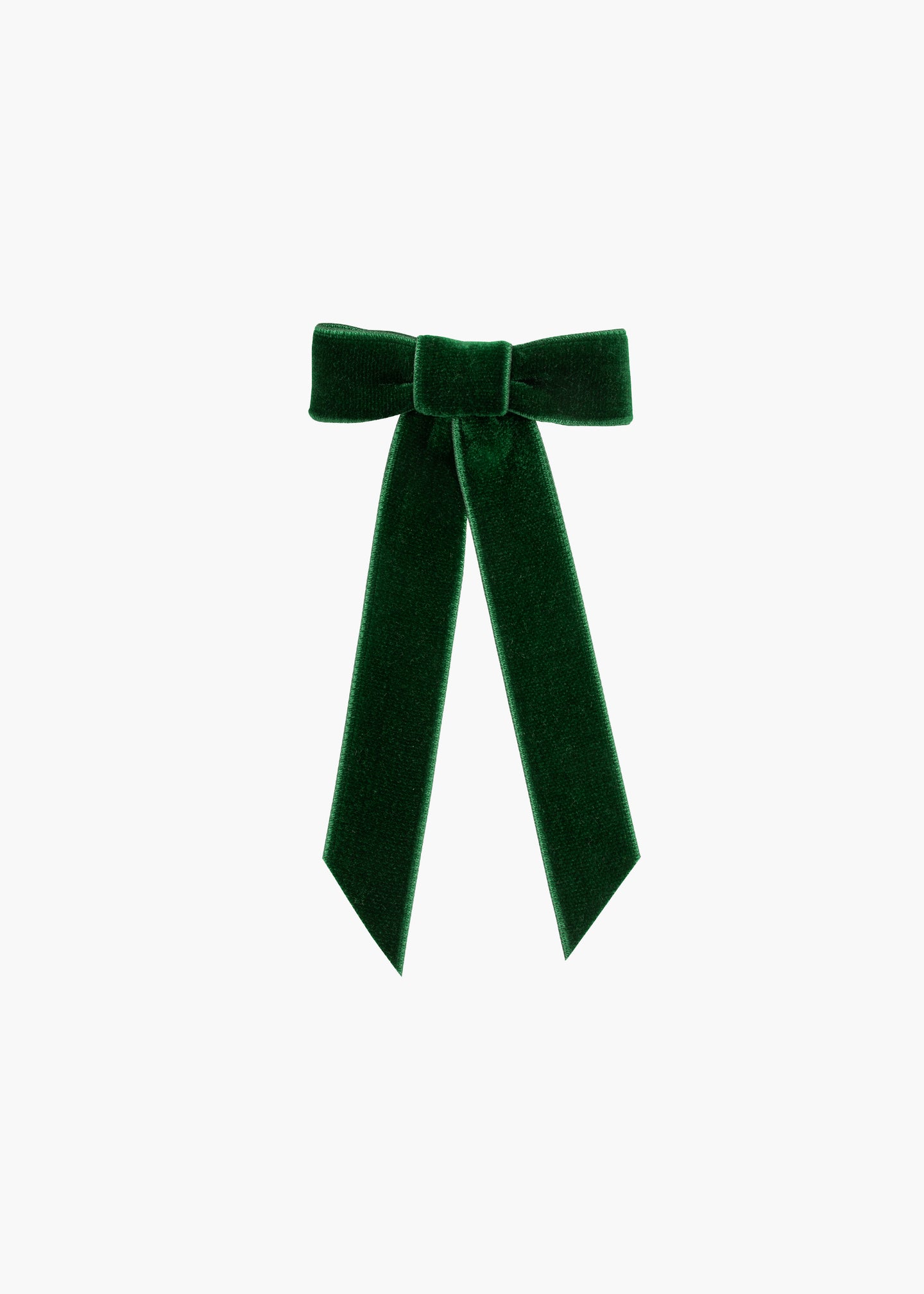 The Velvet Bow Barrette is made by hand in New York of velvet ribbon with a steel French barrette closure. We recommend treating this bow as you would a piece of jewelry, and storing in the dust bag when not in use. Avoid contact with water, perfume, and other chemicals, including hairspray, which should be used before placement in the hair.