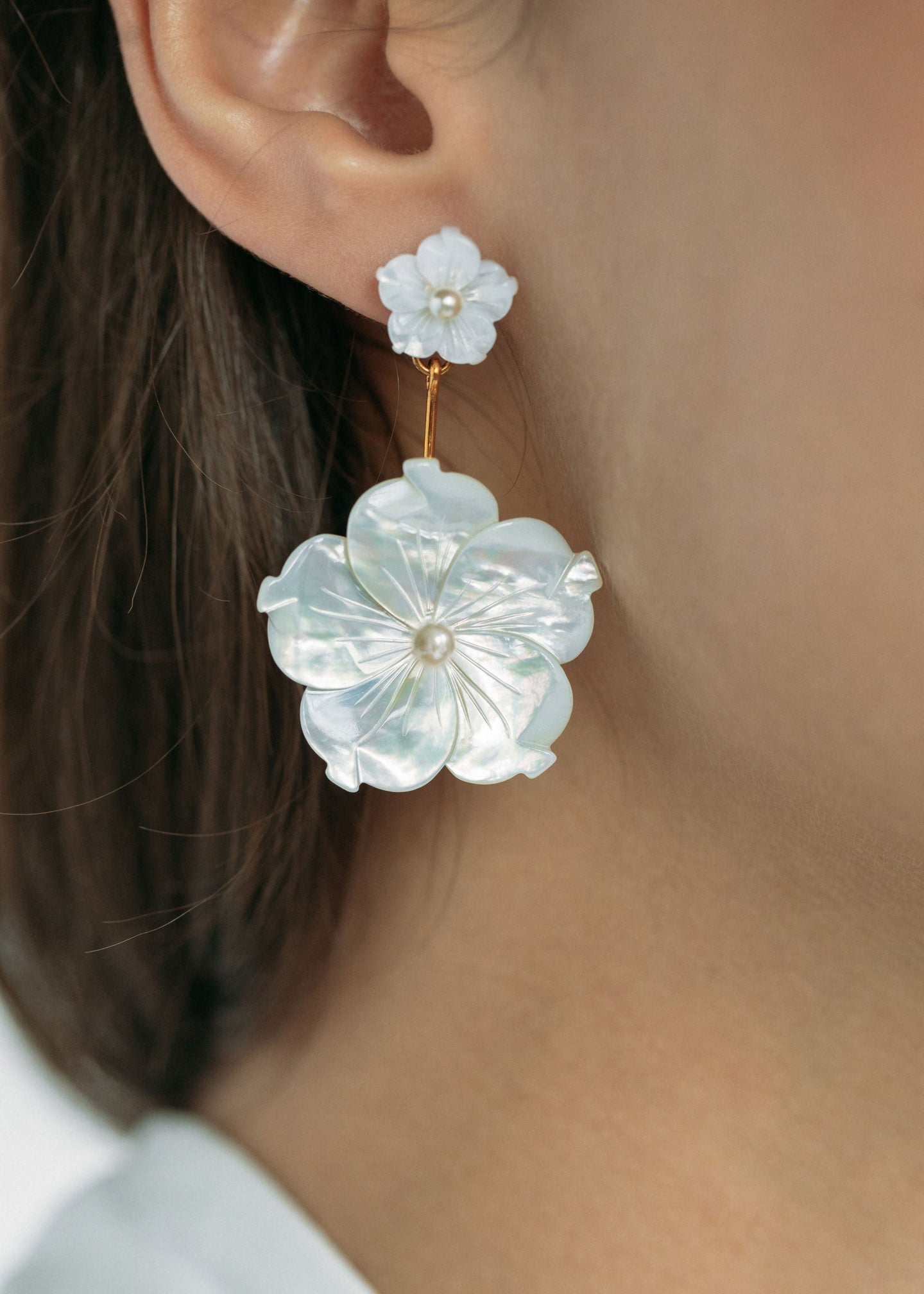 It's highly possible that we just made the perfect earring. The Zinnia Earring is a handmade, elegant drop, consisting of two intricately carved mother of pearl flowers, with a smaller pearl center. We love mother of pearl for its magical iridescence, which casts a flattering glow on everything it encounters. Dimensions: Weight: 6g each